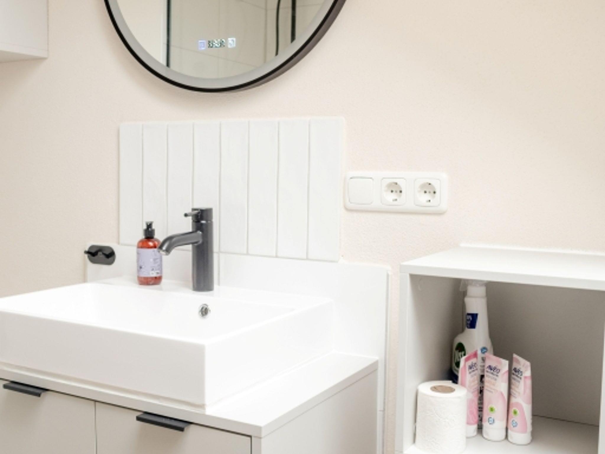 Das Bad ist mit Dusche, Waschmaschine und allen notwendigen Annehmlichkeiten ausgestattet.