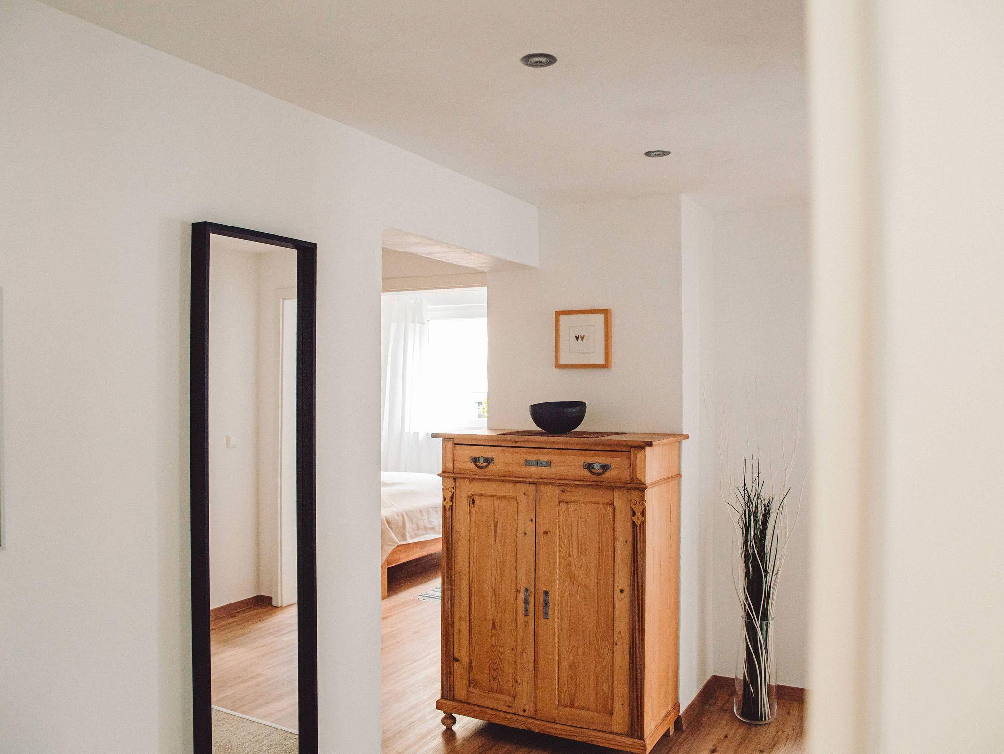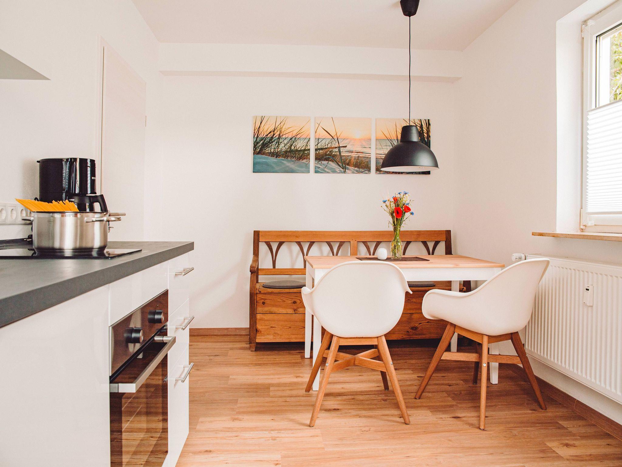 Die Ferienwohnung Eyka befindet sich mit ca. 65 m² im Erdgeschoss und besteht aus einer hellen Wohnküche, einem großzügigem Flur, einem Schlafzimmer und einem Bad. Sie bietet Platz für 4 Personen.