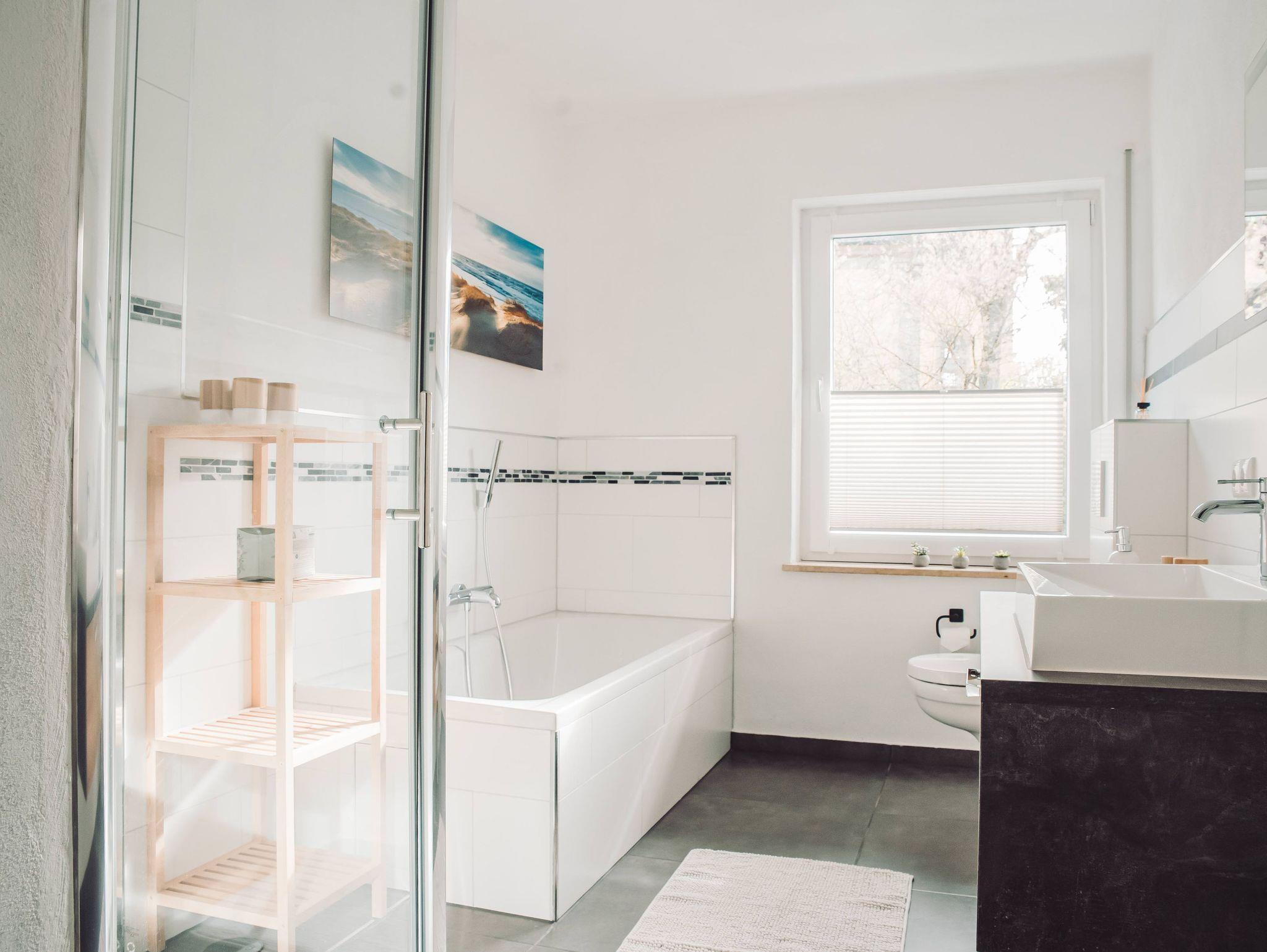 Das Badezimmer besitzt eine flach begehbare Dusche, eine Badewanne, eine Fußbodenheizung, einen Heizkörperhandtuchhalter, ein WC, ein Waschbecken, ein Fenster und einen Föhn.