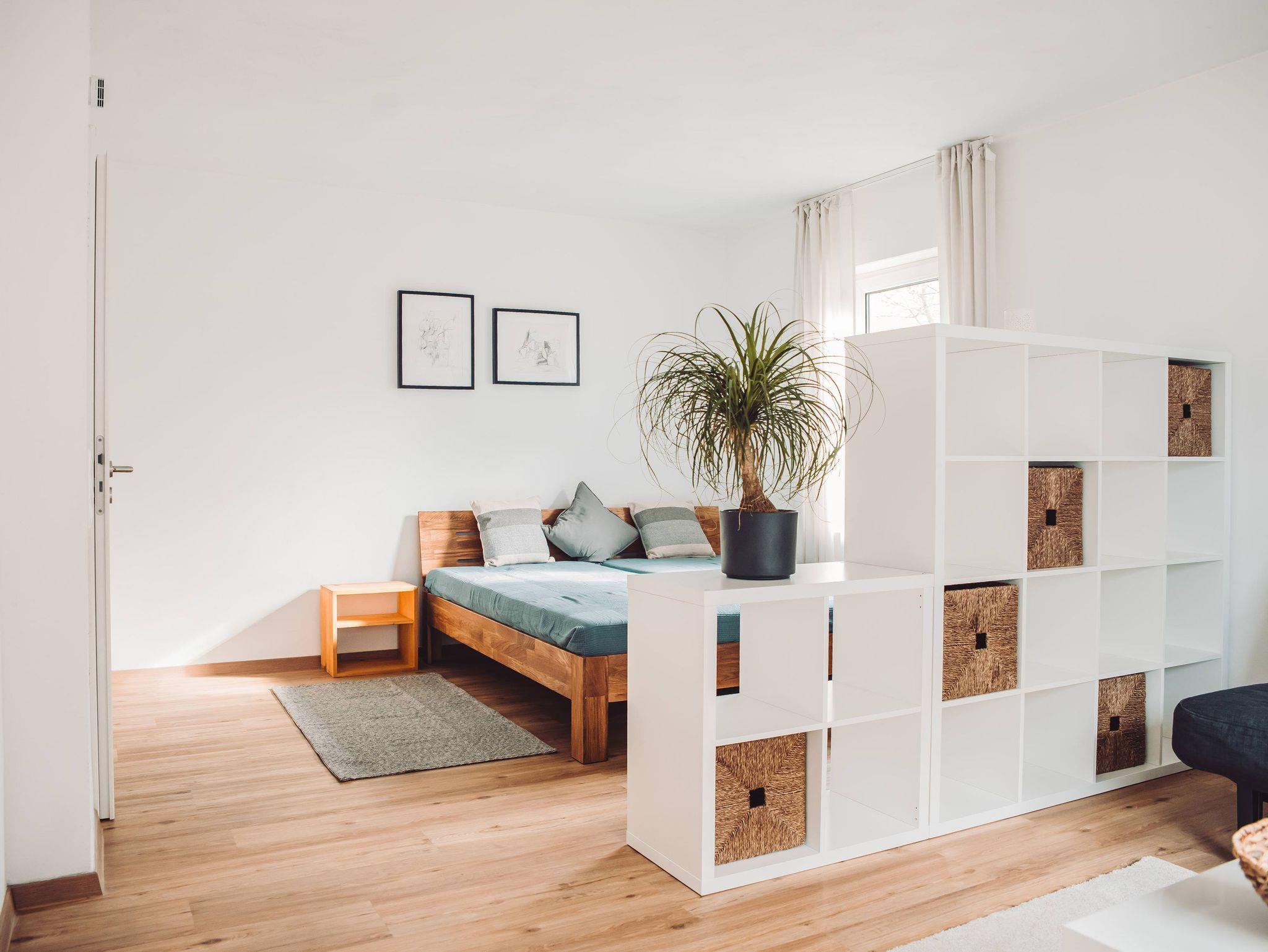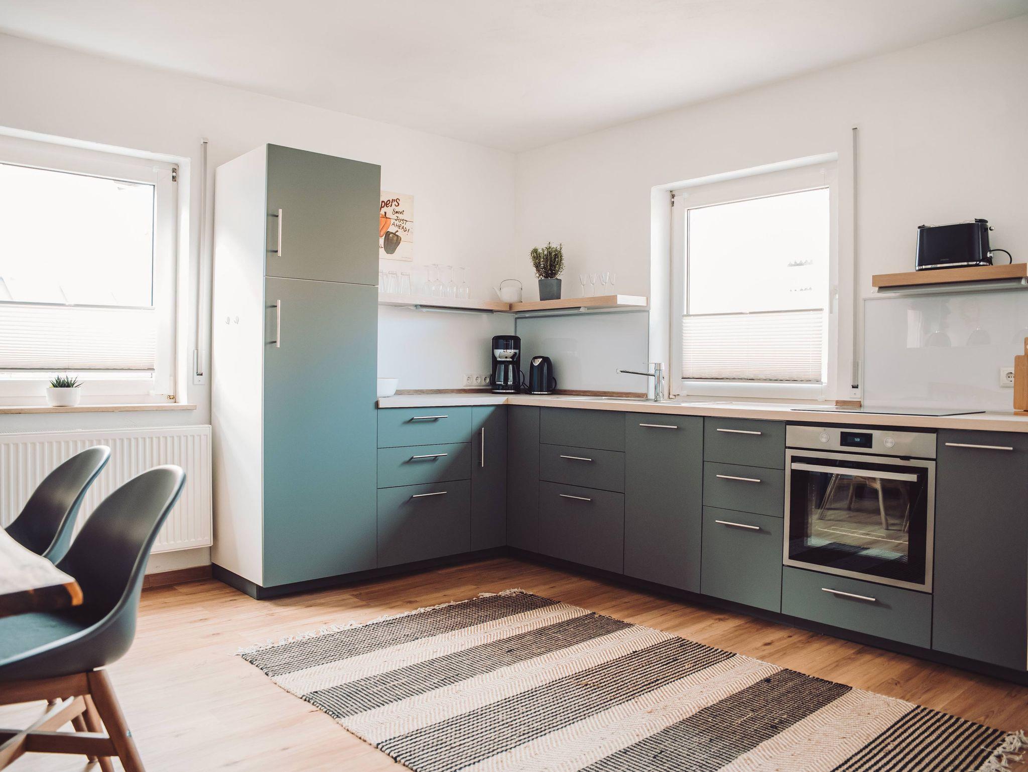 Die großzügig helle Küche beinhaltet einen großen Kühlschrank inkl. Gefrierfach, einen Induktionsherd mit Backröhre, eine Spülmaschine, eine Kaffeemaschine, einen Toaster sowie Wasserkocher. Das Wohnschlafzimmer ist mit einen gemütlichen Aufenthaltsbereich mit Couch und Fernseher ausgestattet. Eine offenes Regal unterteilt den großzügigen Raum und bietet zwei weitere Schlafmöglichkeiten.