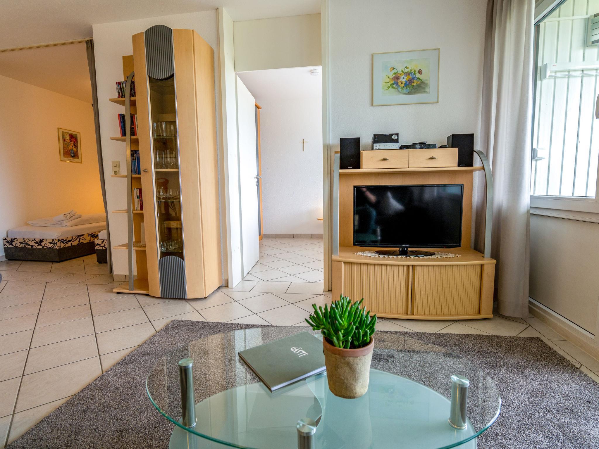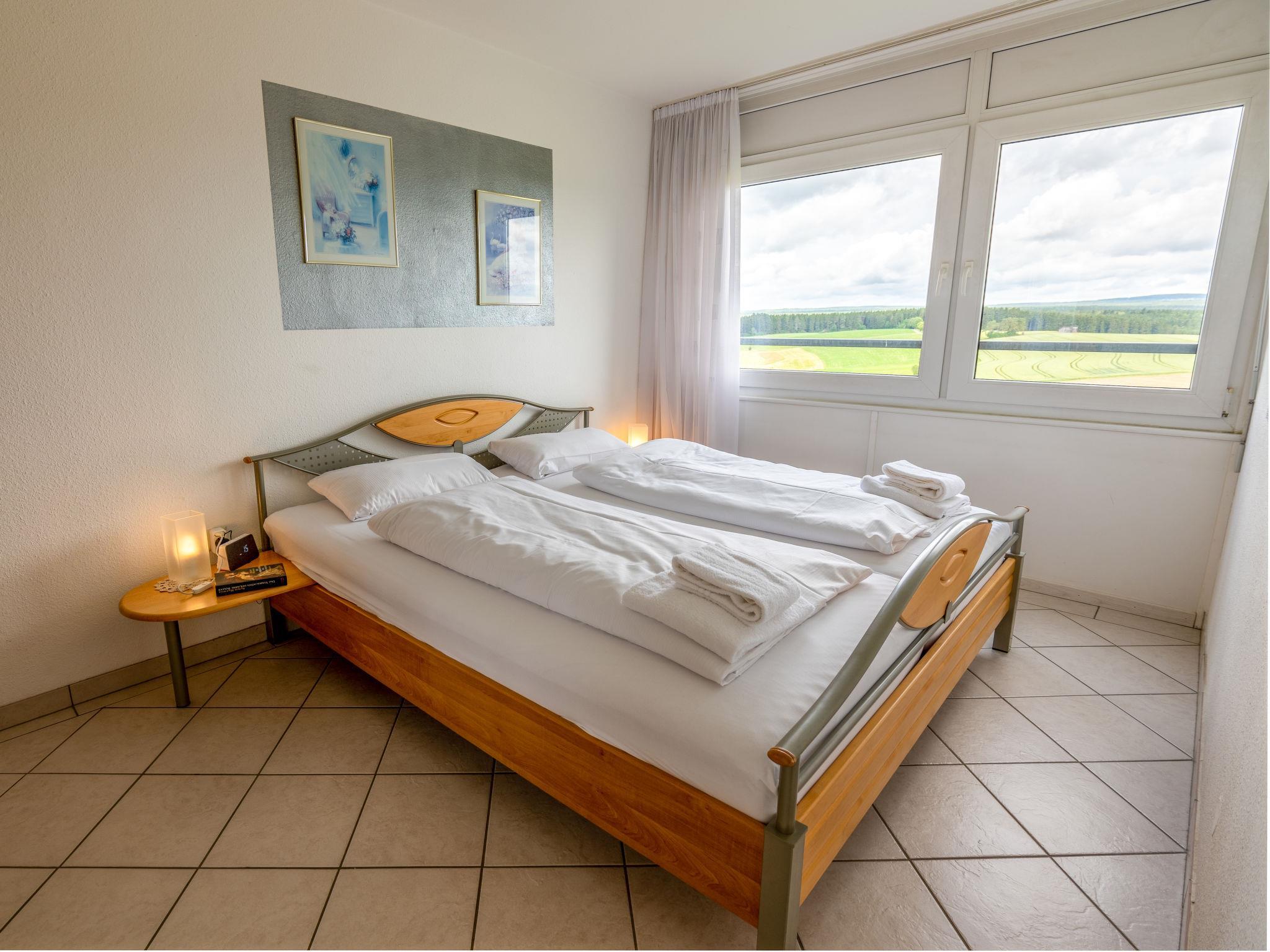 "Schönblick (F 55)", 2-room apartment 54 m2 on 4th floor. Beautiful and cosy furnishings: living/dining room with satellite TV (flat screen), radio, CD-player and DVD. Alcove with curtain with 2 beds (80 cm, length 200 cm). 1 room with 1 double bed (2 x 90 cm, length 200 cm). Kitchenette (4 hot plates, oven, toaster, kettle, microwave, electric coffee machine). Shower/WC. Balcony. Balcony furniture. Beautiful view of the mountains, the countryside and the forest. Facilities: telephone, children's high chair, hair dryer. Internet (WiFi, free). Garage (extra). Please note: non-smokers only. The balcony is glazed. Bookings accepted for holiday purposes only. Instead of an enclosed bedroom, some sleeping areas are located in an open-plan area (gallery, alcove, etc.).