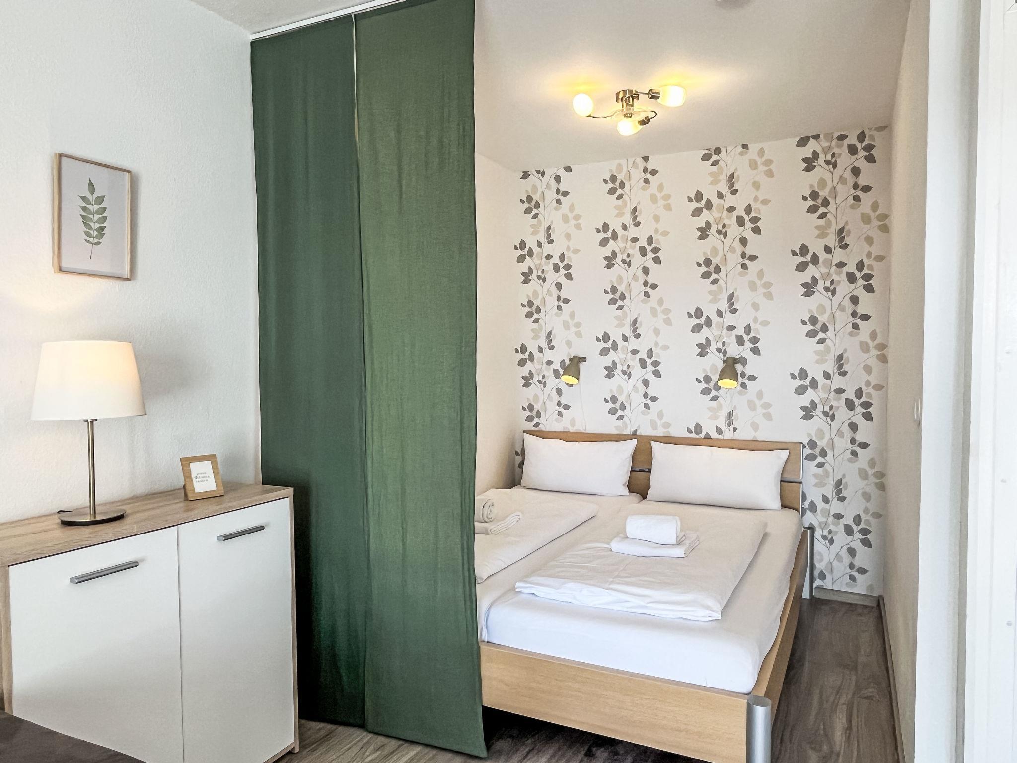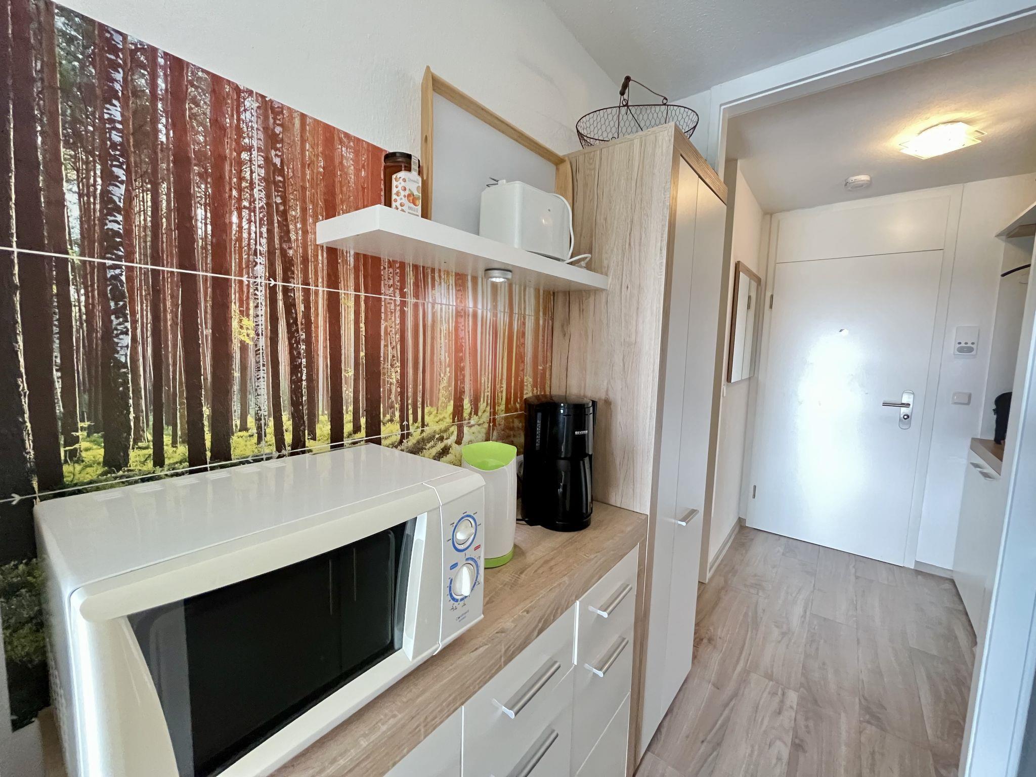 "Wald und Wiese (B 94)", 1-room apartment 39 m2 on 2nd floor. Modern and tasteful furnishings: living/dining room with 1 sofabed (140 cm, length 200 cm), satellite TV (flat screen), radio. Alcove with curtain with 1 double bed (160 cm, length 200 cm). Kitchenette (2 hot plates, mini-oven, toaster, kettle, microwave, electric coffee machine). Shower/WC. Balcony. Balcony furniture. Facilities: children's high chair (extra), hair dryer. Internet (WiFi, free). Parking (1 car). Please note: non-smokers only. The balcony is glazed. LÖFFINGEN BETRIEBS-NR. 07469