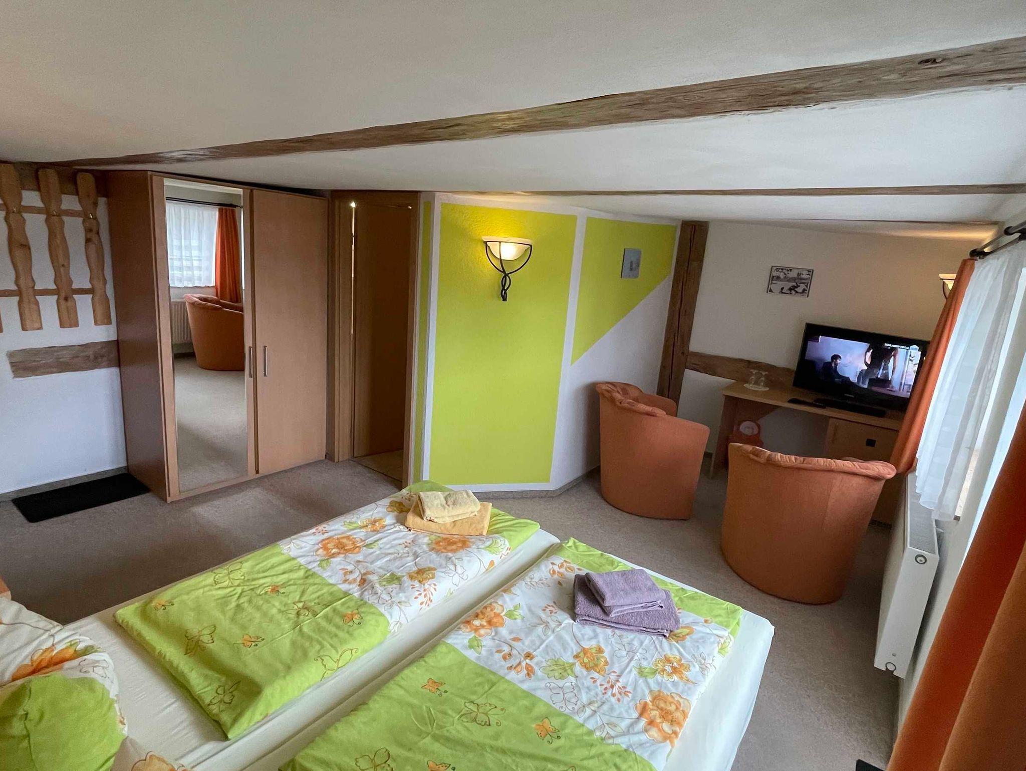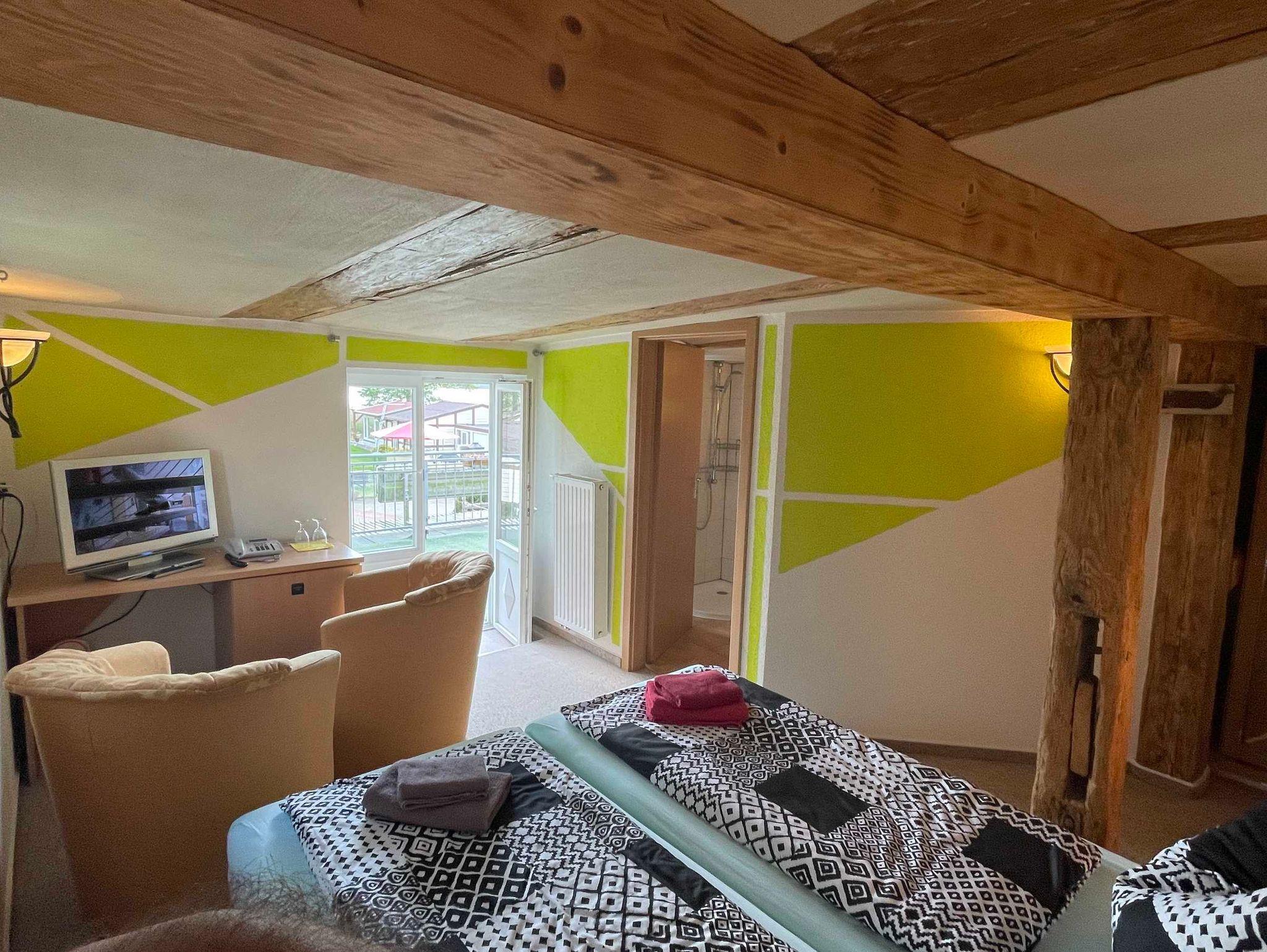 DZ mit großer Dachterrasse, Blick auf den Dobbertiner See und dem historischen Park, mit Doppelbett.
