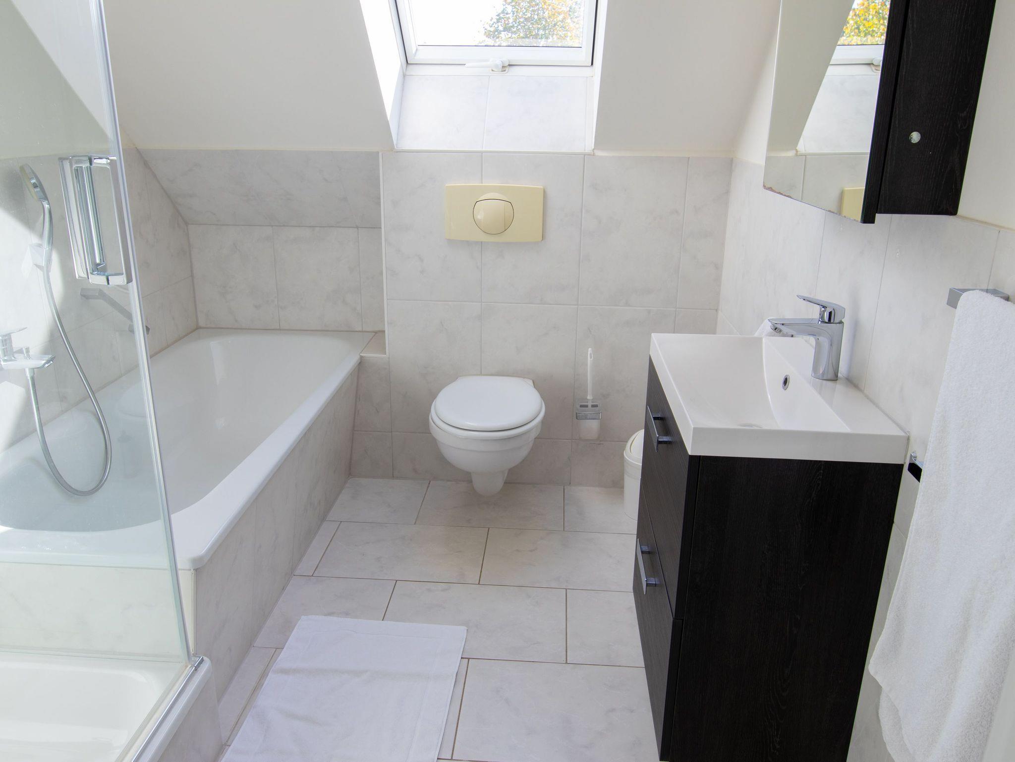 Ein praktisches Gäste-WC im Erdgeschoss sorgt dafür, dass es morgens keinen Stau im Badezimmer gibt ? besonders nützlich, wenn die ganze Familie unterwegs ist. Im Obergeschoss findest du zwei gemütliche Schlafzimmer, beide mit komfortablen Doppelbetten (180x200) und ausreichend Stauraum in den Kleiderschränken. Das großzügige Bad ist mit einer Dusche und einer Badewanne ausgestattet und bietet dir die Möglichkeit, nach einem ereignisreichen Tag mit den Kindern zu entspannen. Draußen auf der Terrasse könnt ihr gemeinsam frühstücken oder den Tag bei einem gemütlichen Grillabend ausklingen lassen ? einen Grill kannst du dir vor Ort ausleihen. Auch dein vierbeiniger Freund ist hier herzlich willkommen, sodass die ganze Familie den Urlaub in vollen Zügen genießen kann!
