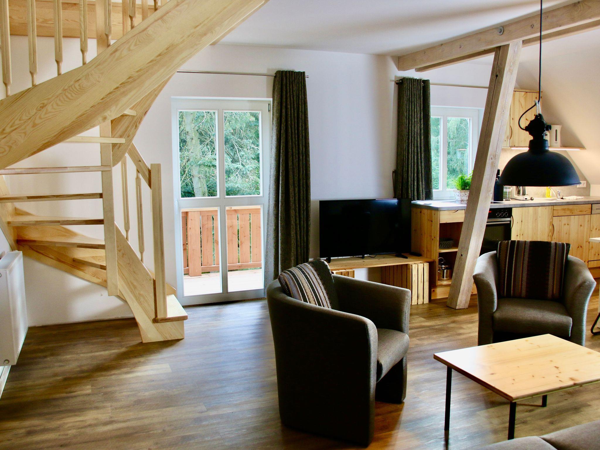 Ein besonderes Highlight ist unsere minimalistisch und charmant eingerichtete Atelier-Wohnung (25 m²) im Dachgeschoss des ehemaligen Pumpenhauses. Sie bietet Paaren einen idealen Rückzugsort mitten in einer seenreichen Landschaft.