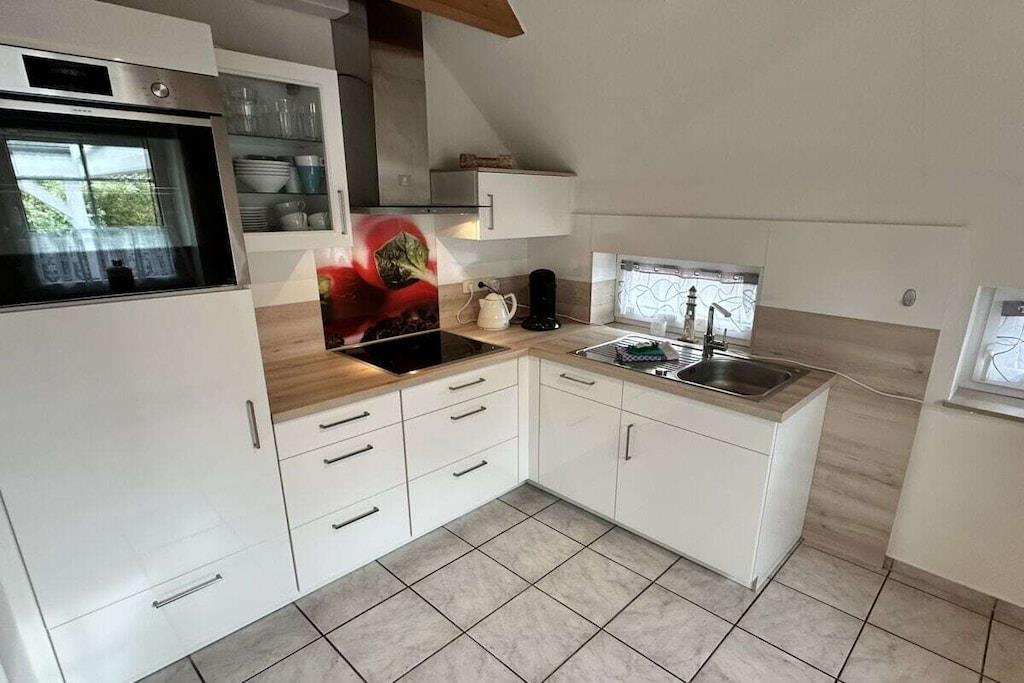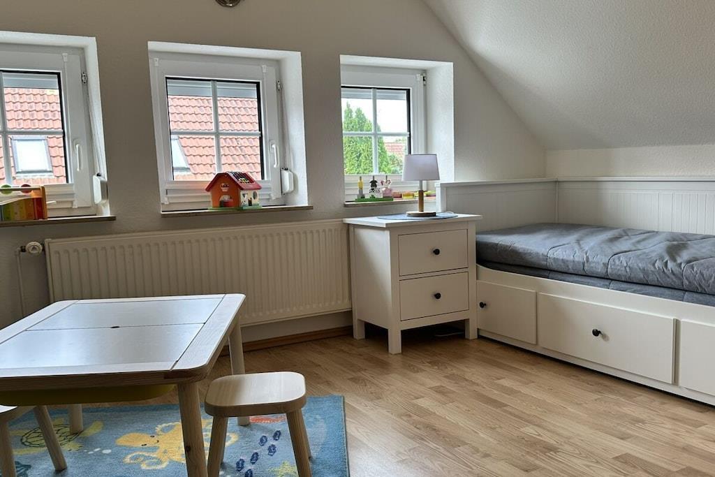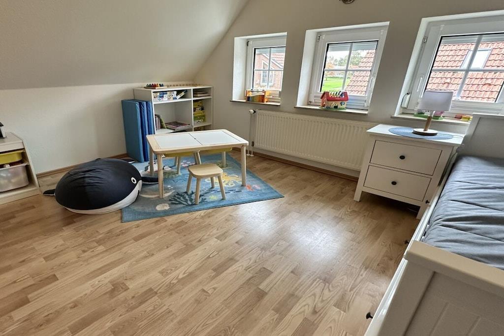 Tilbring en dejlig ferie i vores helt nyindrettede feriehus. Det er et af de få fritliggende feriehuse i Neßmersiel, kun få minutter på cykel (eller til fods) fra stranden. Ideelt for børnefamilier. Hunde er også velkomne. I vores hus finder du alle de faciliteter, du forventer af en ferie. En hyggelig stue med komfortable siddepladser til hele familien, adskillige spil for alle aldre, et tv med streamingtjenester og meget mere. Du finder et fuldt udstyret køkken med keramisk kogeplade, moderne ovn, køle-/fryseskab, mikrobølgeovn, induktionskogeplade, køkken- og bageredskaber samt nok tallerkener og bestik til alle. Vi tilbyder et originalt østfrisisk tesæt til den østfrisiske teceremoni. Sov i nye, komfortable senge. I stueetagen inviterer en boxmadras af høj kvalitet til afslappende nætter, mens der ovenpå er to soveværelser med dobbeltsenge. Det ene af de to værelser er kærligt omdannet til et børneværelse med masser af spil. Derudover finder du i stueetagen et moderne badeværelse med regnbruser og gulvvarme samt et separat gæstetoilet. Haven er fuldt indhegnet, så I kan lade børnene lege i haven uden bekymringer, og familiens hund slipper ikke væk. En stor legeplads ligger kun få meter fra huset. Lige bagved ligger et Edeka-supermarked, der er åbent dagligt fra marts til oktober. Derudover finder I en mobil brødleveringsservice hver morgen hele året rundt. Restauranter ligger også inden for gåafstand. I kan lade jeres bil blive hjemme og oplade den ved vores elbil-ladestation til jeres hjemrejse til fordelagtige priser. Velkommen til jeres ferie ved havet i vores private hus! Ekstraudstyr: Sengelinned: EURO10 pr. gæst/ophold Håndklæder: EURO10 pr. gæst/ophold Begge dele betales på stedet Dornum kommune opkræver et turistgebyr, som skal betales på stedet. Dette beløb varierer afhængigt af sæsonen. Der gælder særlige betingelser for personer med handicap.