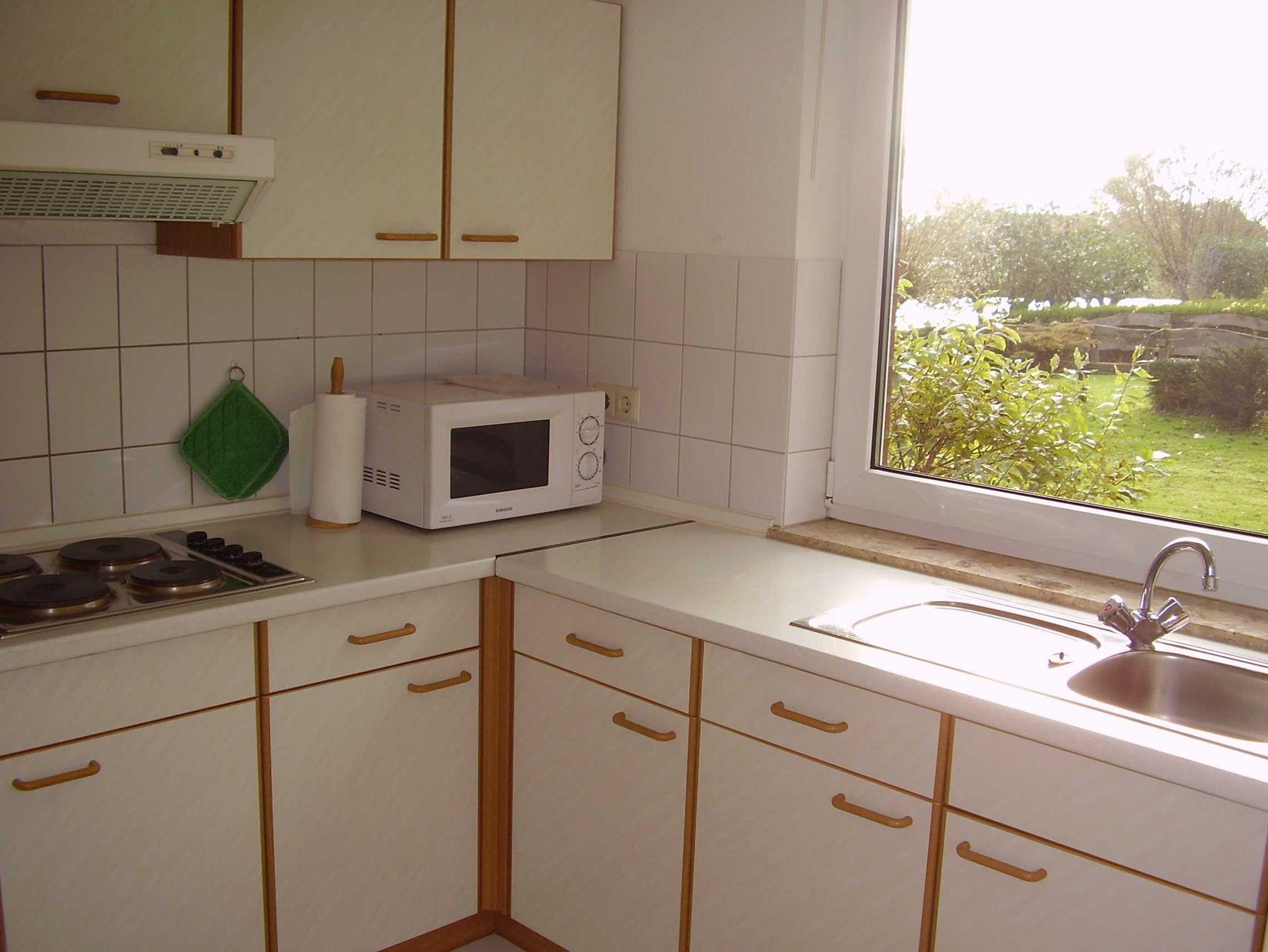 Separate Küche mit Einbauküche mit Kühlschrank mit Gefrierfach, 4-Platten-Elektroherd, Mikrowelle und allen erforderlichen Elektrogeräten.