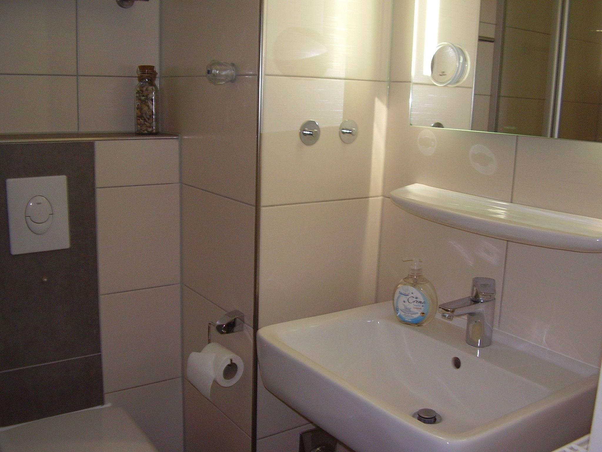 Modernes Badezimmer mit Dusche, Hänge-WC und Waschmaschine.