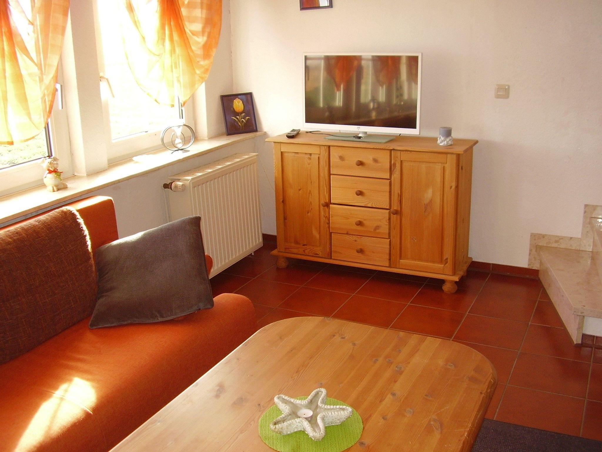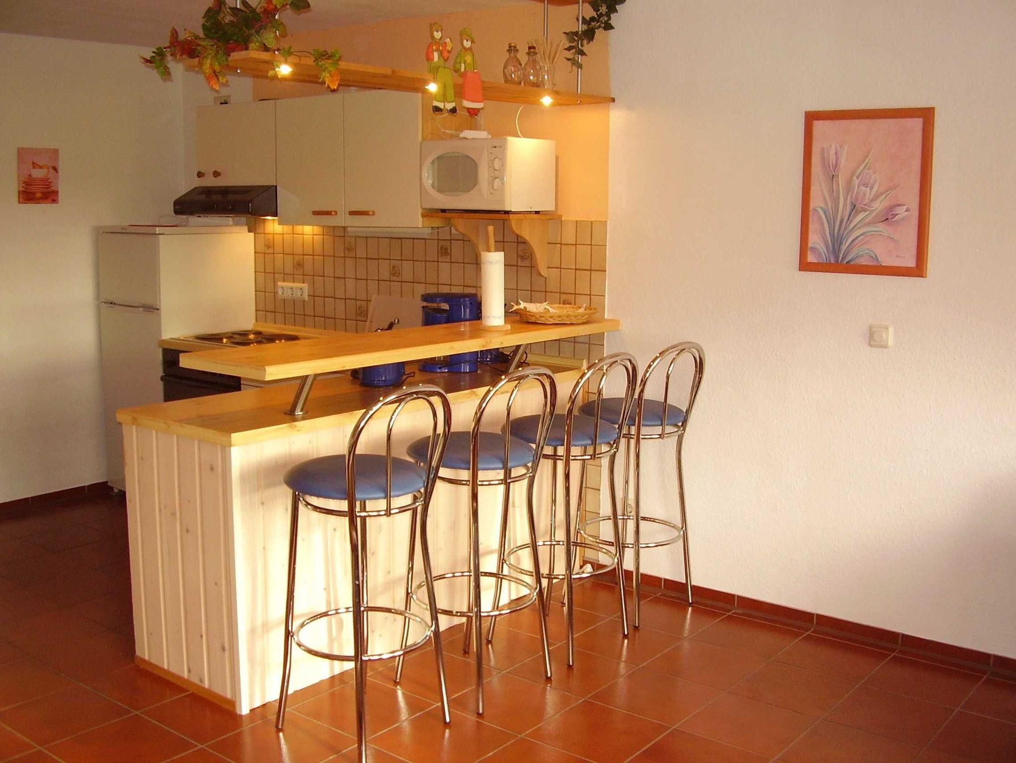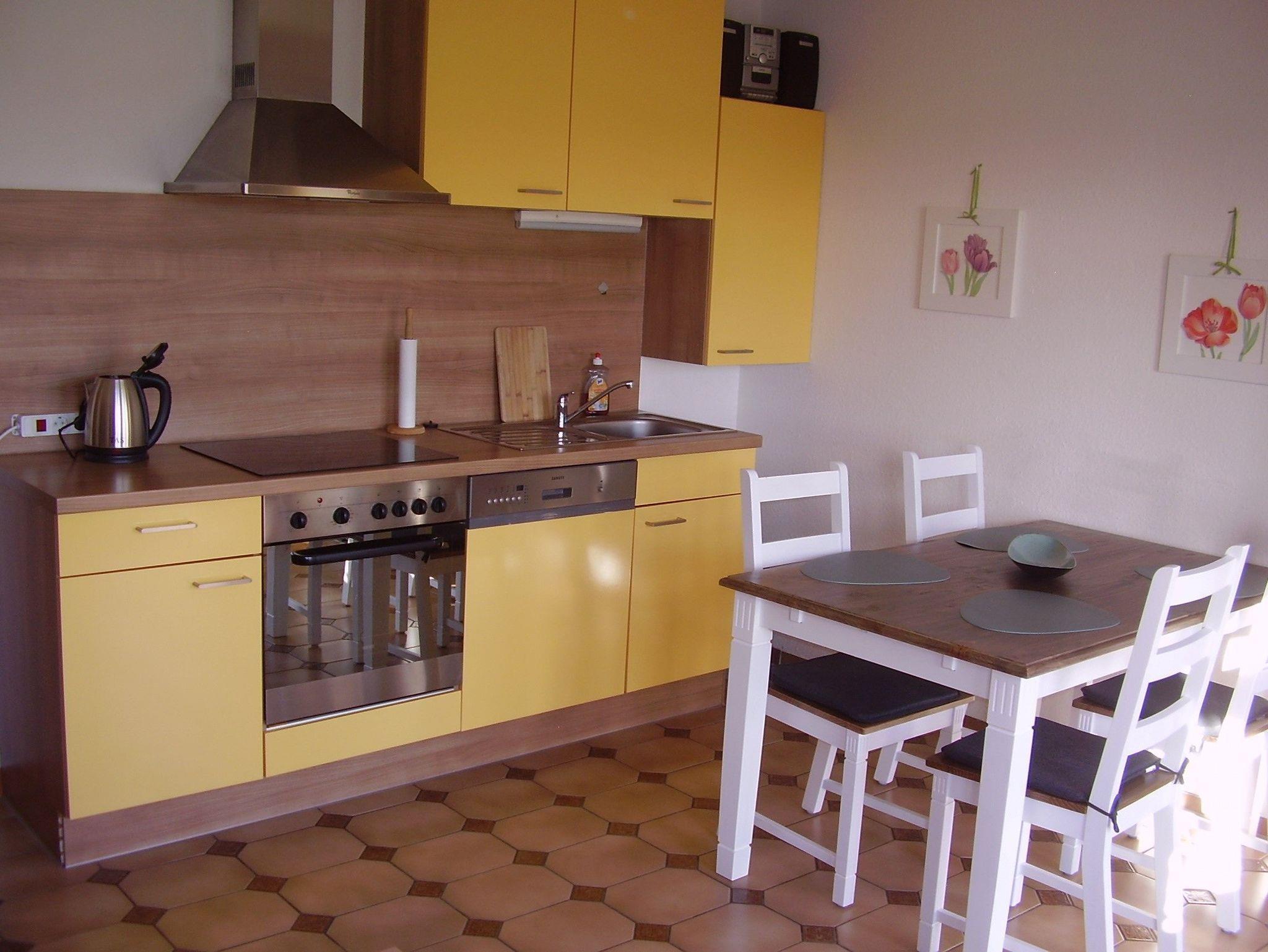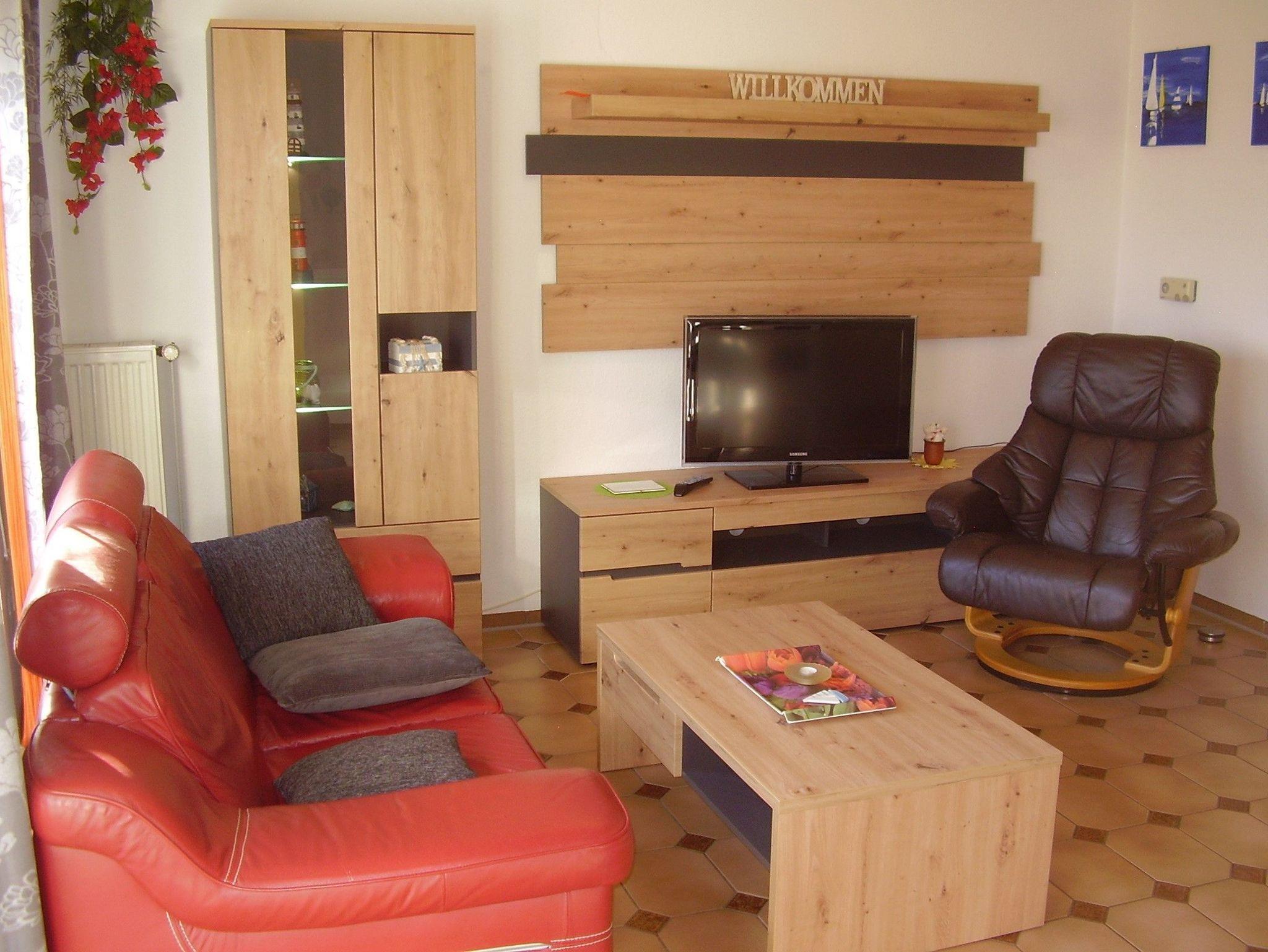 Gemütliches Wohn- und Esszimmer mit Sitzgruppe und Flachbild-TV, EBK mit Esstheke, Geschirrspülmaschine, VierPlattenHerd mit Backofen, Kühl- und Gefrierkombination, Mikrowelle und allen erforderlichen Elektrogeräten.