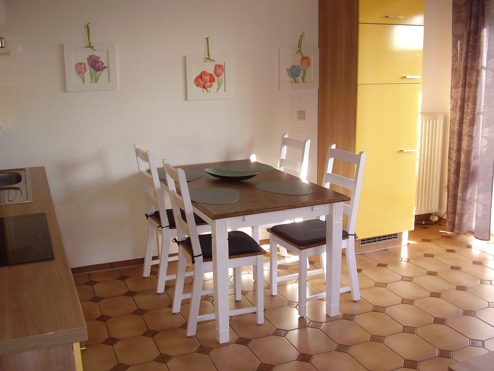 Freundliches Wohn- und Esszimmer mit Fussbodenheizung, Sitzgarnitur und Flachbild-TV, Esstisch mit Bestuhlung, Einbauküche mit 4 PlattenHerd mit Ceranfeld und Backofen, Kühl- und Gefrierkombination, Geschirrspülmaschine und allen erforderlichen Elektrogeräten.