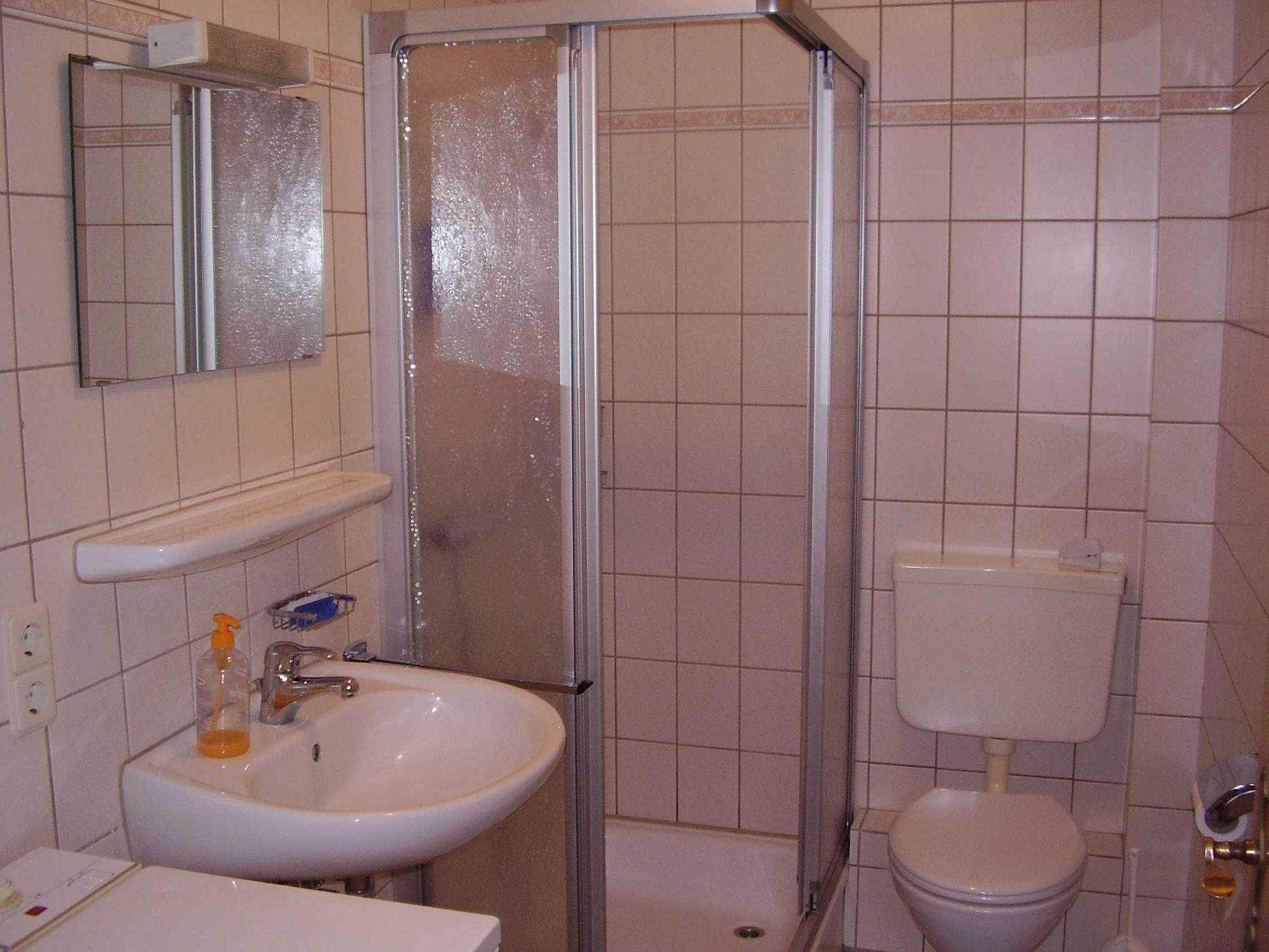 Badezimmer mit Dusche, WC und Waschmaschine.