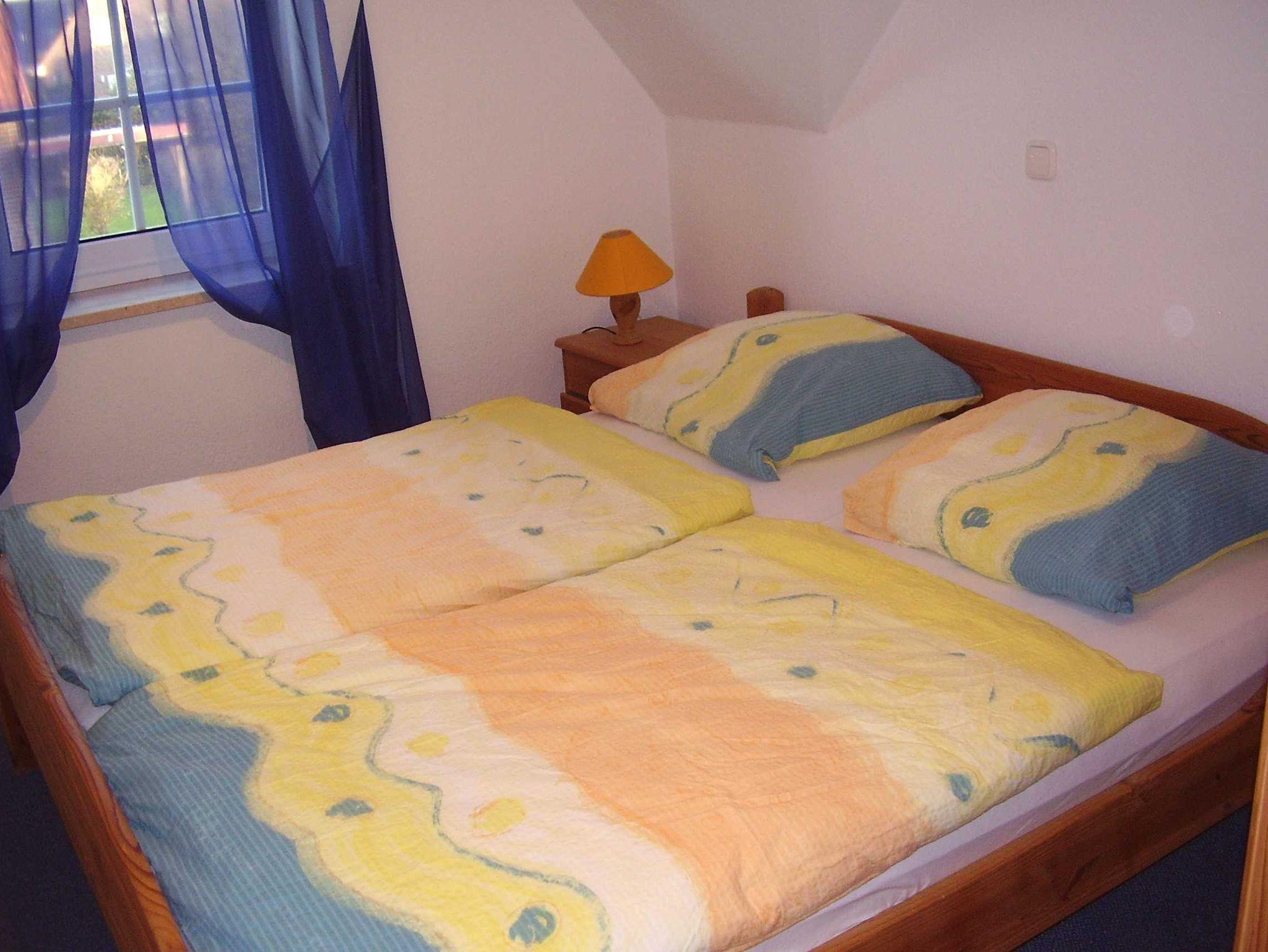 Ein Schlafzimmer mit Doppelbett. Babyreisebett steht zur Verfügung.