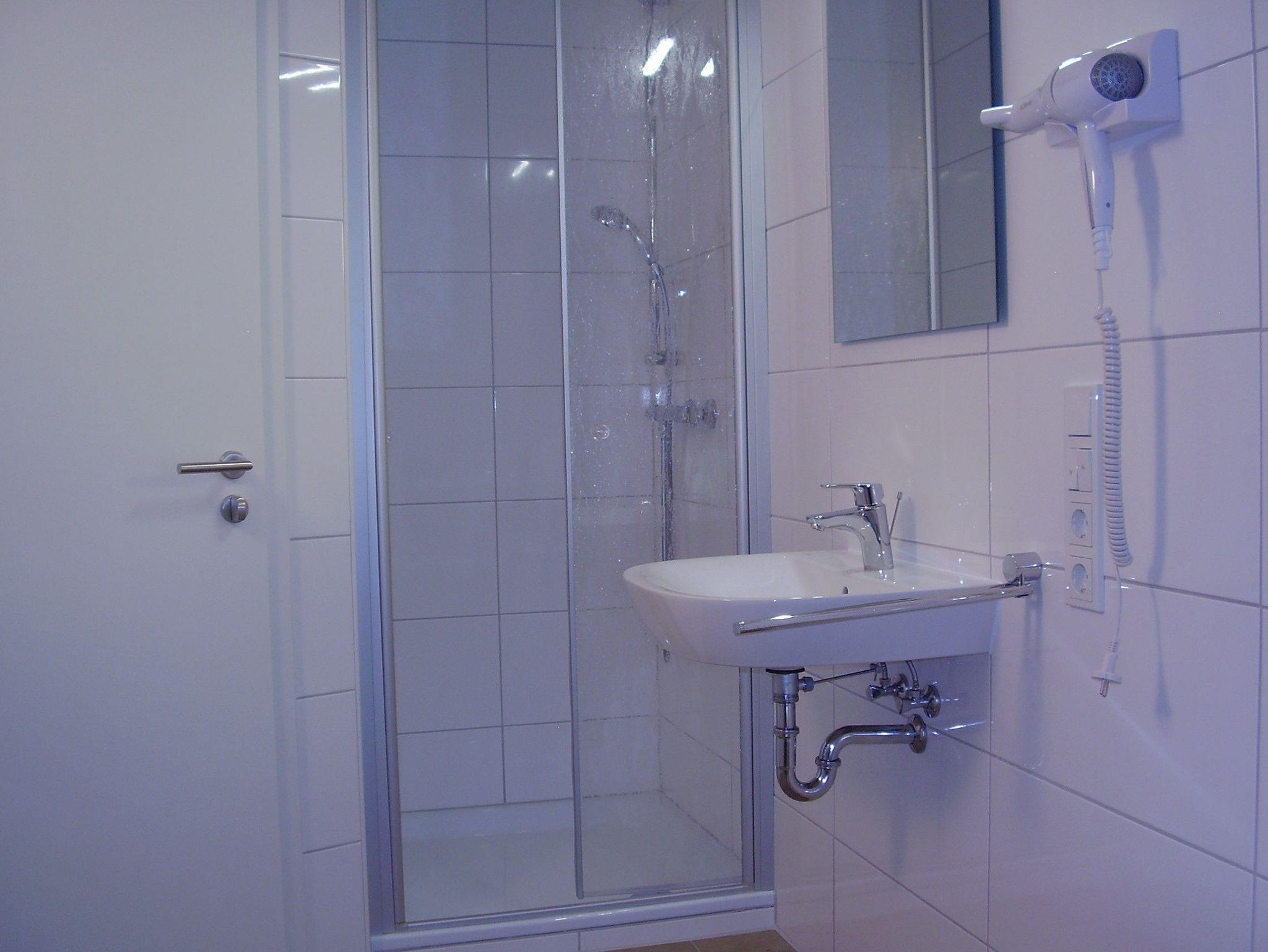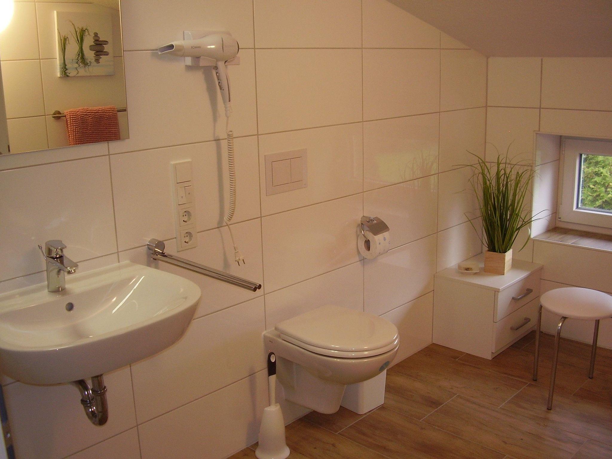 Tageslicht-Badezimmer mit grosser Dusche und Hänge-WC.