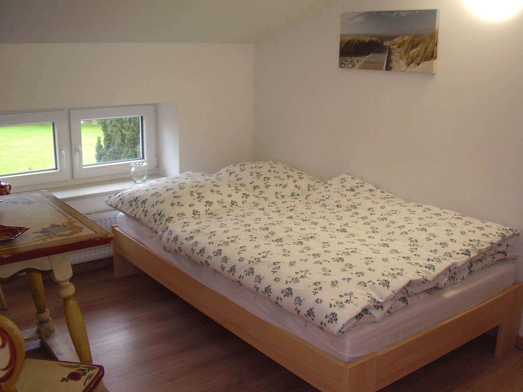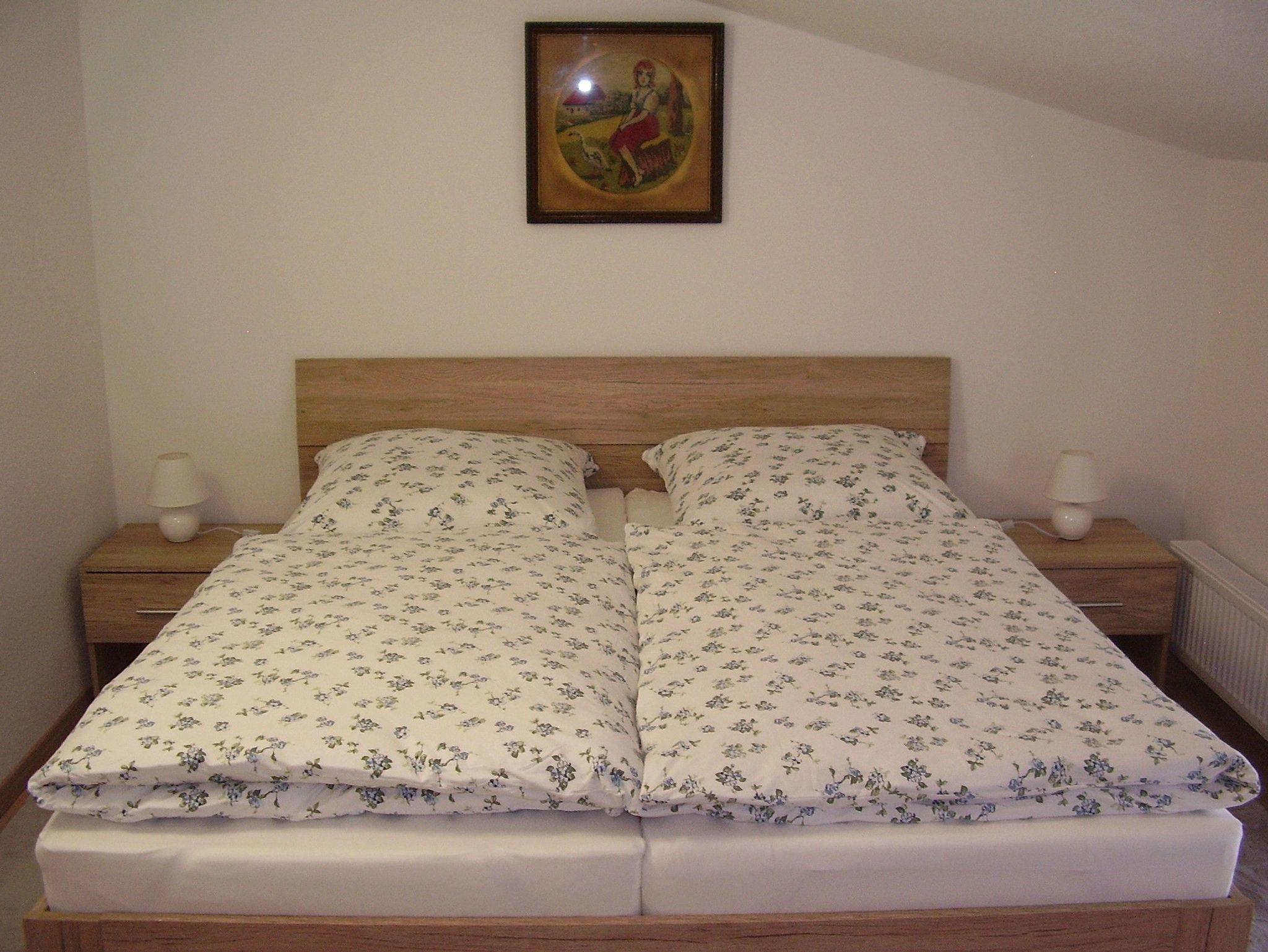 Obergeschoss: Zwei Schlafzimmer jeweils mit Doppelbett; einmal Ehebett, einmal Futonbett