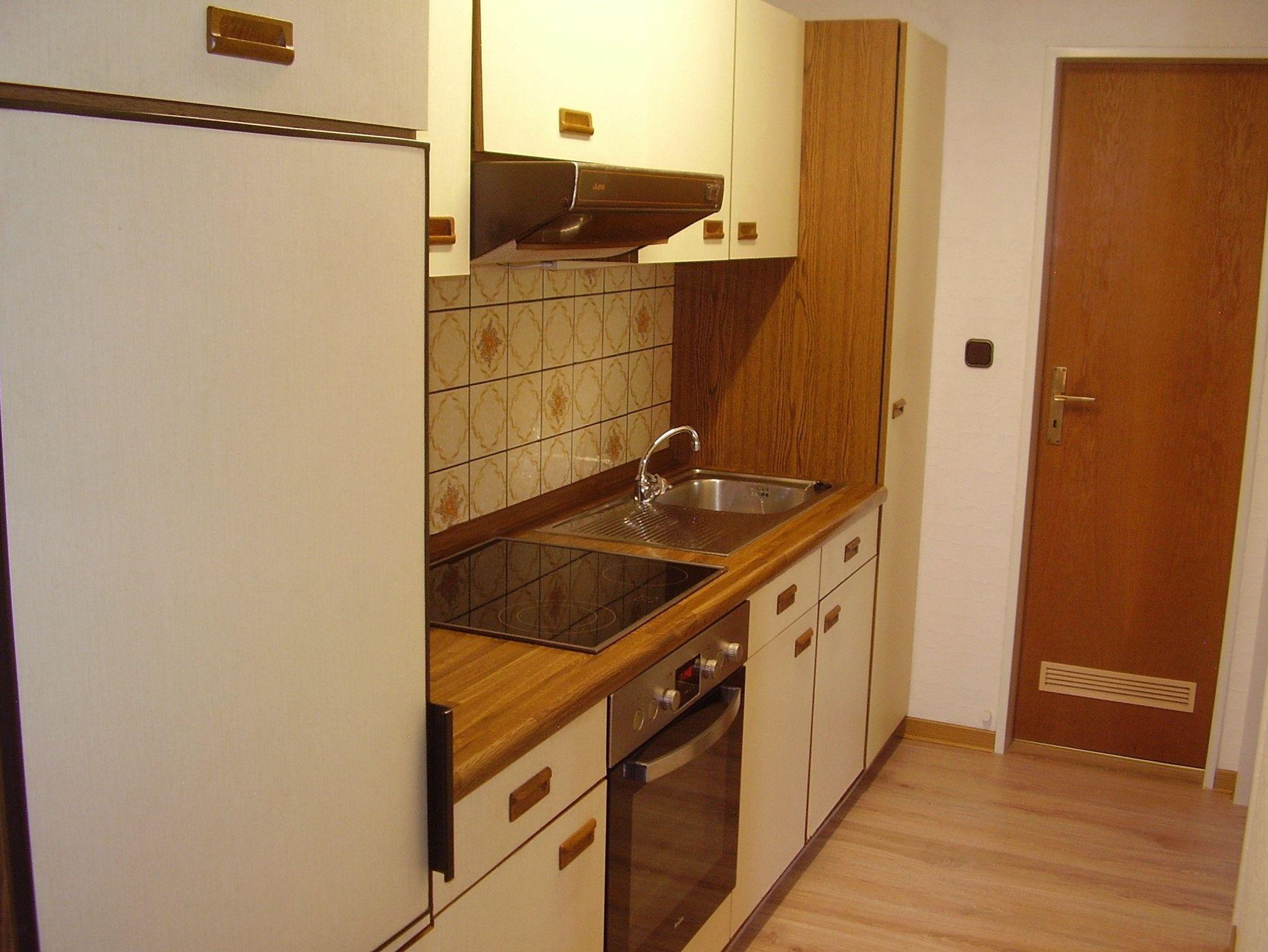 Separate Einbauküche mit 4-Plattenherd mit Ceranfeld und Backofen, Kühlschrank mit Gefrierfach, ausreichend Töpfen, Pfannen, Bestecke und Geschirr, etc..