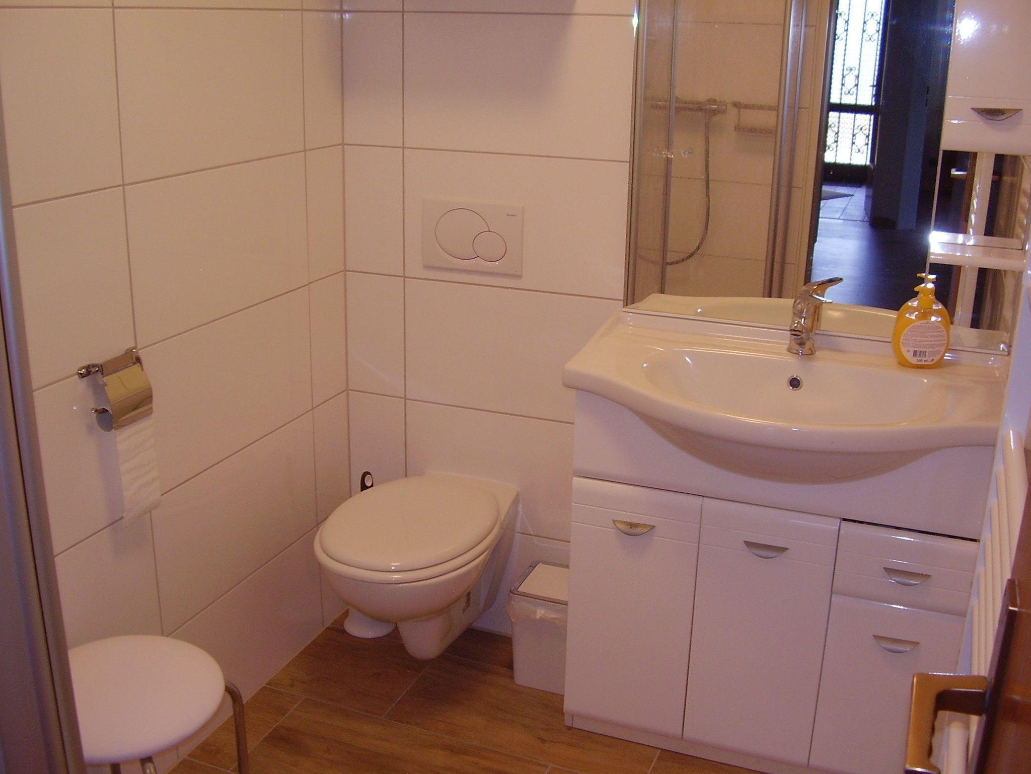 Modernes Badezimmer mit Dusche, Hänge-WC und Badmöbel.