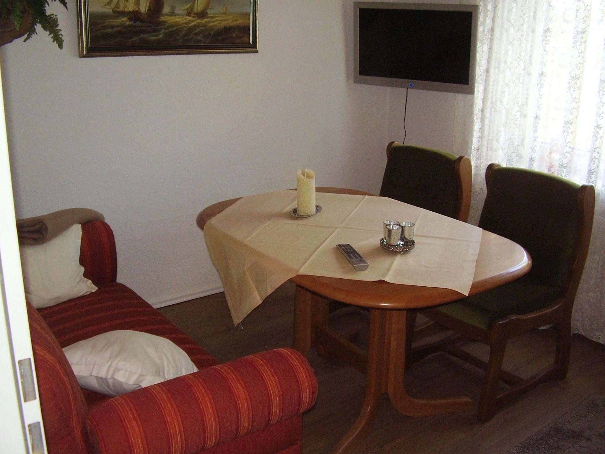 Wohnzimmer mit gemütlicher Sitzgruppe mit Ostfriesensofa und Flachbild-TV.