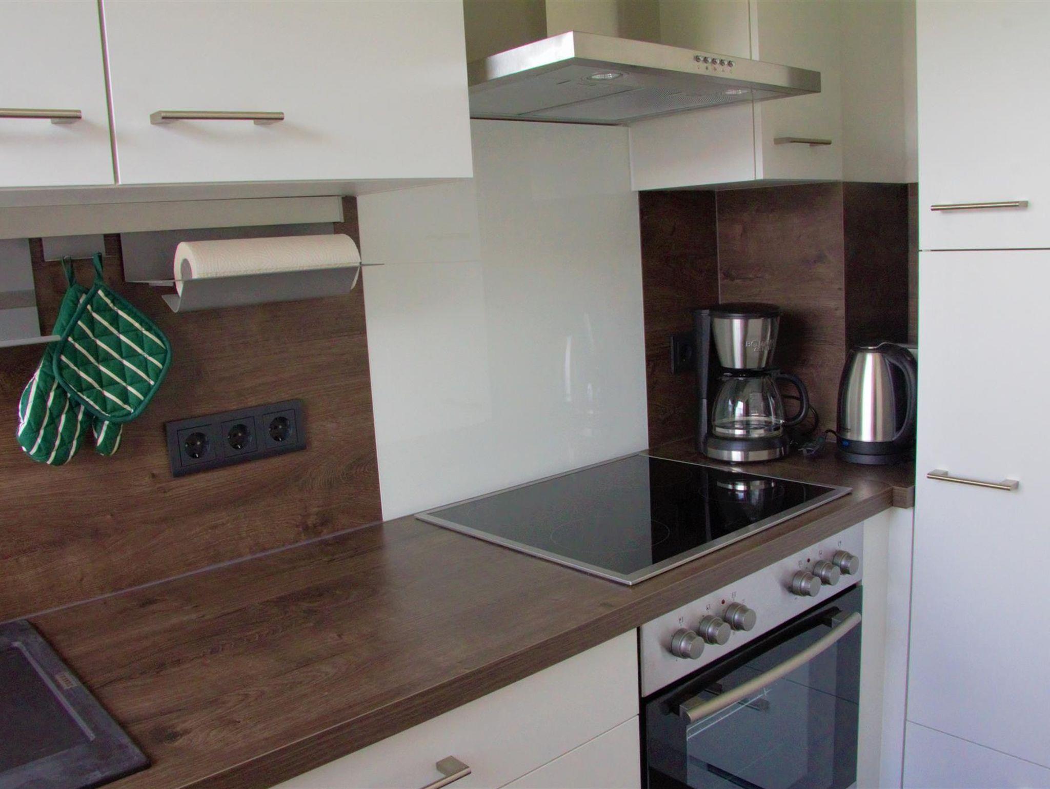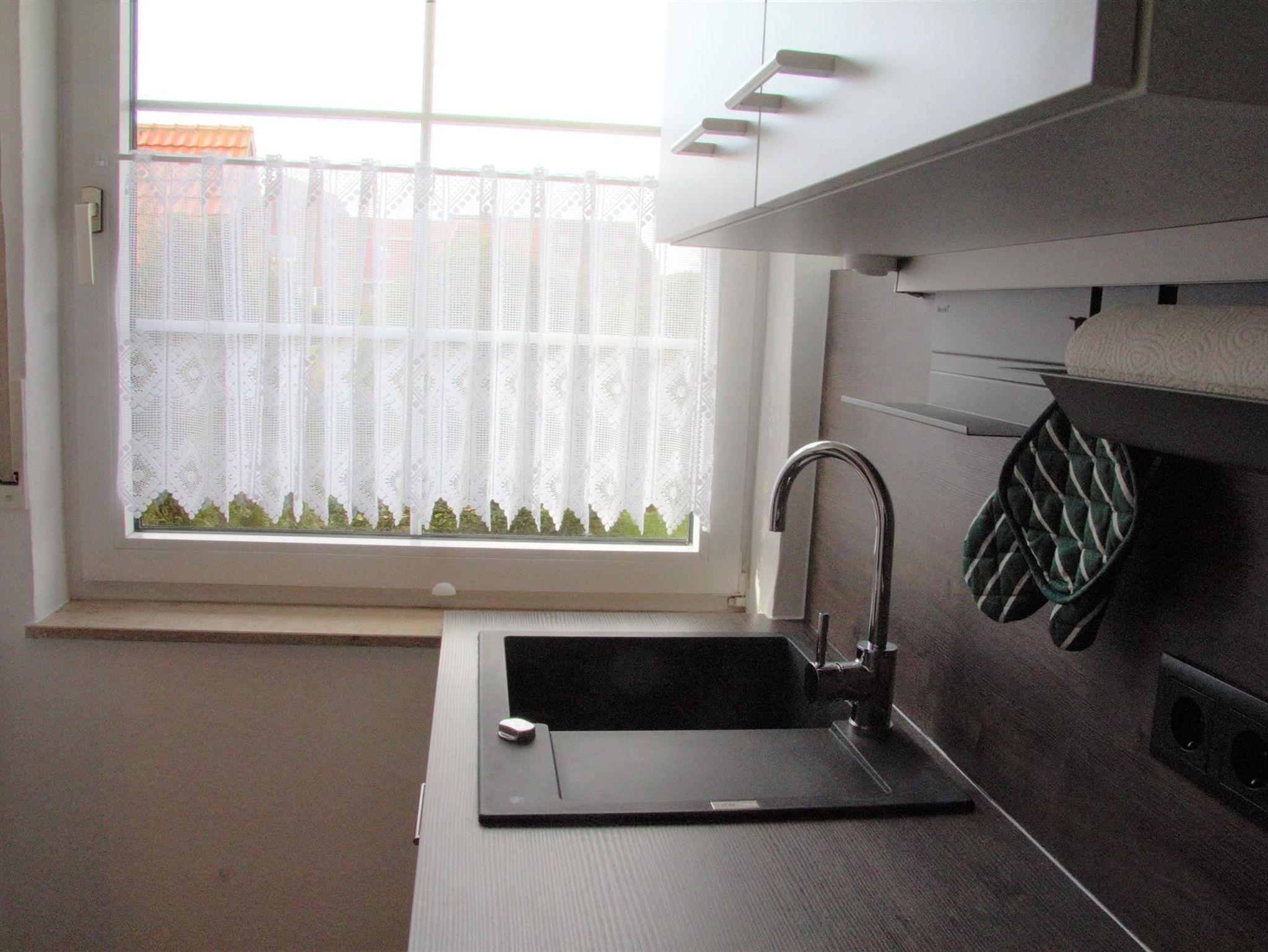 Die ebenerdige Ferienwohnung hat einen großen Wohn- und Essbereich mit Sat-TV und Radio mit separater Küche. Alle Fenster sind Außen- Rolläden ausgestattet.
