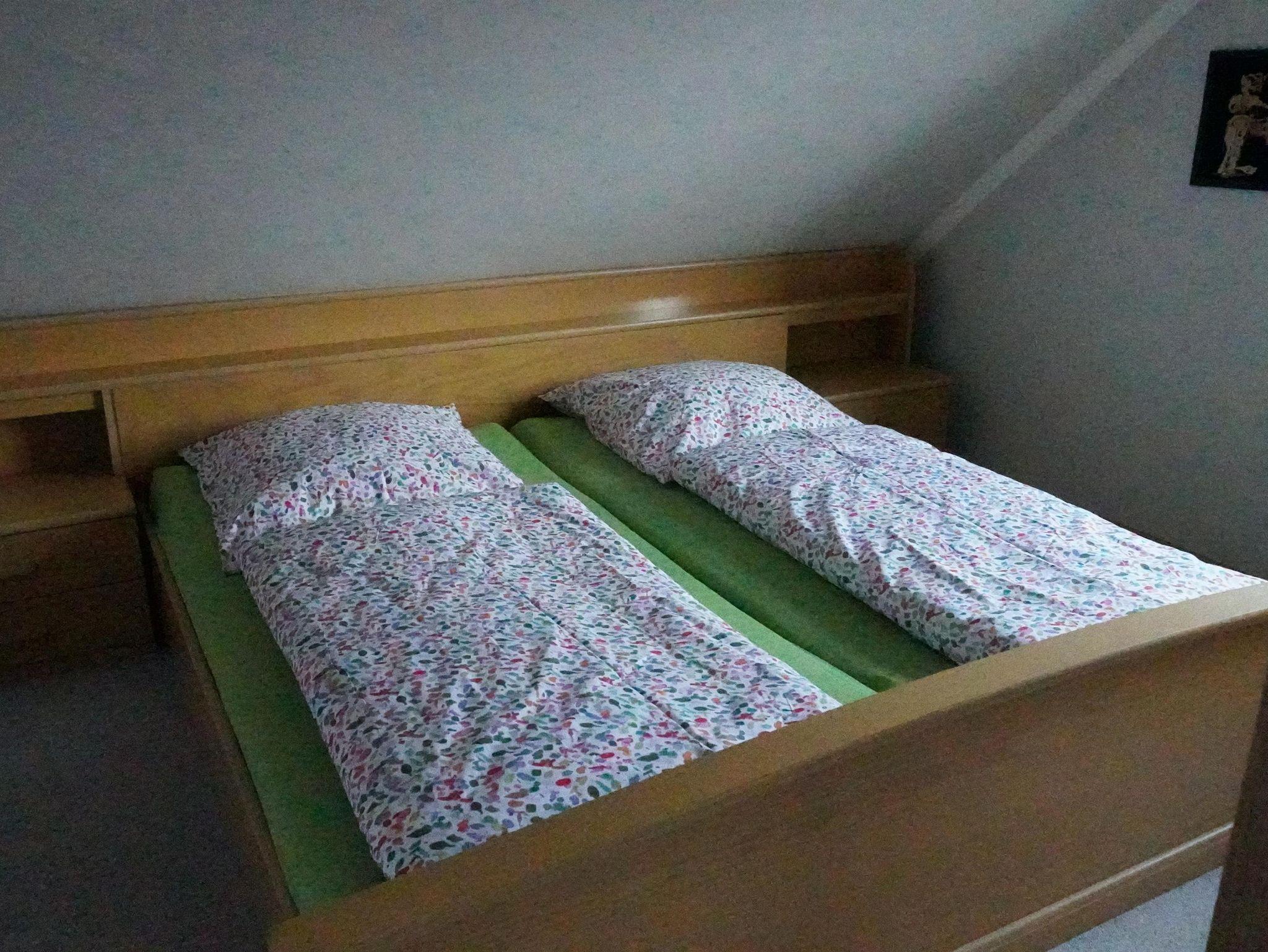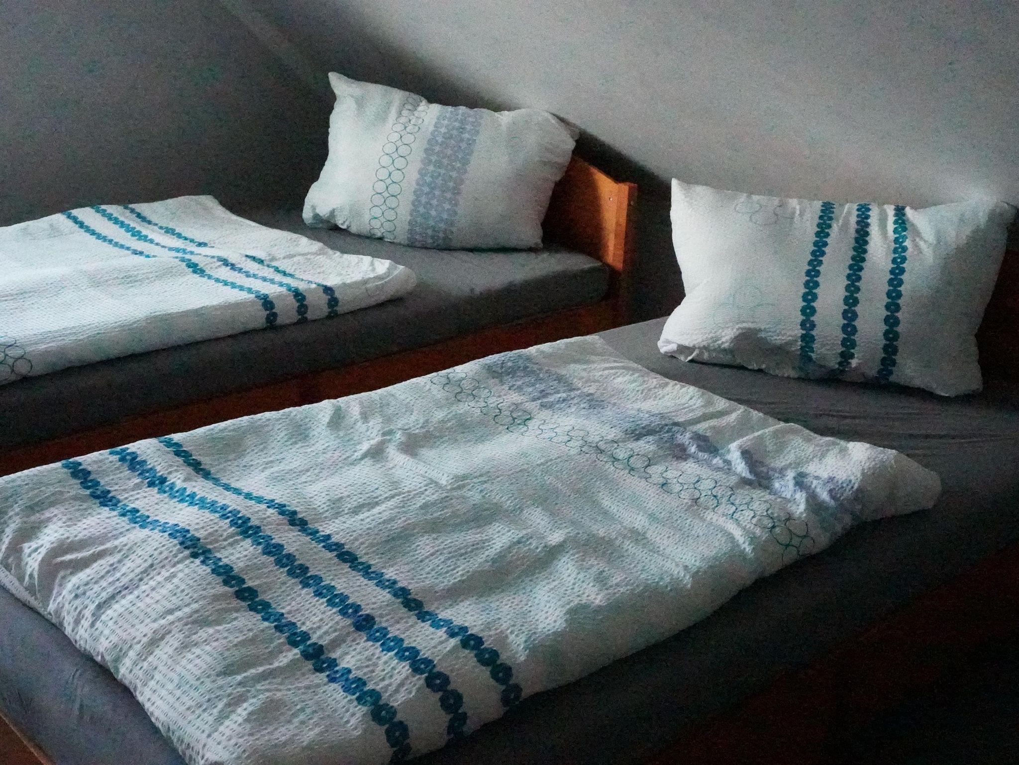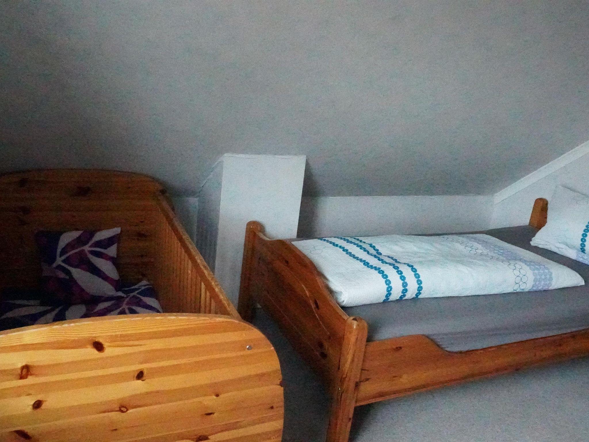Im Obergeschoss befinden sich drei Schlafdomizile. Zwei mit einem Doppelbett (ausgestattet mit 0,90x2,00 m Matratzen) und sowie ein Zimmer mit einem Einzelbett ( 0,90 x 2,00 m ) und einem Kinderbett. Das Bad verfügt hier über Badewanne und WC. Die Bäder und die Küche haben eine Fußbodenheizung.