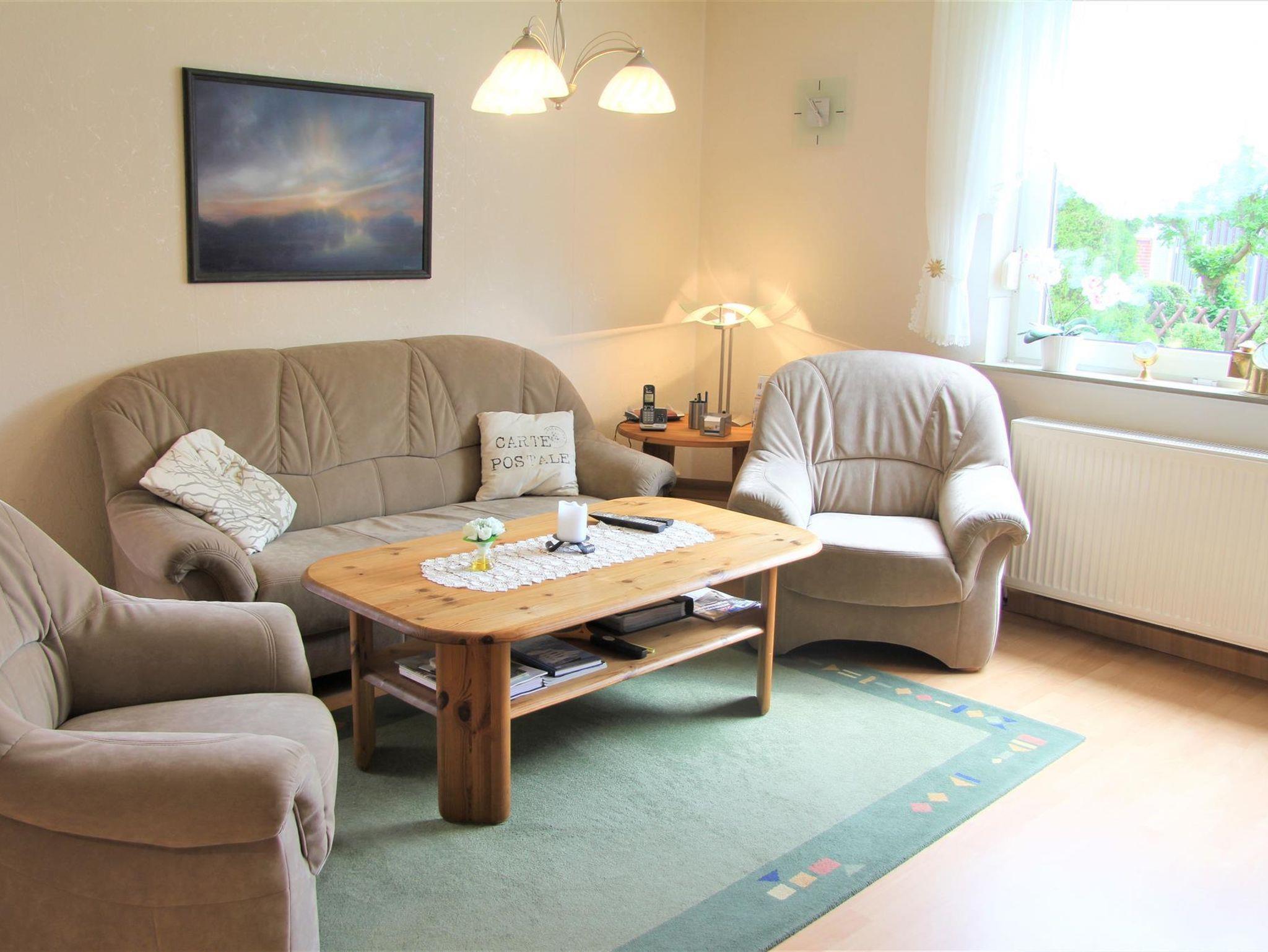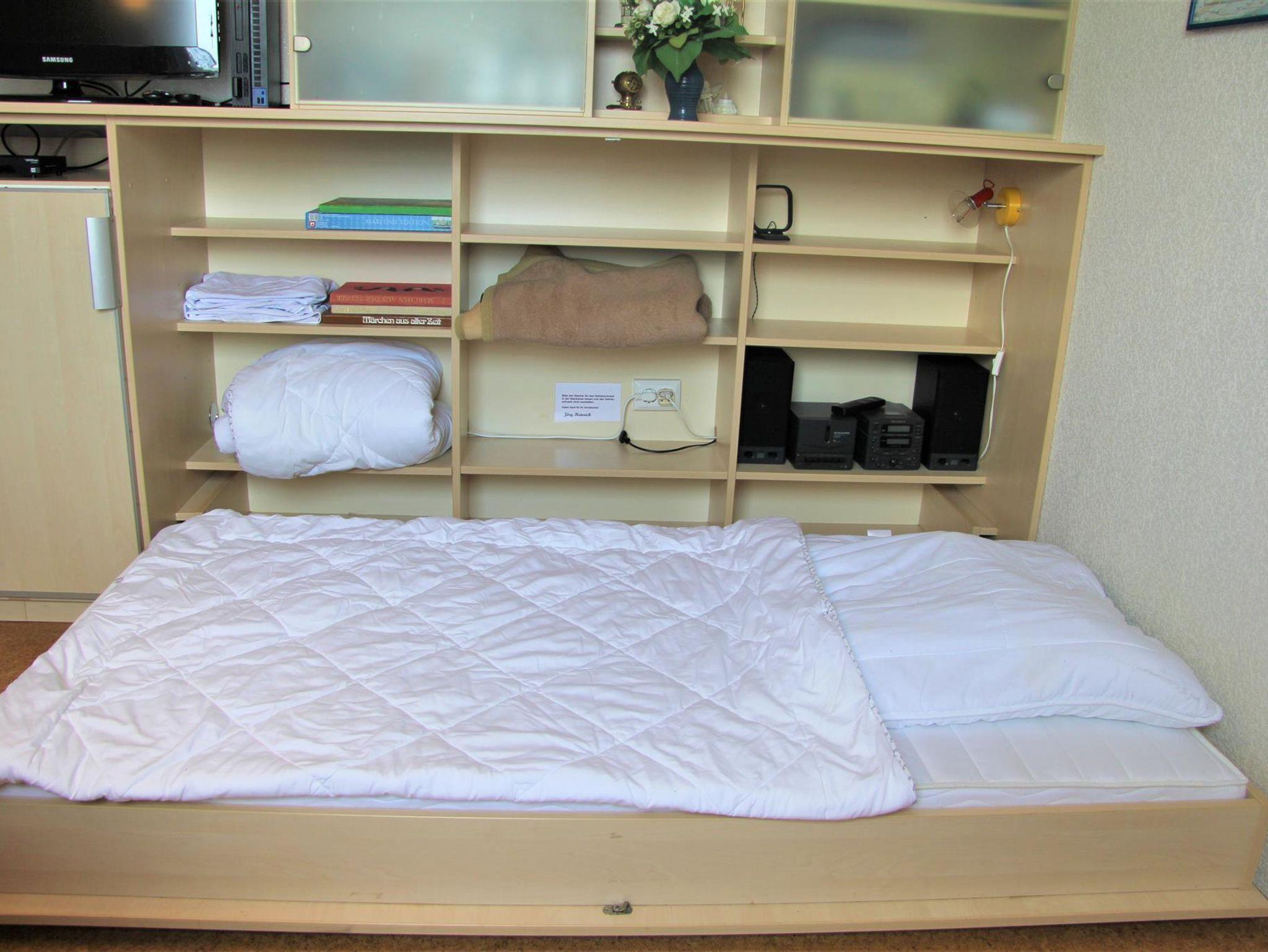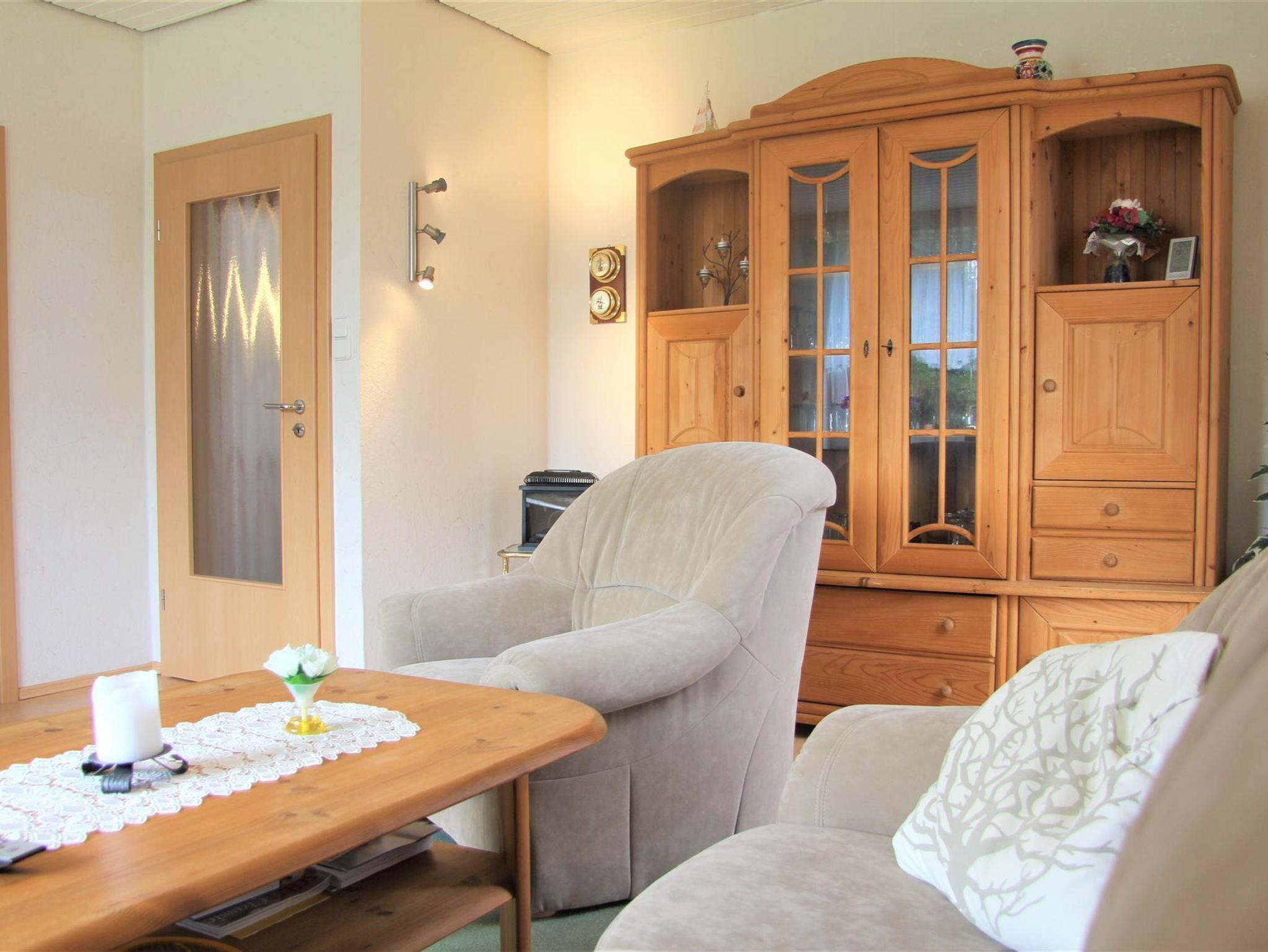 Auf ca. 56 qm erwarten Sie ein Wohn-/Esszimmer, ein Schlafzimmer mit Doppelbett, eine komplett eingerichtete Küche sowie ein Duschbad. Im Wohnzimmer steht Ihnen ein LCD-SAT-Fernseher zur Verfügung. Sollte sich das Wetter einmal nicht zum Spazierengehen eignen, liegen eine Vielzahl von Büchern, Spielen, Kartenspielen und Würfel für Sie bereit. Von einem Notebook mit DSL-Internetanschluss, mit einer gesonderten Mailadresse können Sie E-Mails verschicken und neue Fotos sofort in die Welt senden. Außerdem gibt es im Haus WLAN. Das 3. Bett ist ein Schrankbett (90x190cm) im Esszimmer, welches bei Bedarf herausgeklappt werden kann. Im Schrankbett steht eine Mikro-Musikanlage mit CD/Tape und Radio. Im Doppelzimmer finden Sie ein Kinder-Reisebett, eine Kinderbettmatratze sowie dazugehörige Zudecke und Kopfkissen. In der Garage ist außerdem ein Kinderhochstuhl vorzufinden.