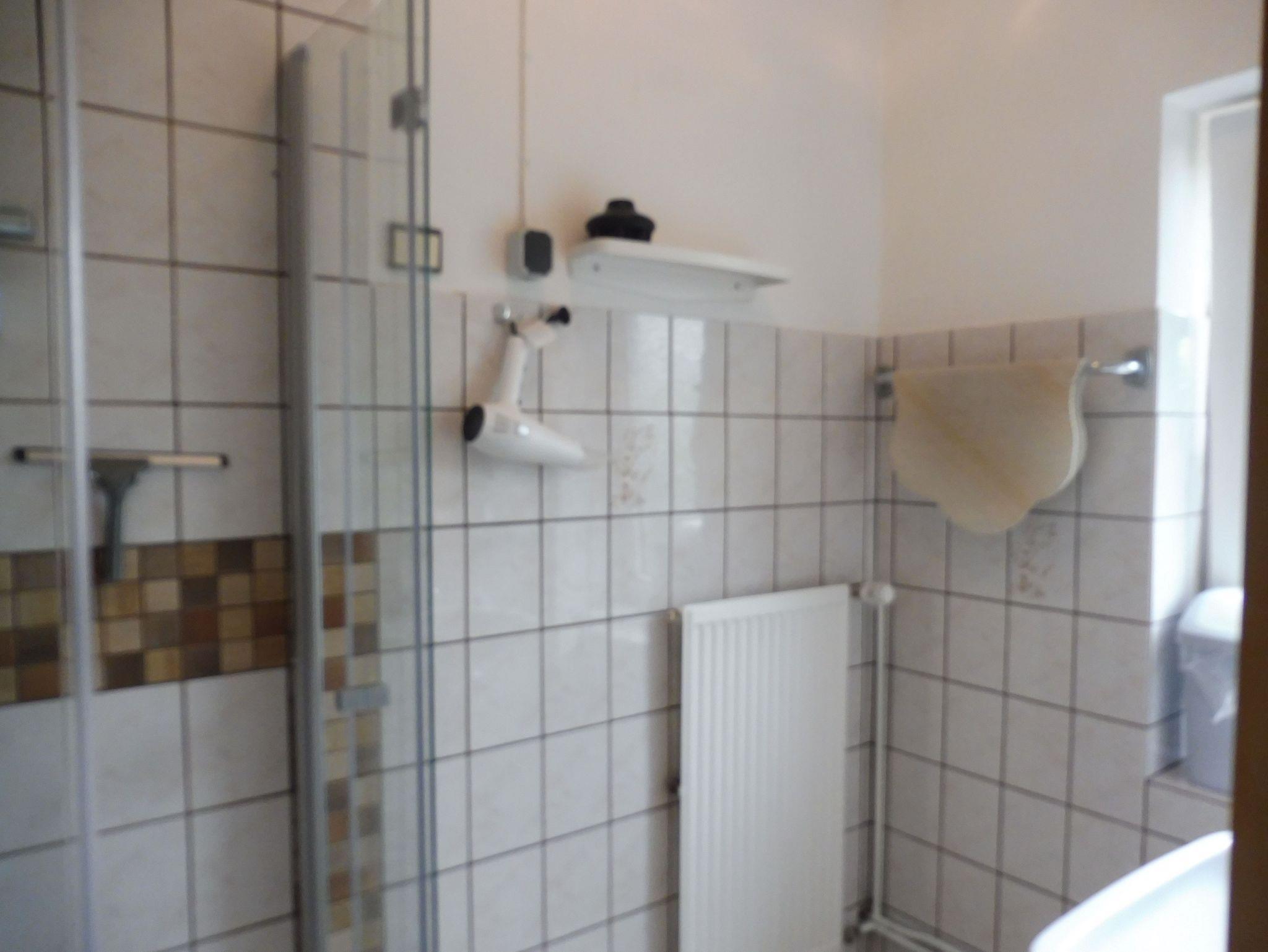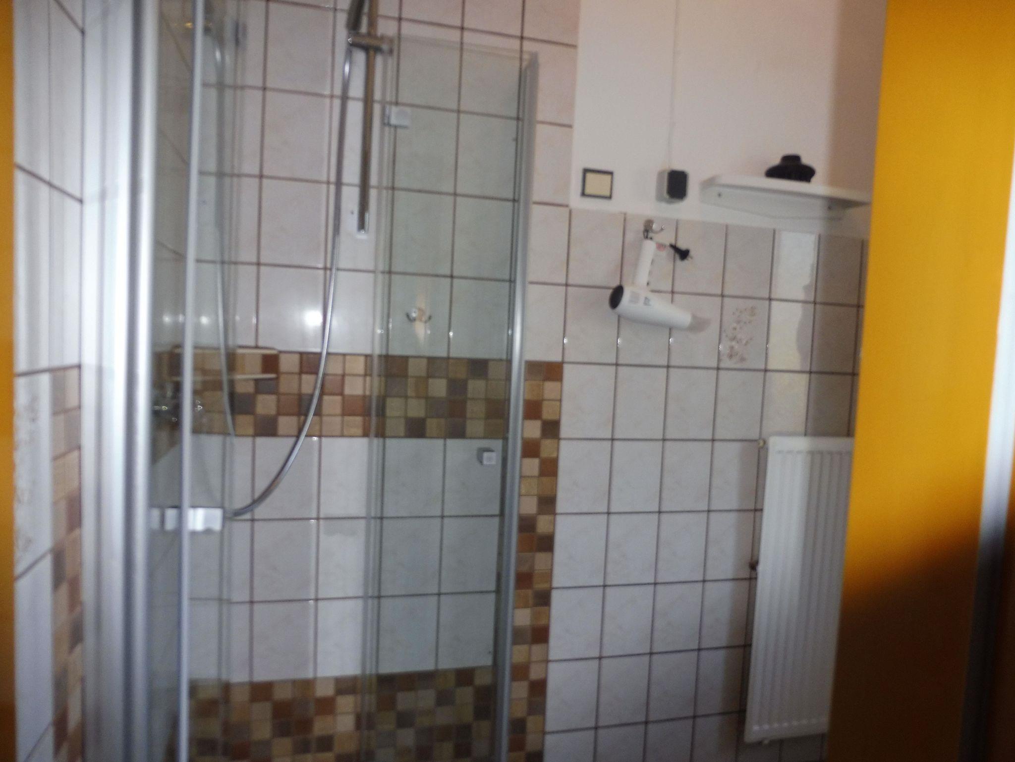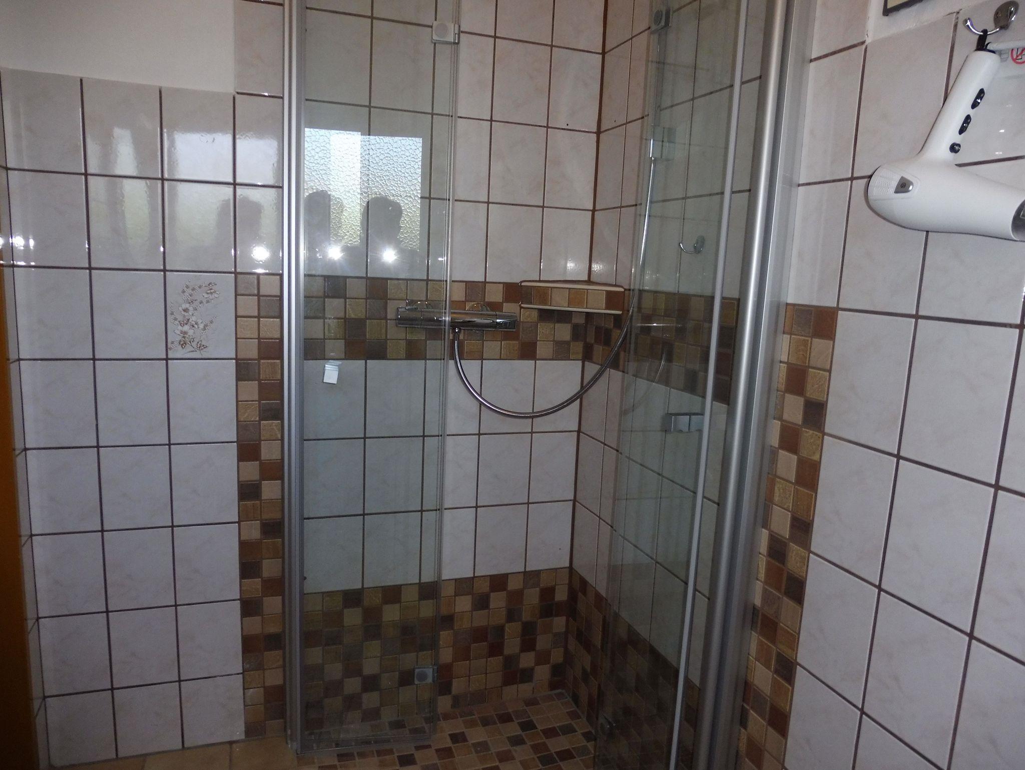 Schlafzimmer mit 2x2 Meter Doppelbett, Nachttischen, Kleiderschrank, zusätzlich eine Schlafcouch und weiteres Sat-TV. Ein schönes Duschbad mit Wohlfühl-Dusche sowie extra WC