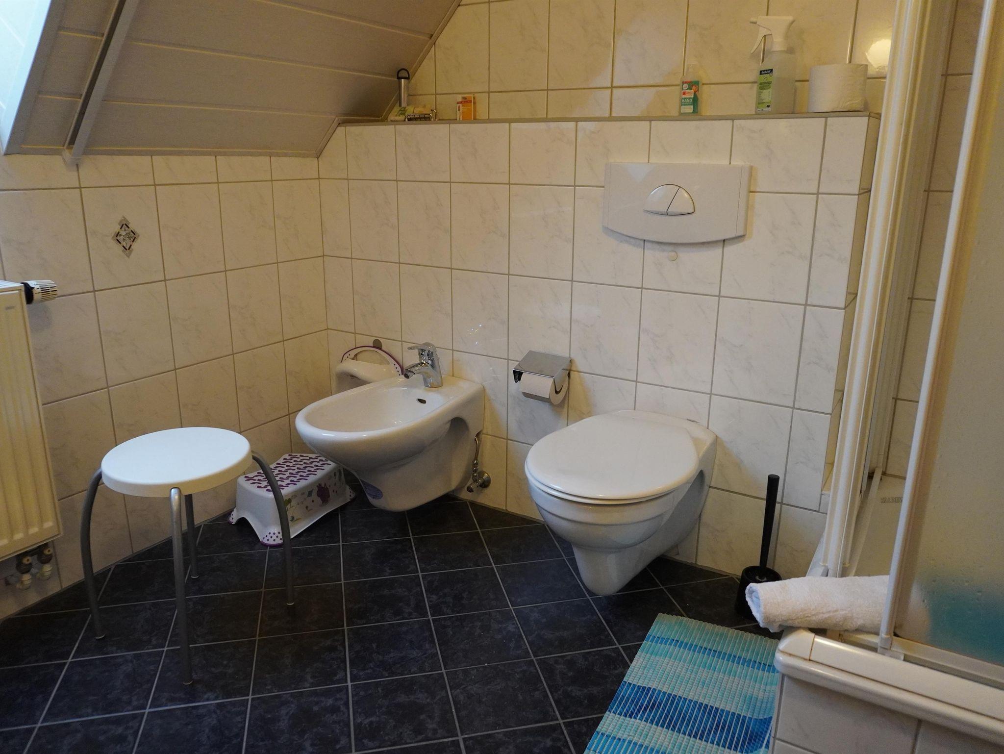 Im Obergeschoss finden Sie das dritte Schlafzimmer. Dort wartet ein Doppelbett (1,80 x 2,00m) sowie ein festes Kinderbett auf Sie. Auch das Badezimmer im Obergeschoss bietet Ihnen ein WC, Bidet und eine Dusche.