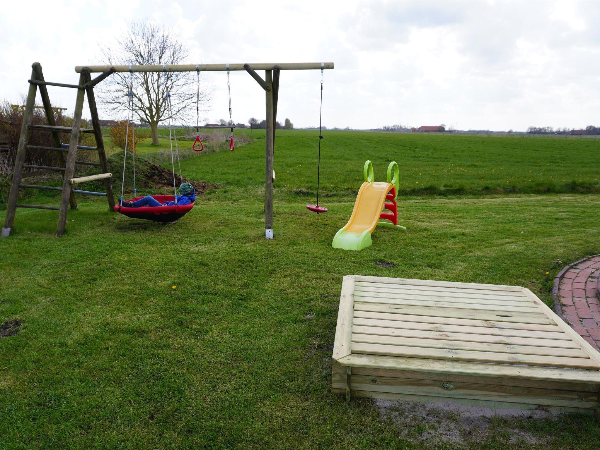 Im Garten mit gemütlicher Sitzecke wartet eine große Spielwiese mit Sandkasten, Schaukel und Rutsche auf unsere kleinen Gäste.
