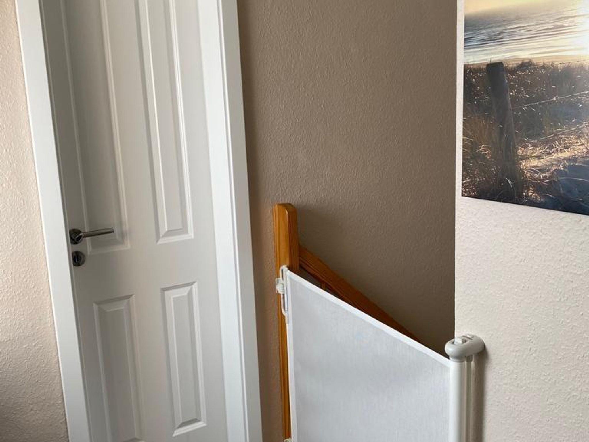 An der Treppe befindet sich ein Treppenschutzgitter.