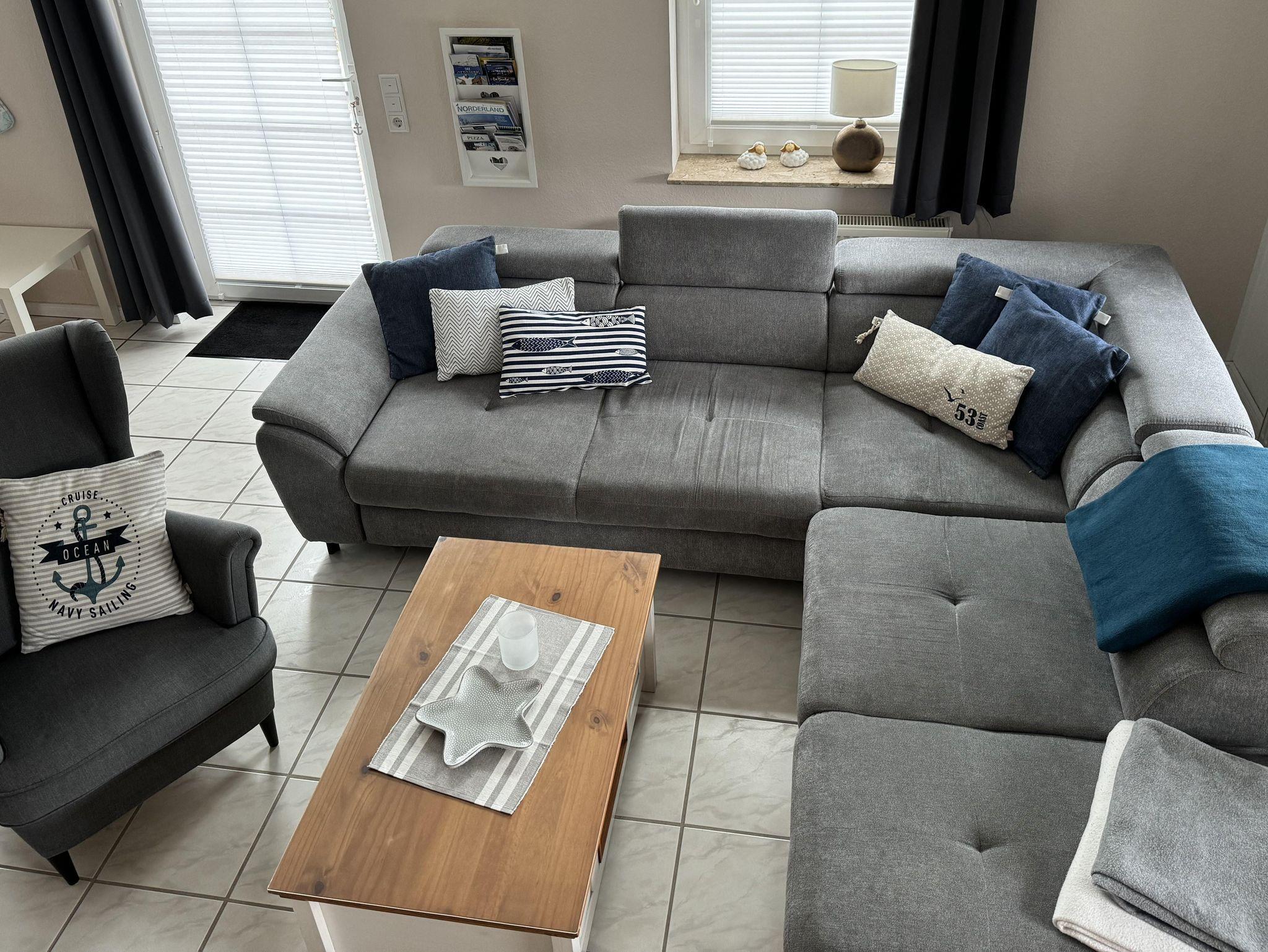 Großzügig geschnittener, offener und heller Wohn- und Essbereich mit Kaminofen, sowie einer ausziehbaren Wohnlandschaft, inkl. einem großen Esstisch für 6-8 Personen. Außerdem finden Sie verschiedene Gesellschaftsspiele, DVD's und Bücher.
