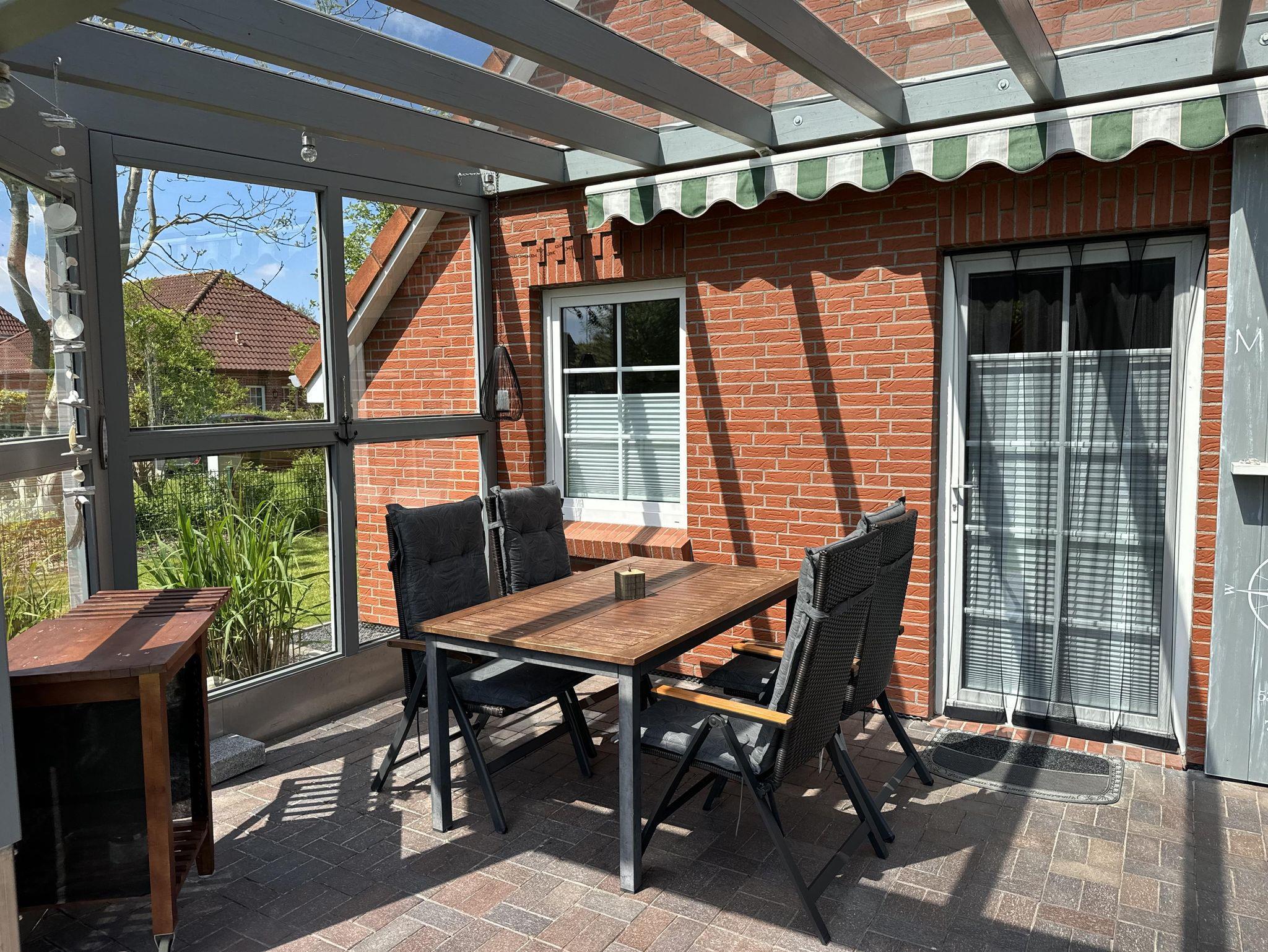 Ihr privater Außenbereich umfasst einen eingezäunten Garten mit Liegewiese und Sandkasten, eine überdachte Terrasse mit Markise und Windfang, Tisch und Gartenstühle, sowie 2 Sonnenliegen, Sonnenschirm und einen Grill.