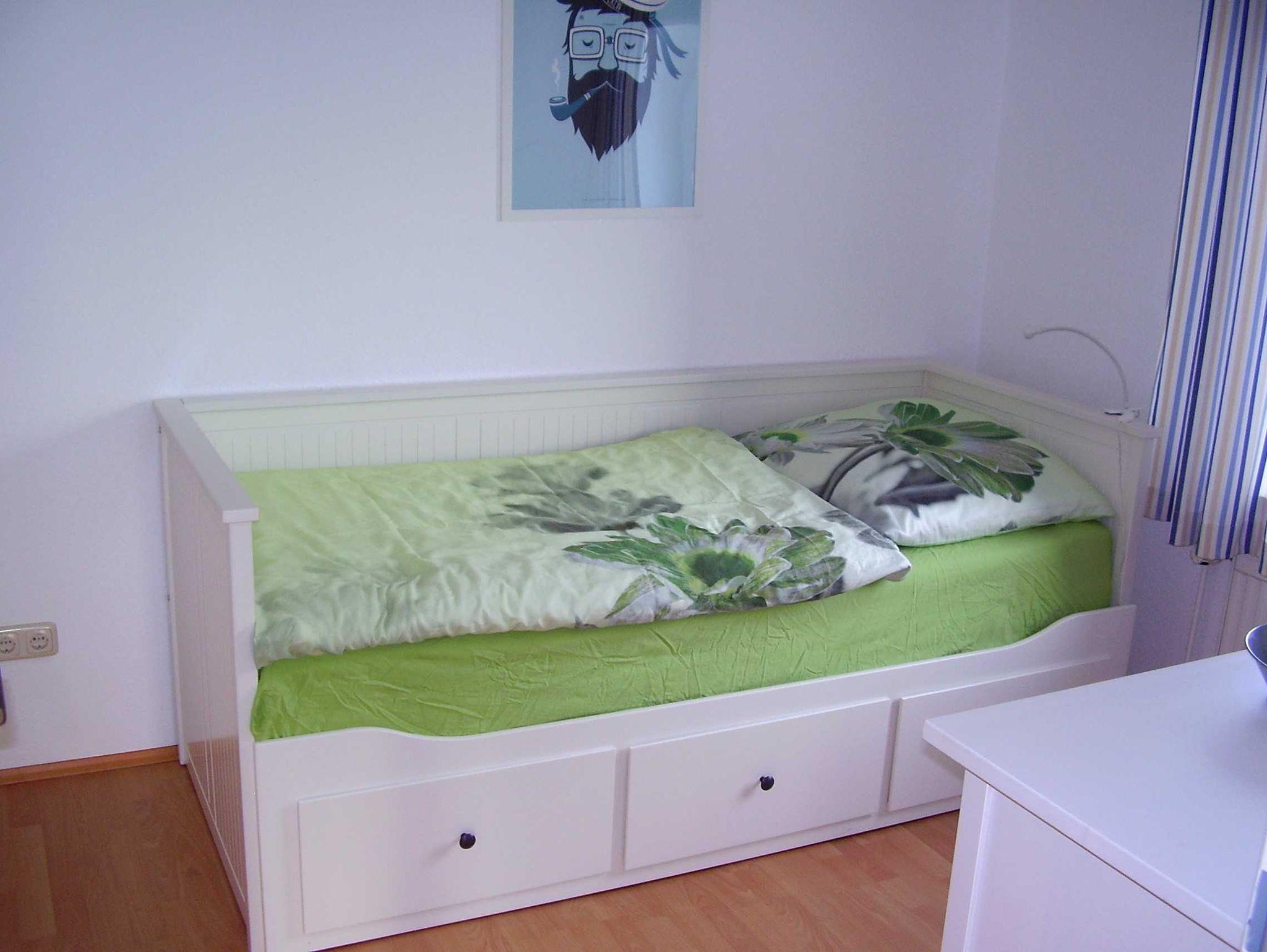 Ein Schlafzimmer mit Tandembett (zweite Schlaffläche wird ausgezogen).