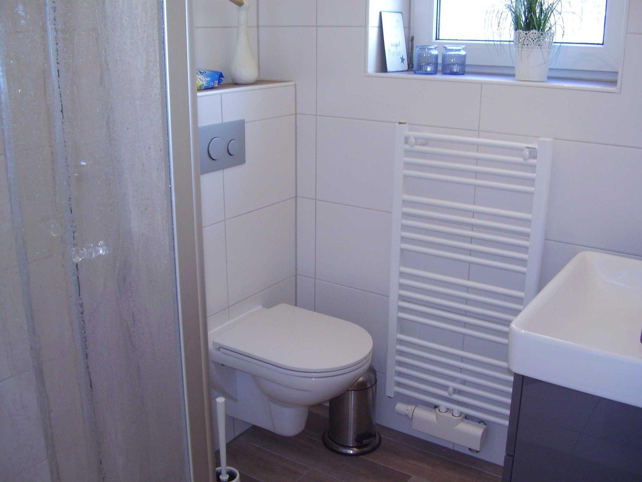 Tageslicht-Badezimmer mit ebenerdiger Dusche und WC.