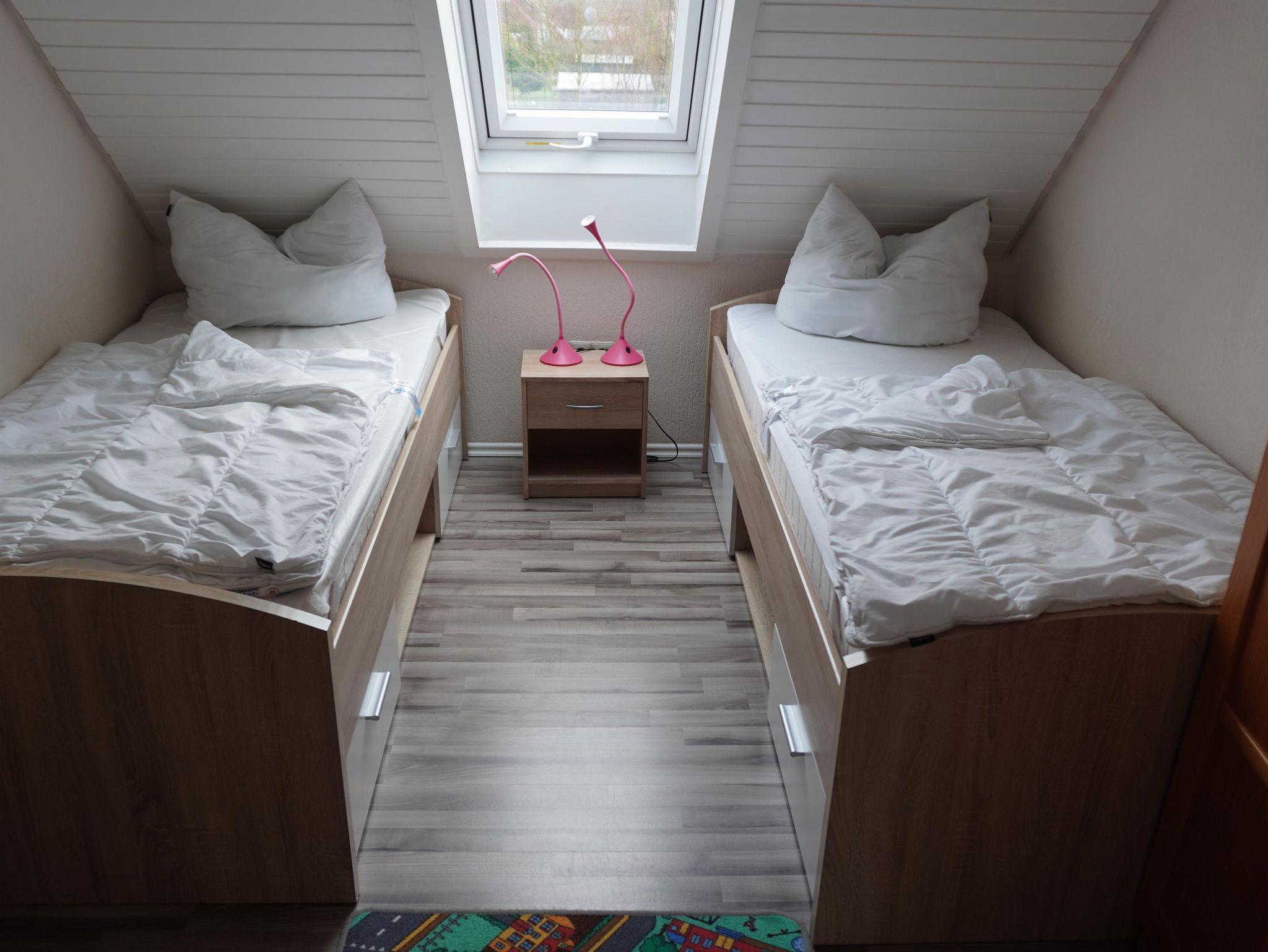 Im gefliesten Erdgeschoß befindet sich das frisch renovierte Tageslicht Duschbad mit WC und Föhn sowie ein Abstellraum mit Waschmaschine. Die offene Küche ist mit 4-Zonen Cerankochfeld, Backofen, Geschirrspüler, Kühlschrank mit Gefrierfach, Mikrowelle, Kaffeemaschine, Wasserkocher etc. gut ausgestattet. Im angrenzenden hellen Wohn-Esszimmer finden Sie für 5 Personen Platz mit Blick in den Garten. Für die Unterhaltung finden Sie im Wohnzimmer einen Flachbildschirm mit SAT-Empfang und eine Stereoanlage. Über die Playstation können sie DVD schauen. In der mit Laminat ausgelegten ersten Etage befinden sich zwei hell eingerichtete Schlafzimmer. Von dem Schlafzimmer mit den zwei Einzelbetten führt eine offene Treppe in den mit Teppich ausgelegtem Spitzboden, der zum lesen und entspannen und als fünften Schlafplatz einlädt.