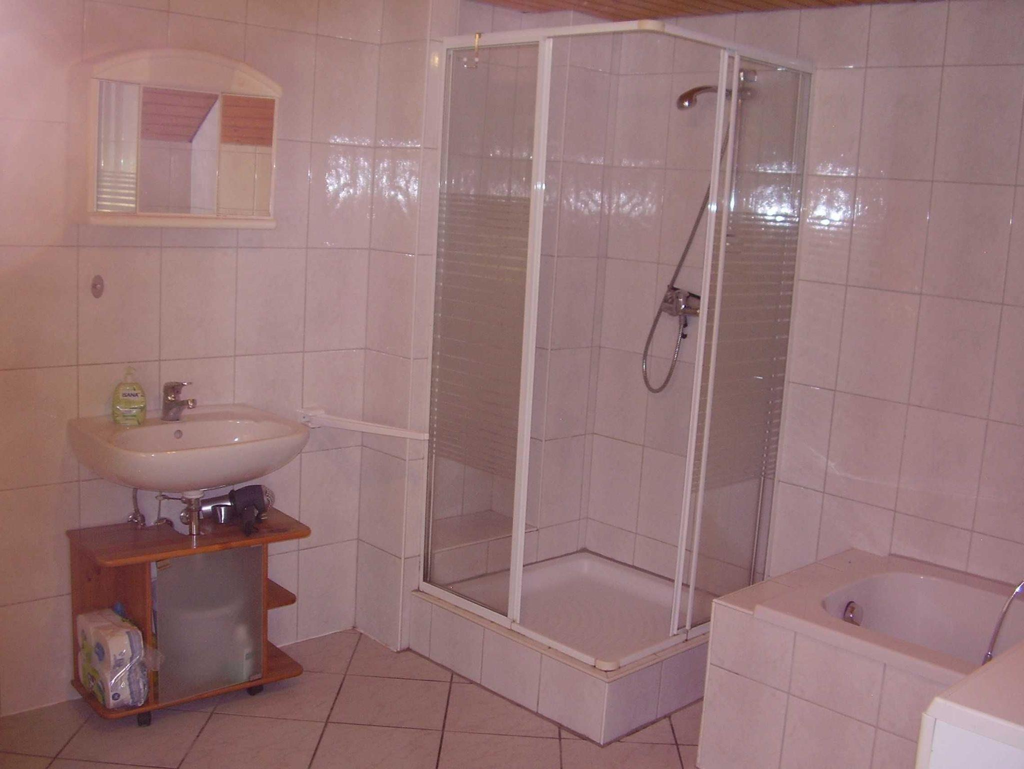 Tageslicht Badezimmer mit Badewanne, Dusche, WC und Waschmaschine.