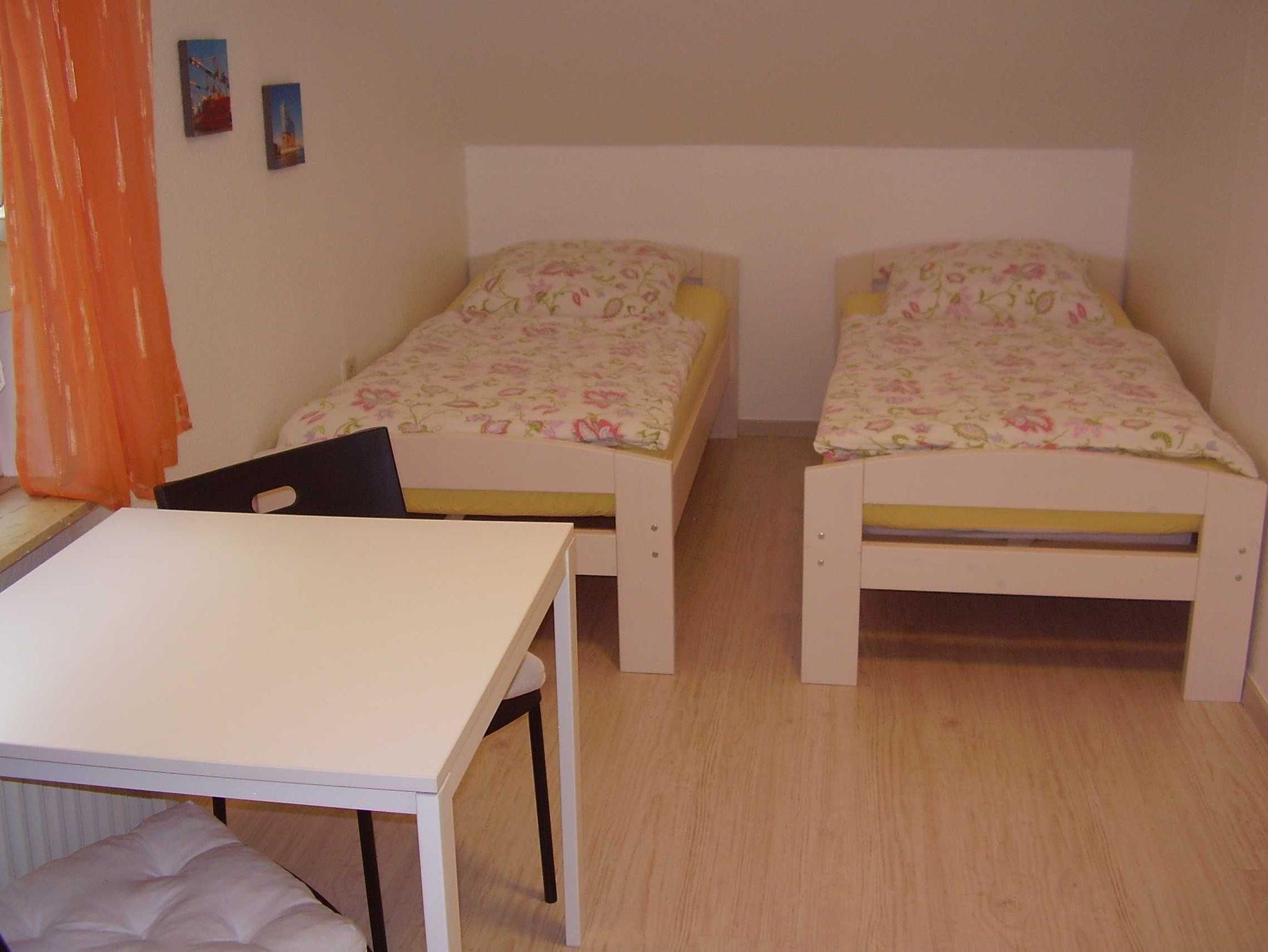Obergeschoss: 1 Schlafzimmer mit Doppelbett. 1 Schlaf-/Kinderzimmer mit 2 Einzelbetten.