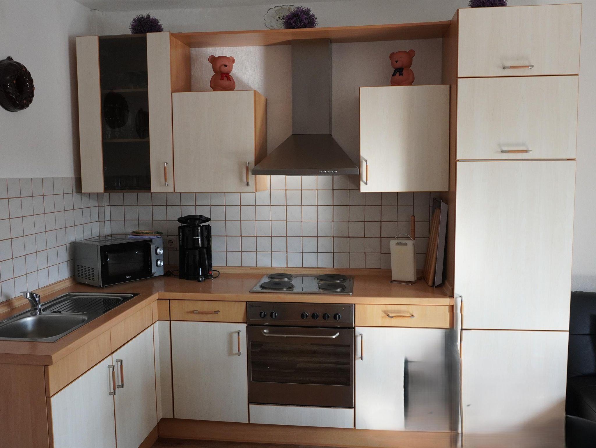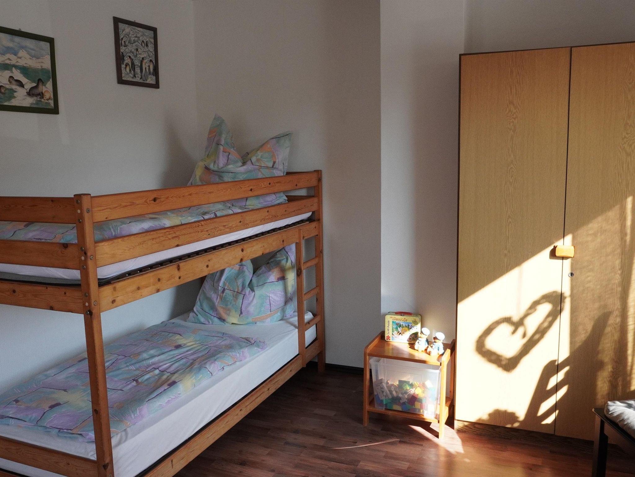 Unsere Feriemwohnung 3 liegt im Erdgeschoss und verfügt über eine Wohn - Küche, mit Mikrowell, Kaffeemaschine, Wasserkocher, allerlei Küchenutensilien ,Herd mit Backofen und Kühlschrank. In der gemütlichen Essecke können Sie ausgiebig essen und Spieleabende verbringen. Ein Fernseher ist auch vorhanden, für bequeme Abende auf der Couch. Ein Schlafzimmer hat ein Doppelbett ( 1,90 x 2,00 m, mit getrennten Matratzen ) und einem Kinderbett. Das zweite Schlafzimmer ist mit einem Etagenbett ( 0,90 x 2,00 m ) und einer bequemen Ausziehcouch ( 1,40 x2,00 m ) ausgestattet. Das moderne Bad verfügt über eine Dusch mit etwas höherem Einstieg, Waschbecken und WC. Ein Föhn steht für Sie zur Verfügung. Die Terrasse läd Sie mit Tisch, Stühlen und Sonnenschirm zu angenehmen Stunden ein. Ein Grill ist ebenfalls vorhanden. Ihre mitgebrachten Fahrräder können in einem abschließbaren Schuppen eingstellt werden. Der Parkplatz befindet sich direkt am Haus.