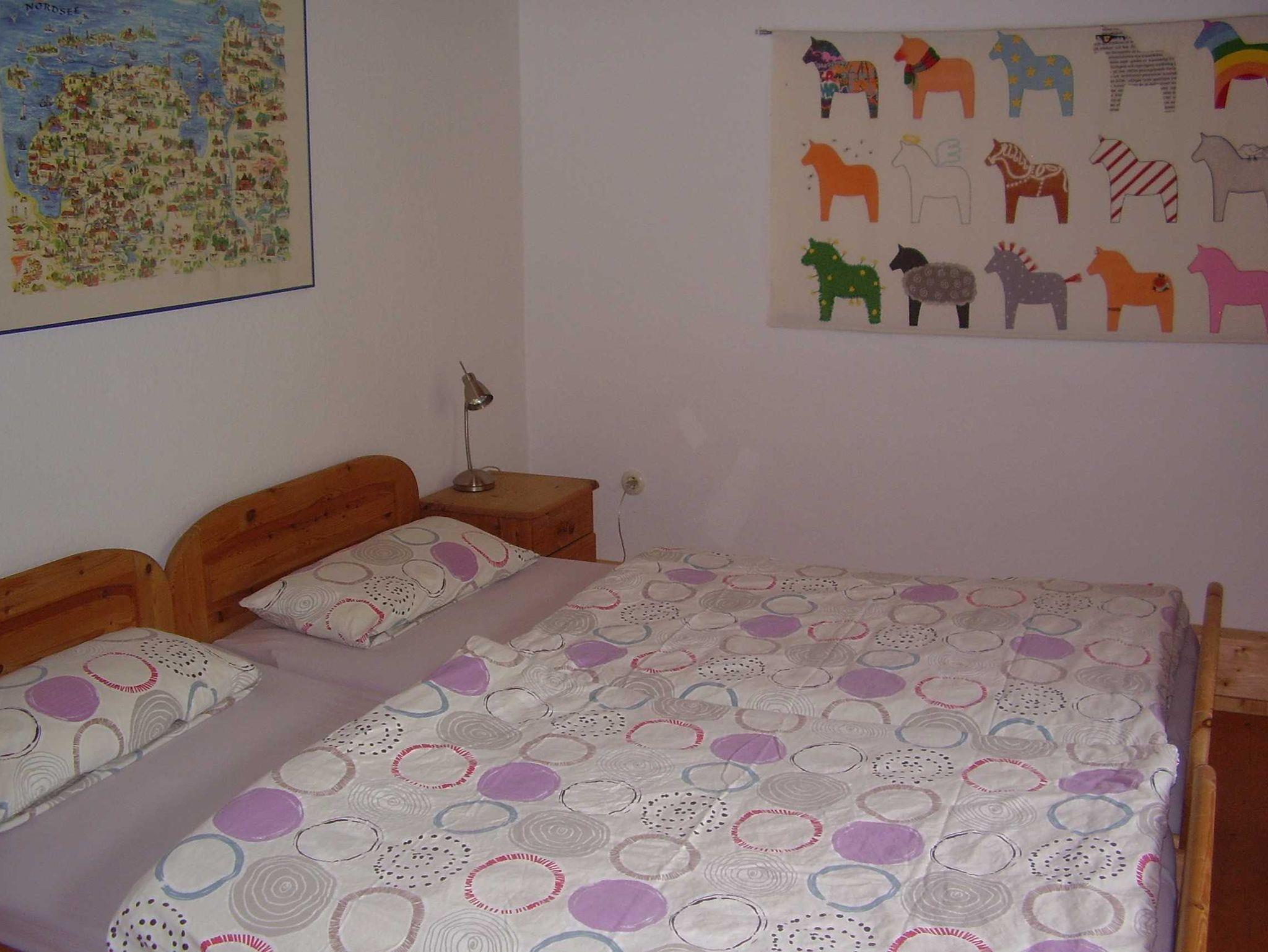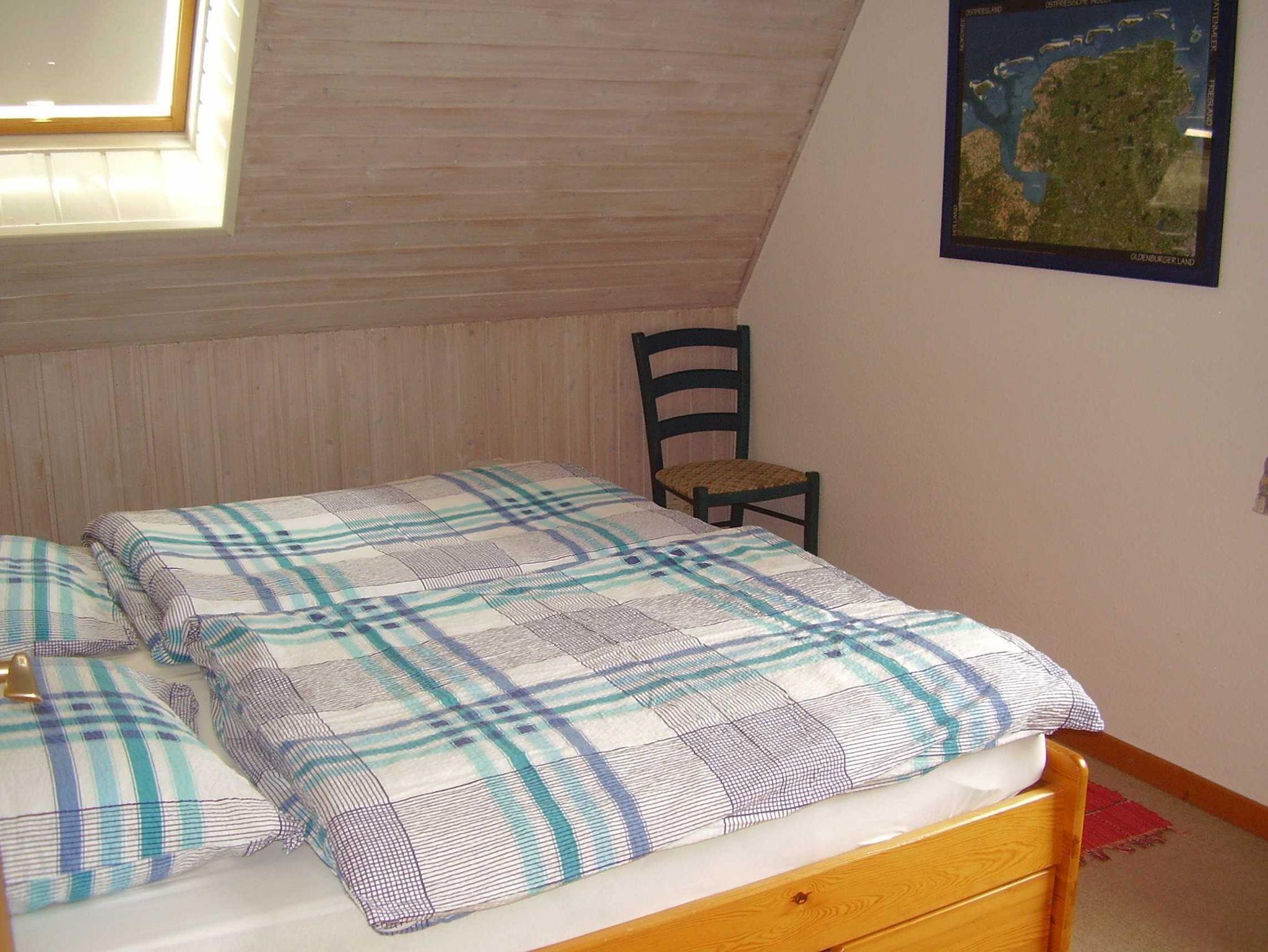 Dachgeschoss: 1 Schlafzimmer mit Doppelbett, 1 Schlafzimmer mit 2 Einzelbetten und Fernsicht bis zur Nordseeinsel Baltrum.