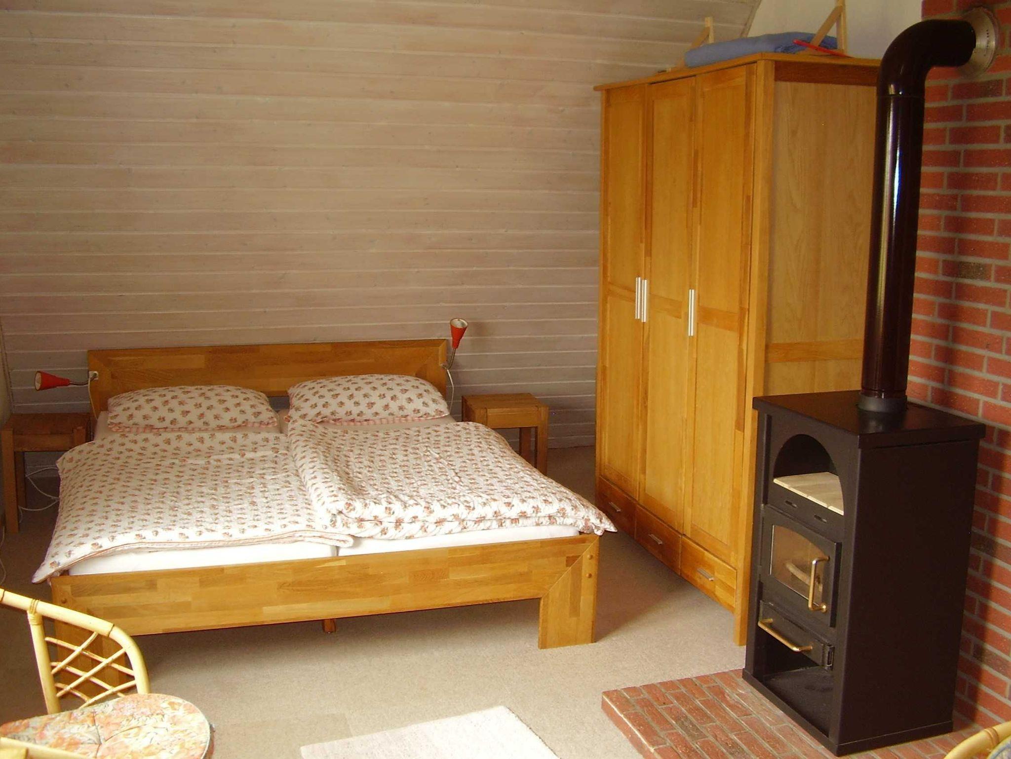 Obergeschoss: 1 Schlafzimmer mit Doppelbett. 1 Schlafzimmer mit Doppelbett sowie einer Sitzgruppe, Kaminofen und SAT-TV. 2 Badezimmer mit Dusche und WC. Hier steht auch ein weiteres Kinder(Reise)bett zur Verfügung.