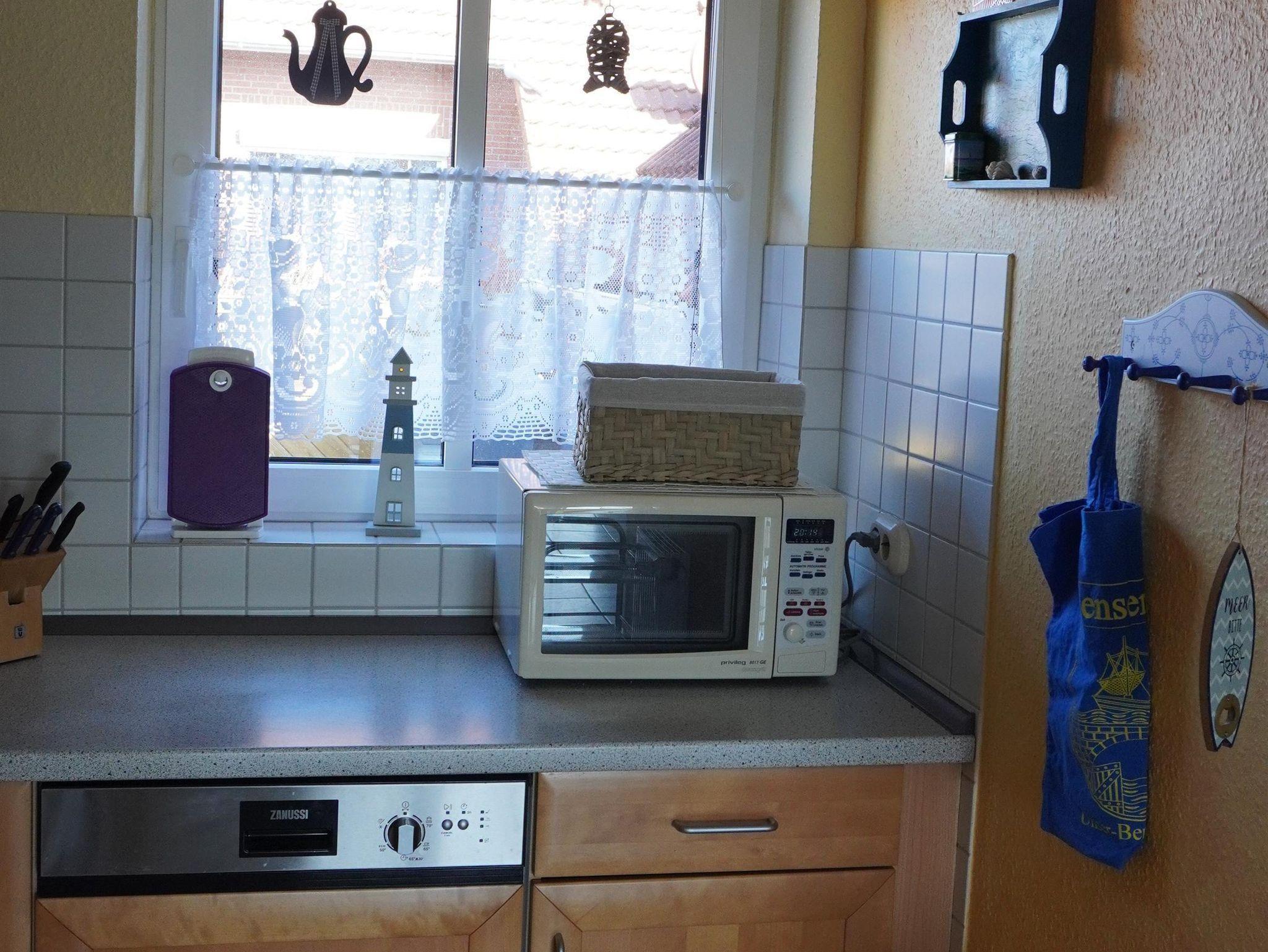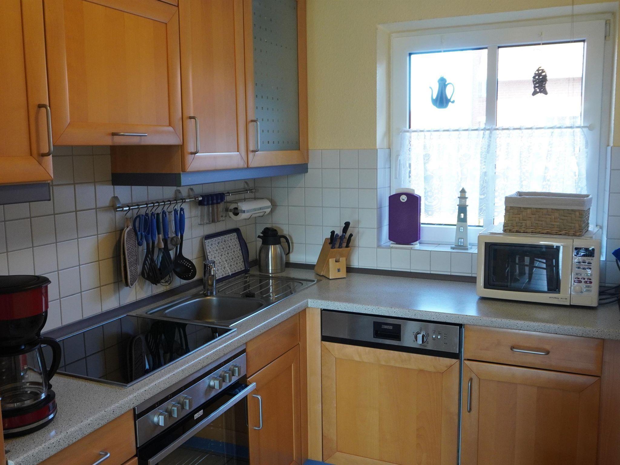 Die offene Küche ist mit Herd, Geschirrspüler, Backofen, Mikrowelle sowie mit nützlichen elektrischen Kleingeräten wie Toaster, Wasserkocher, Mixer und Waffeleisen eingerichtet.
