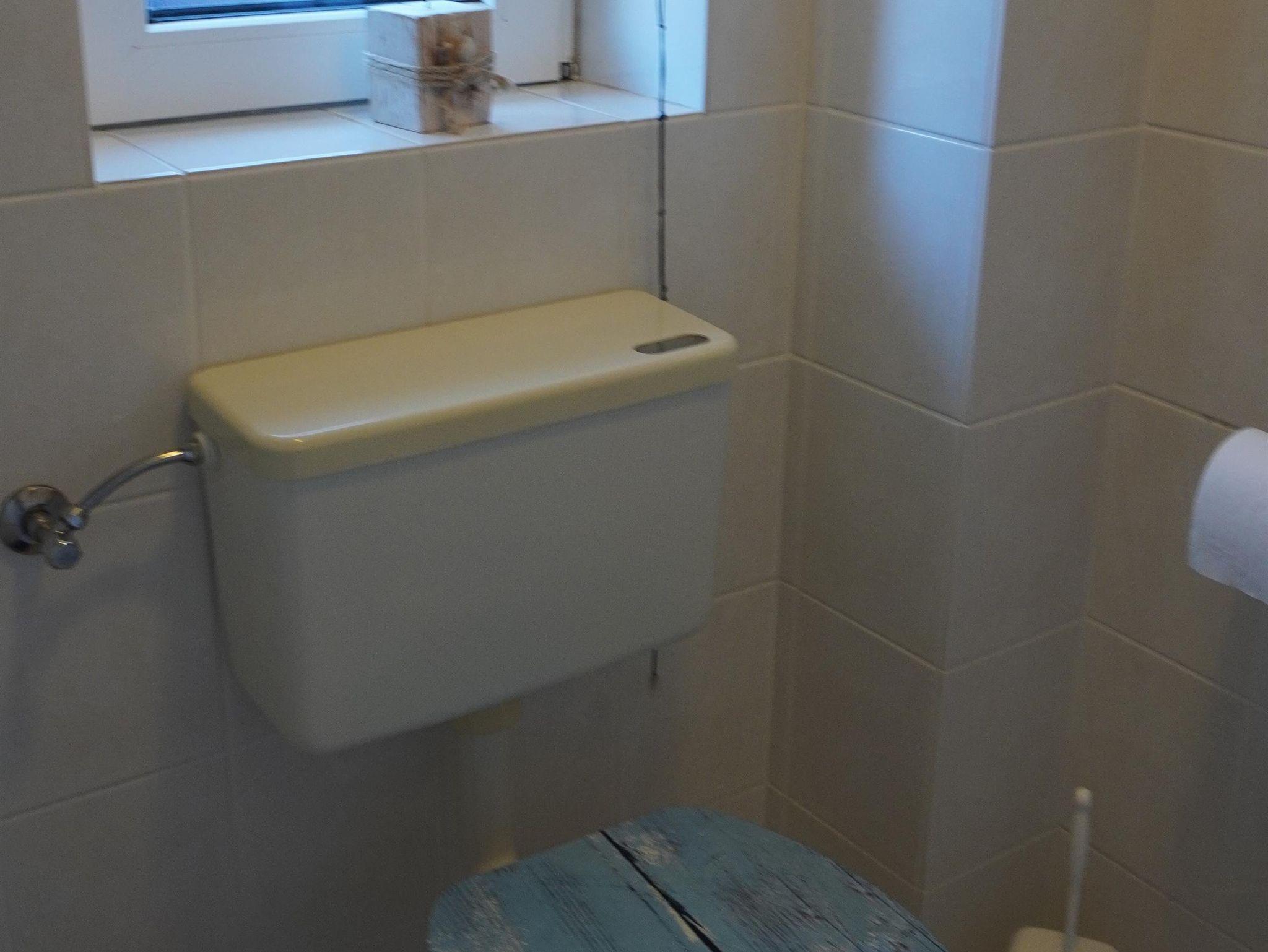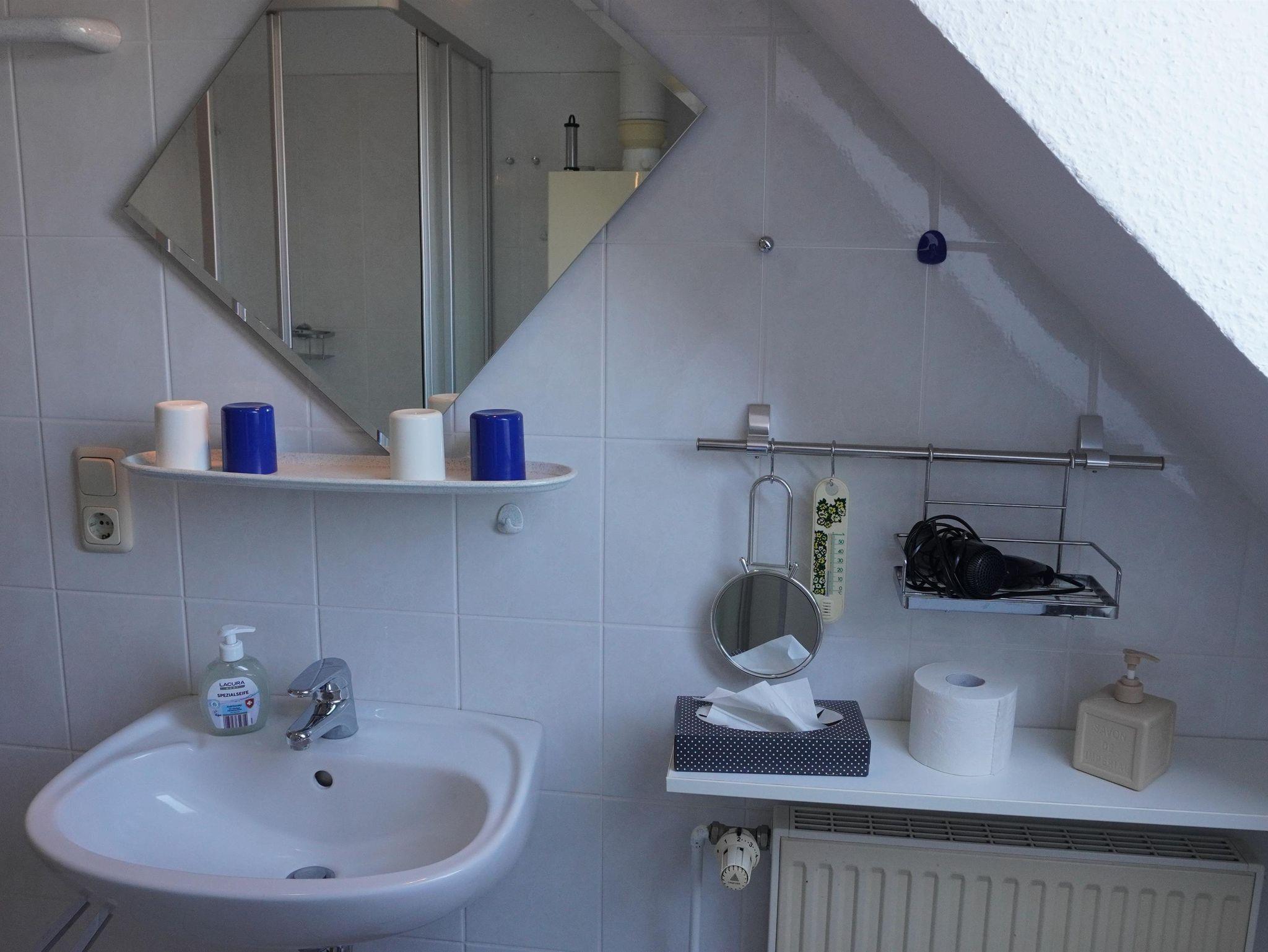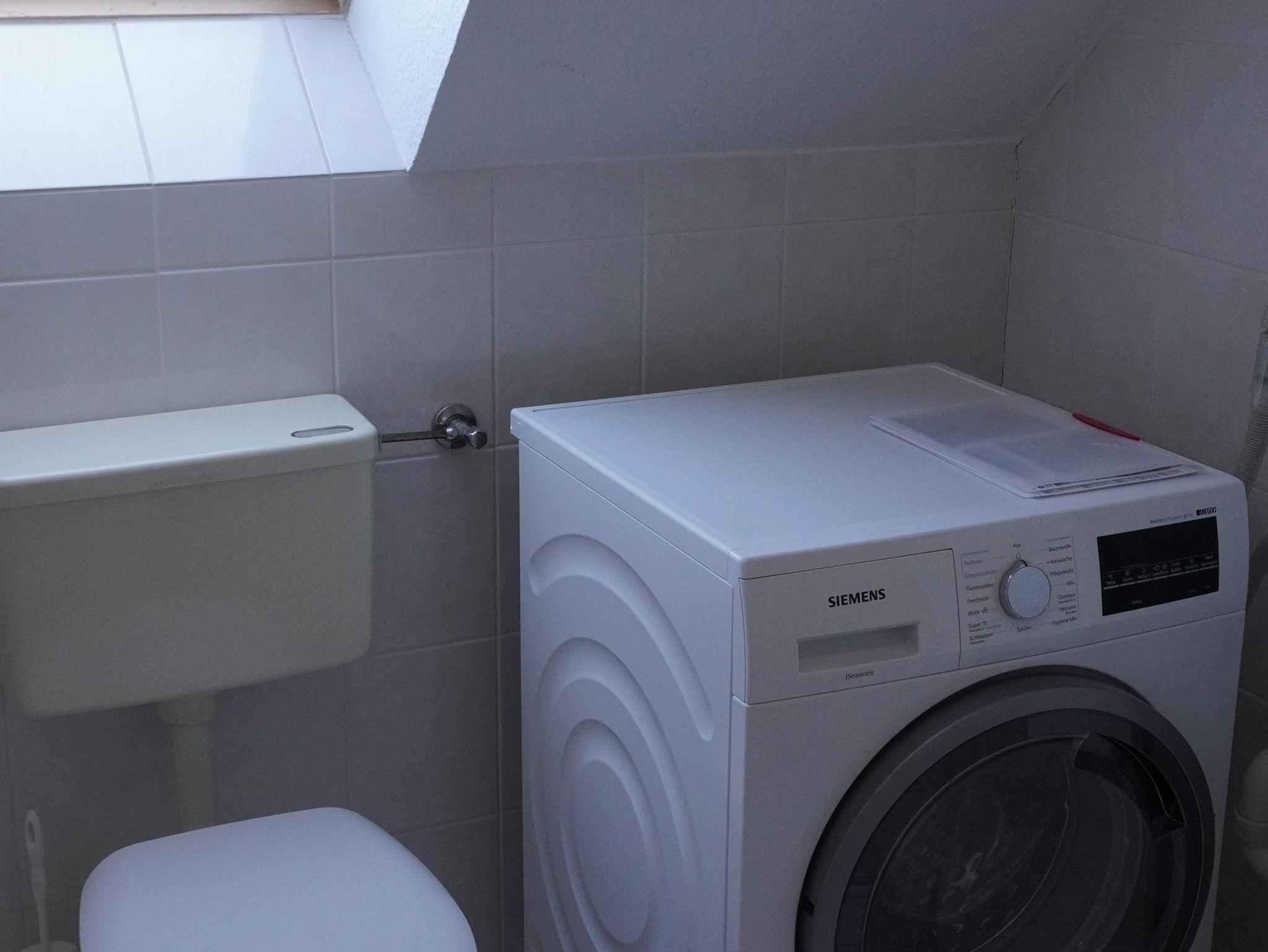 Das helle und lichtdurchflutete Bad ist ausgestattet mit Dusche und WC. Hier befindet sich auch ein Waschtrockner der unseren Gästen kostenfrei zur Verfügung steht.