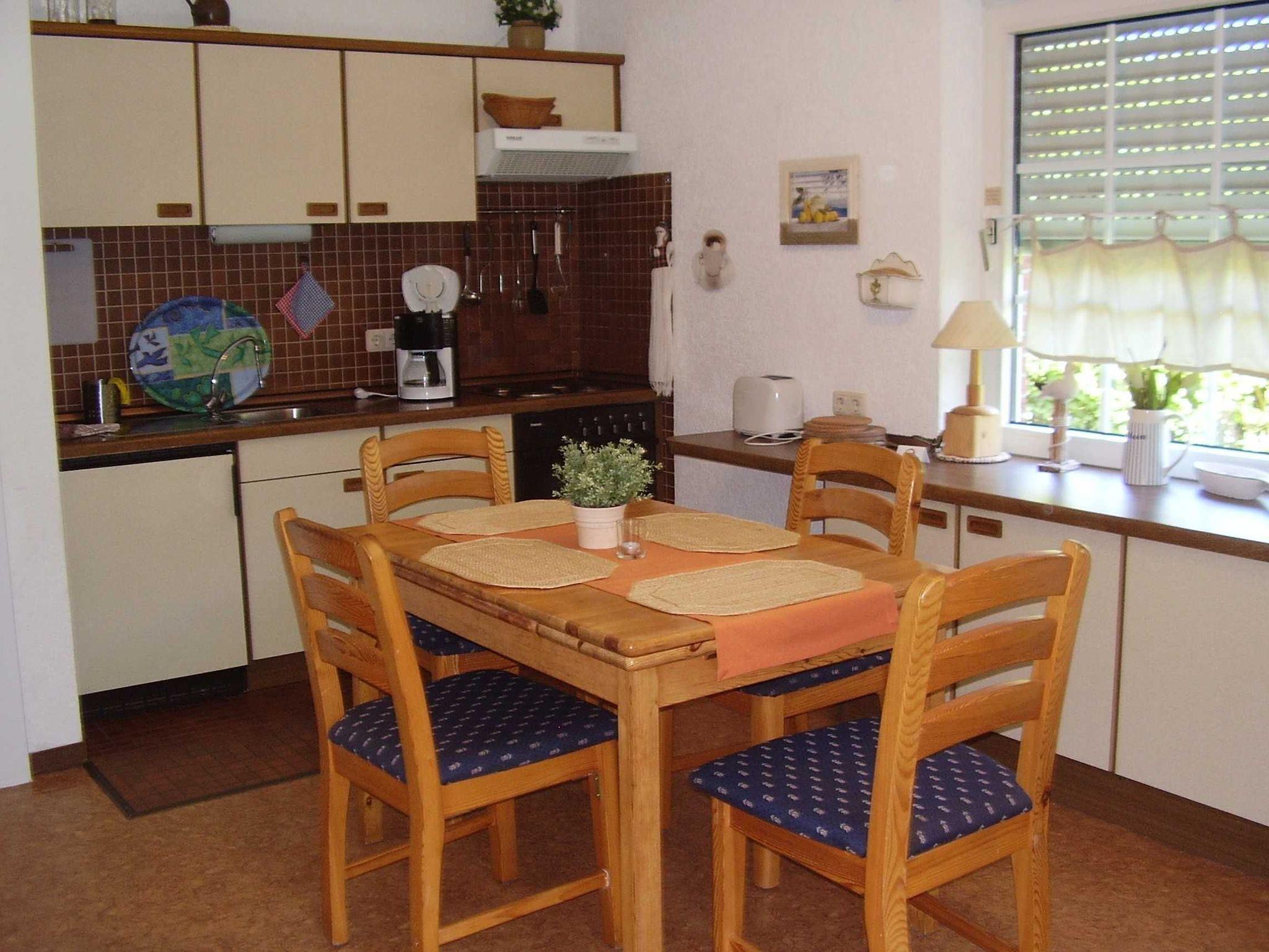 Offener Wohn- und Essbereich mit moderner Sitzecke und Flachbild-TV, Esstisch mit Bestuhlung und EBK mit Kühlschrank mit Gefrierfach, Elektroherd mit Backofen und allen erforderlichen Elektrogeräten. Südterrasse.