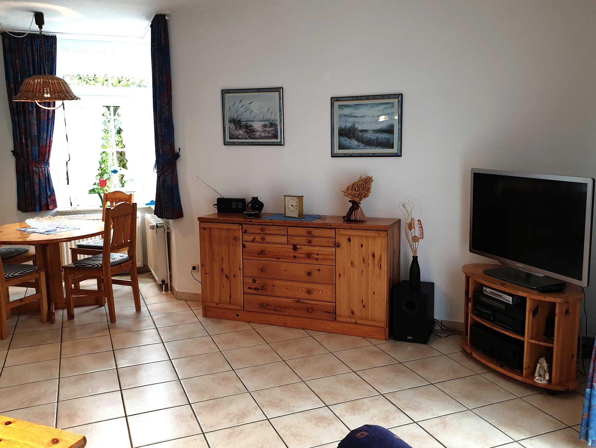 Offener Wohn- und Essbereich mit gemütlichen, ansprechenden Sitzmöbeln, FlachbildTV und Stereoanlage; Esstisch mit Bestuhlung.