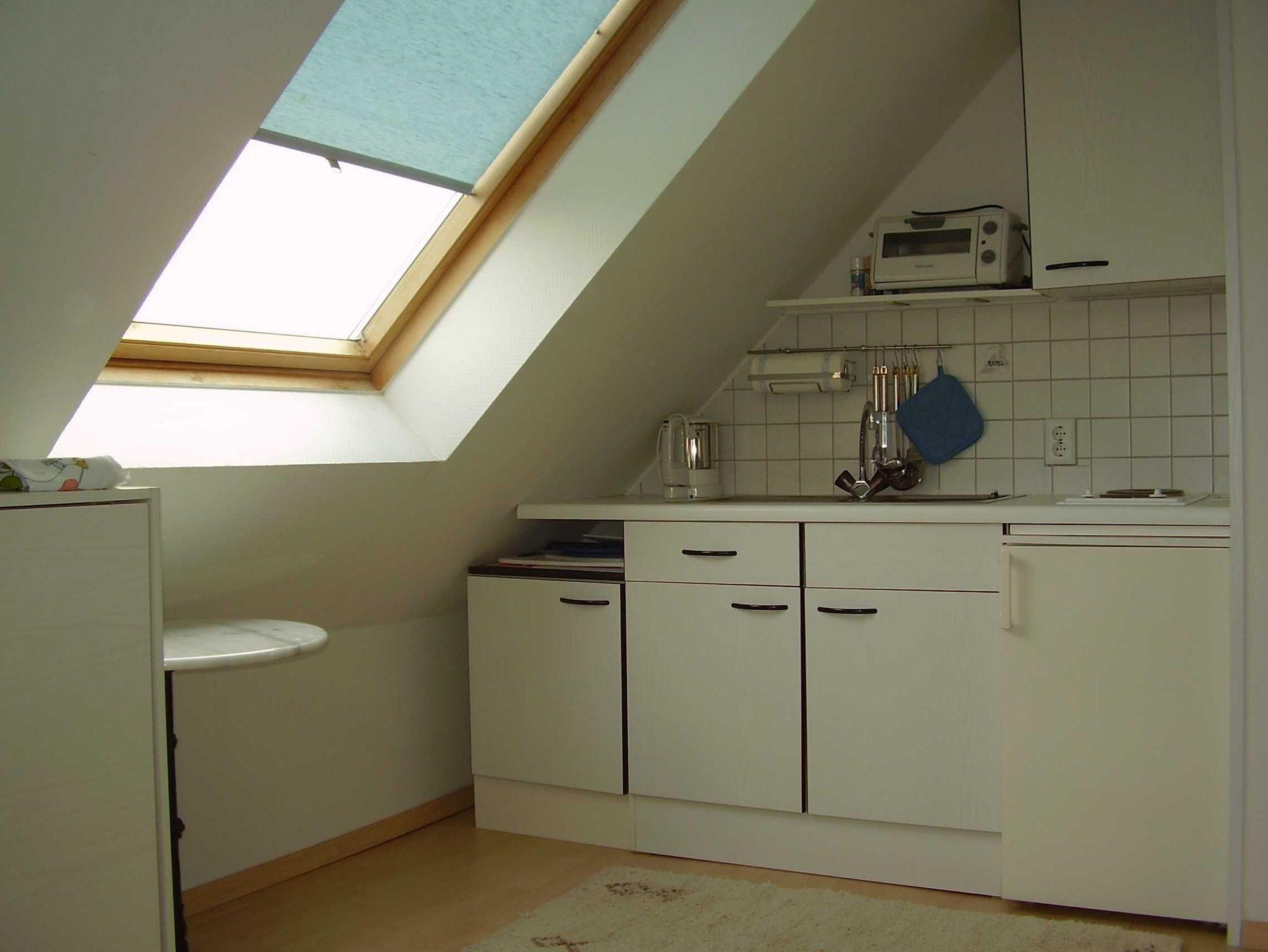 Heller Wohnbereich mit gemütlicher Ausstattung mit Farb-TV. Kleine Küchenzeile mit Kühlschrank, Herd und Mikrowelle. Schlafbereich mit Doppelbett in der Grösse 1,40m x 2,00m, Einbau-Kleiderschrank der auch als optischer Raumteiler dient.