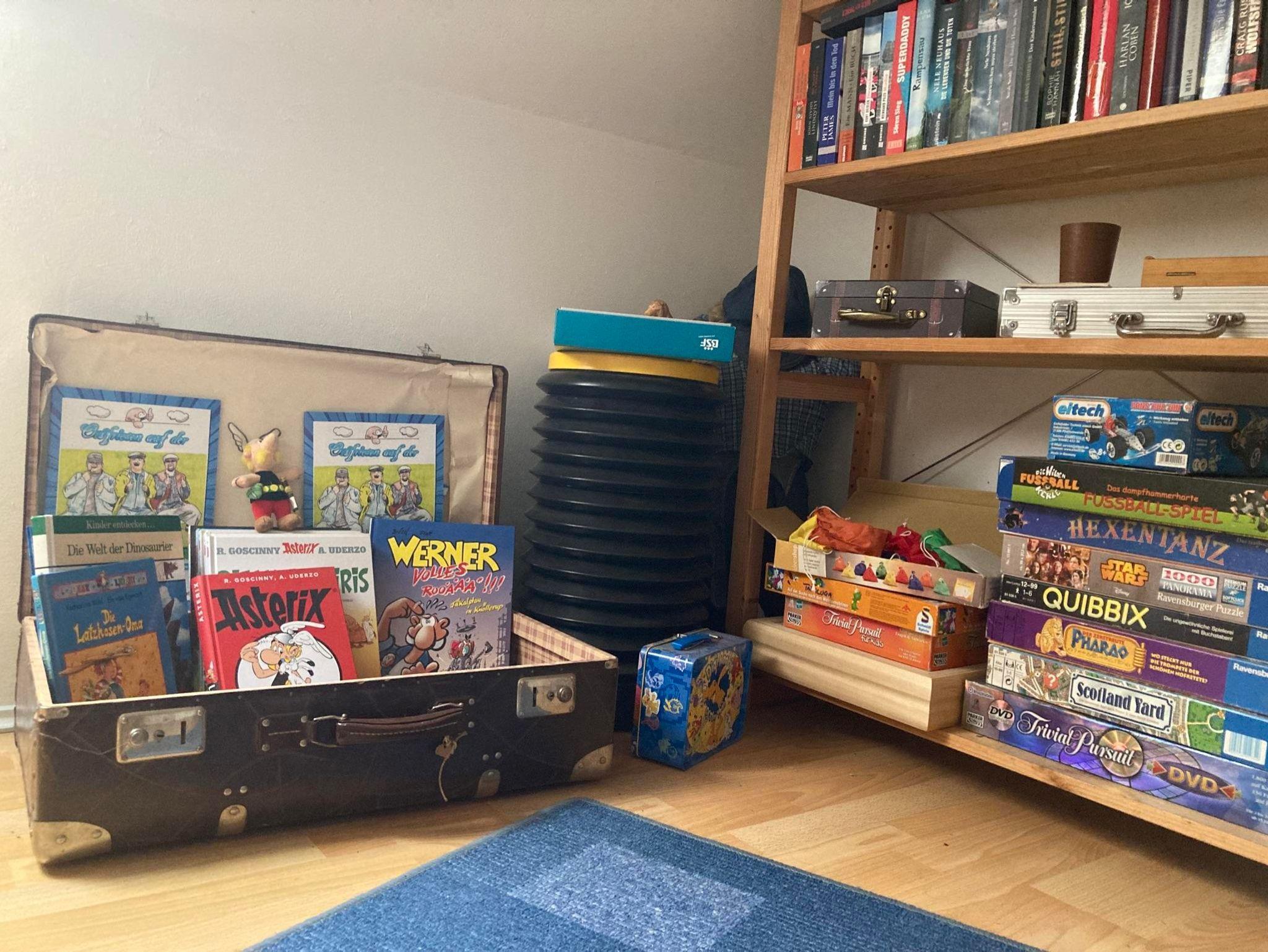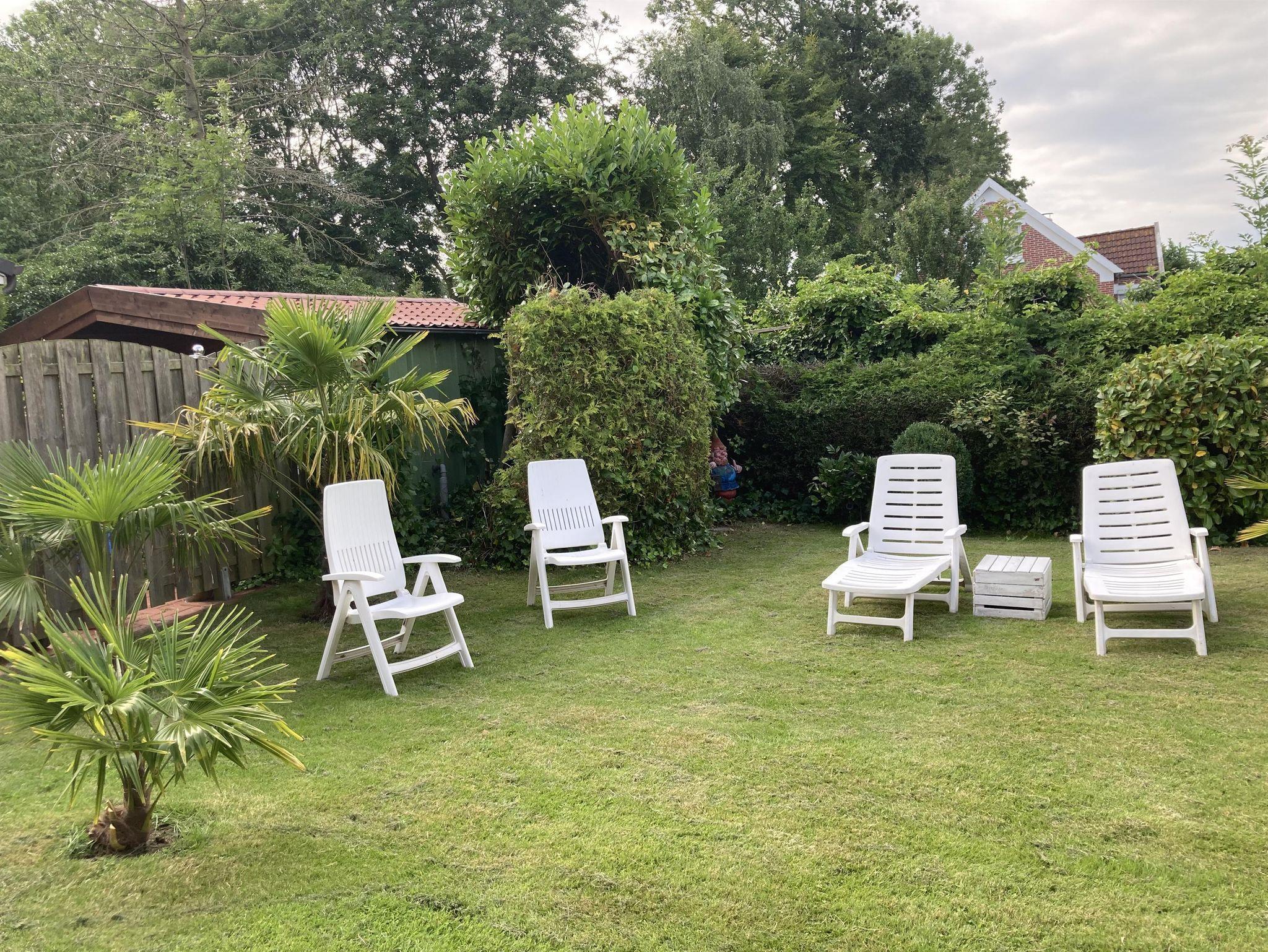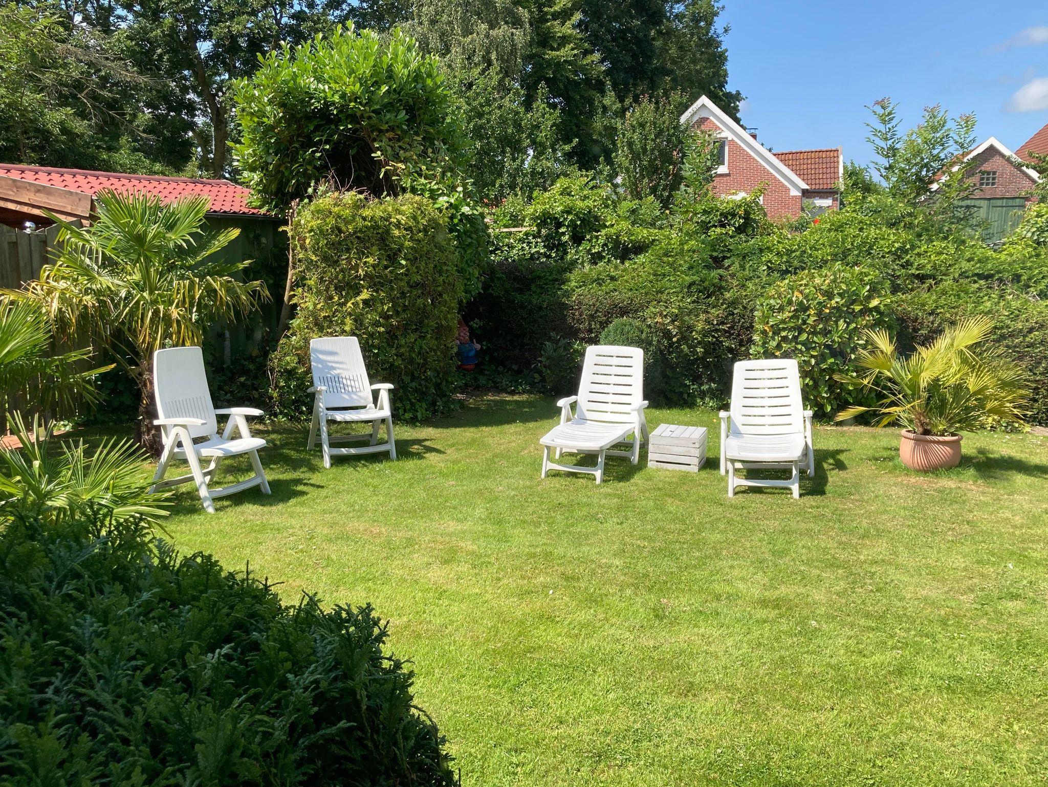 Der eingezäunte Garten mit Spielwiese, Spielgeräten (Tischtennisplatte, E-Dart, Wickingerspiel etc.), Gartenmöbeln, Strandkorb, Grill sowie einer Gemeinschaftshütte (mit Kicker und Musikanlage) darf von allen Feriengästen genutzt werden. Auch ein überdachter Abstellplatz für Ihre Fahrräder, sowie PKW-Parkplätze sind am Haus vorhanden.