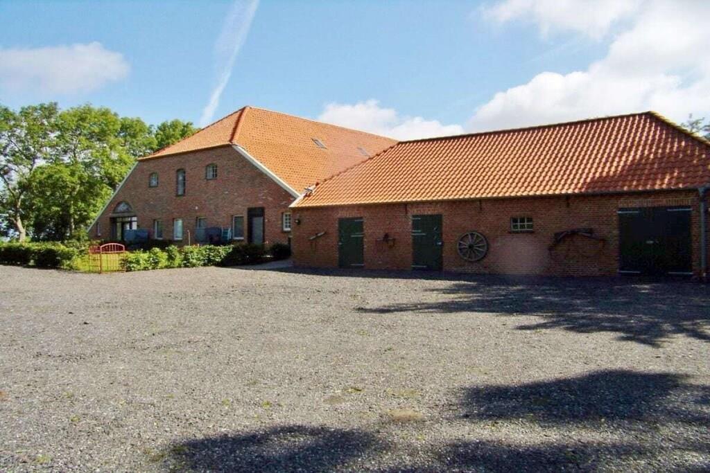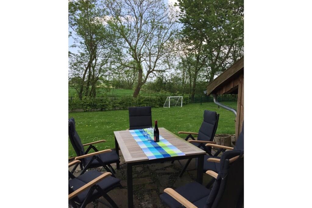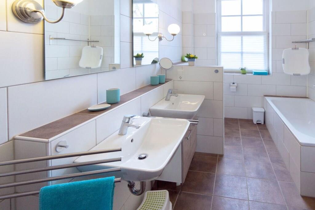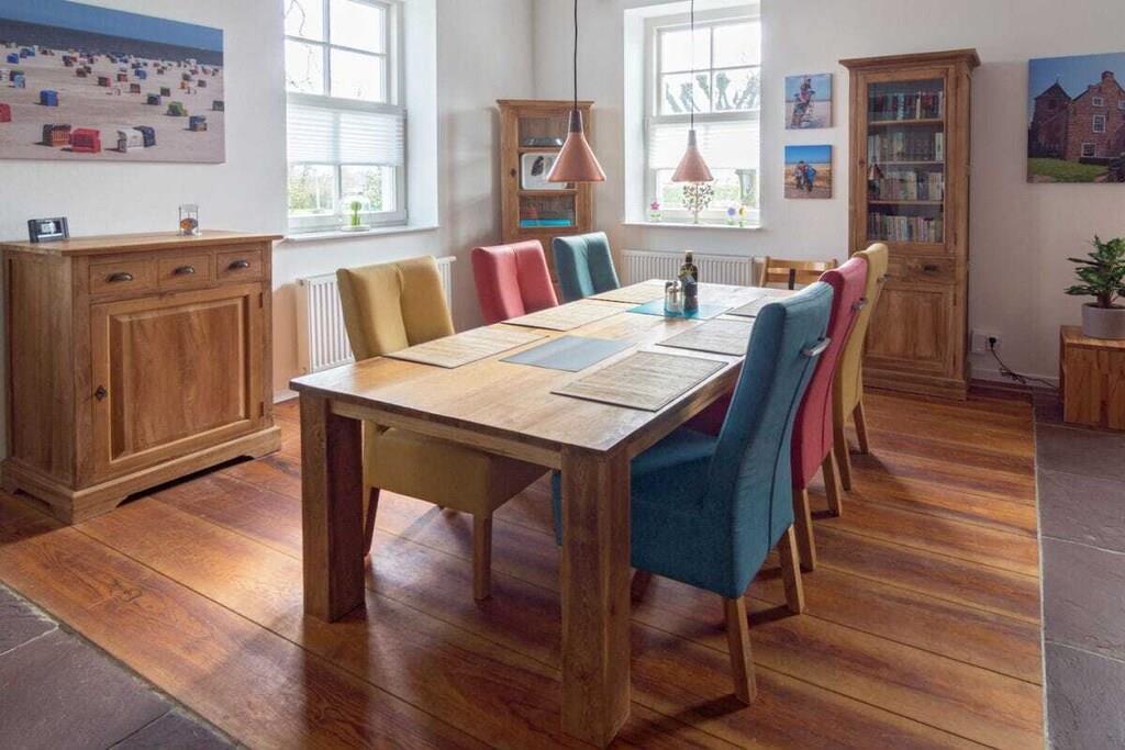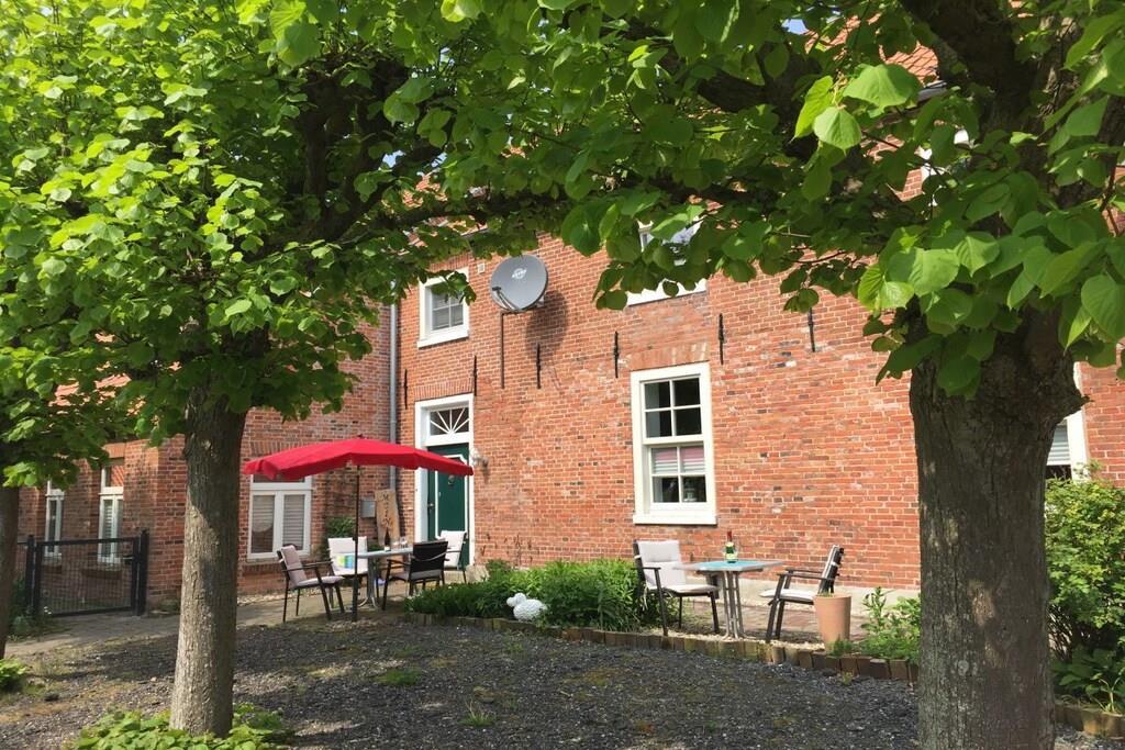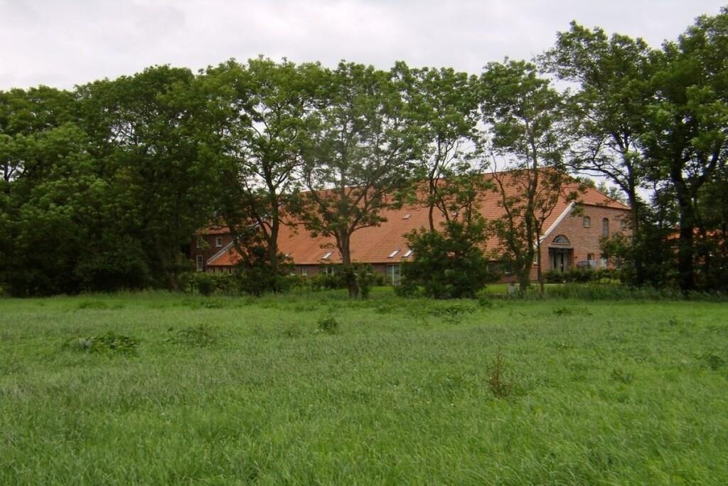 The 138 sqm non-smoking apartment is located on the ground floor of the main building of a listed Gulfhof farm, renovated in 2013, surrounded by a garden and mature trees. It was lovingly prepared for rental in the winter of 2017 and furnished with new antique-style furniture. The apartment consists of: - 3 double bedrooms (2 double beds, 1 twin bed), - a large bathroom with double sinks, separate toilet, and bathtub, - a large walk-in shower, hairdryer, changing table, - a washing machine and dryer, - a fly screen The beds will be freshly made upon your arrival. Wi-Fi is available in all rooms. From the approximately 50 sqm combined living-dining room, two steps (with grab rails) lead to the former "Upkammer" (up chamber), which is now used as an open-plan kitchen in the front part. Here you will find: - Oven - Dishwasher - 4-burner stove - 2 coffee machines (1 Senseo, 1 filter coffee) - Microwave - Toaster, blender, iron - Fridge-freezer - Excellent kitchen equipment The American fridge-freezer in a retro design is a real eye-catcher! At the rear of the upstairs room is a double bedroom, which we have furnished in romantic white with a 180 x 200 cm bed, a mirrored wardrobe, and a TV. Two steps from the hallway lead to the spacious master bedroom with a Hülsta wardrobe and a high-quality 200 x 200 cm double bed, a desk, and a TV. A child's bed can also be set up here with simple handles. The third bedroom offers two single beds measuring 100 x 200 cm. There are ample wardrobes, dressers, and shelves in all rooms. This is a non-smoking apartment. One dog, at least 1 year old, is welcome. Unfortunately, the ground floor apartment is only partially accessible for people with walking difficulties due to the two steps. We have installed grab rails where possible. Fly screens are installed in all rooms. The apartment's outdoor area includes: - a small south-facing terrace with new seating for up to 6 people and a parasol - a 400 sqm fenced garden (1.20 m high, metal fence), also with new seating for everyone - 2 comfortable sun loungers - an 800 sqm, 1.20 m high fenced outdoor area for dogs to romp and play