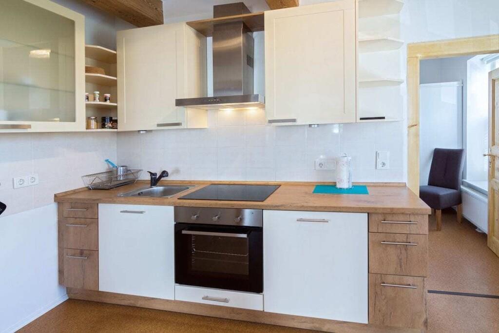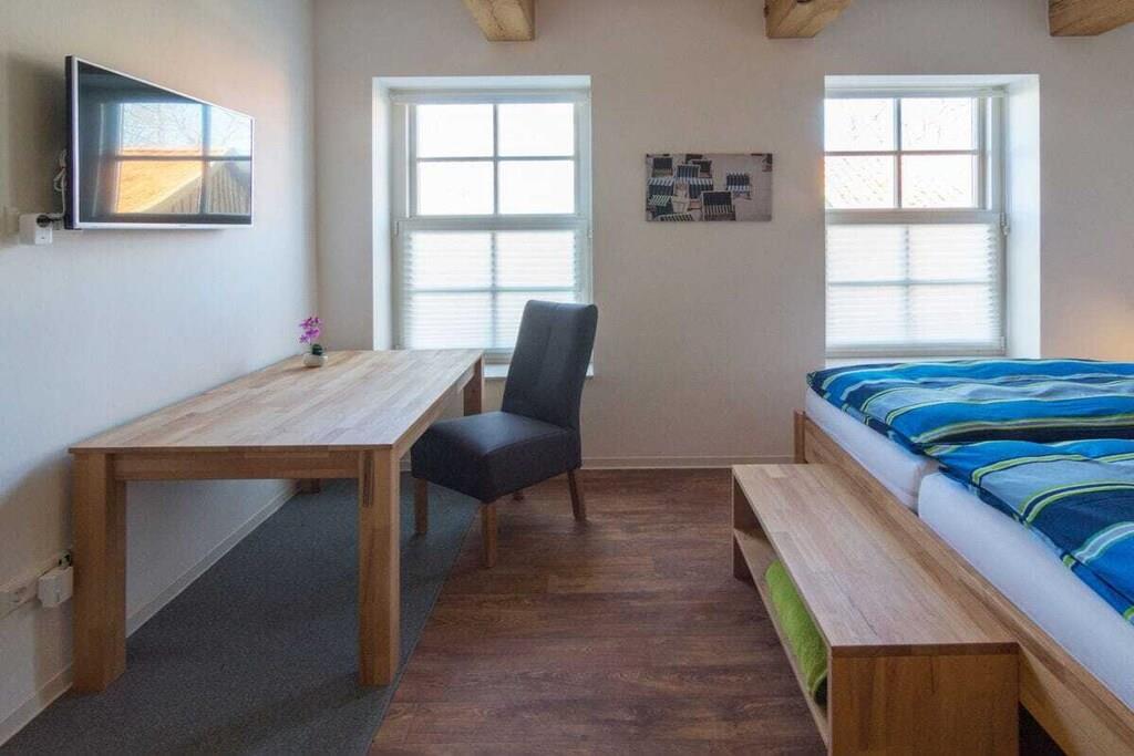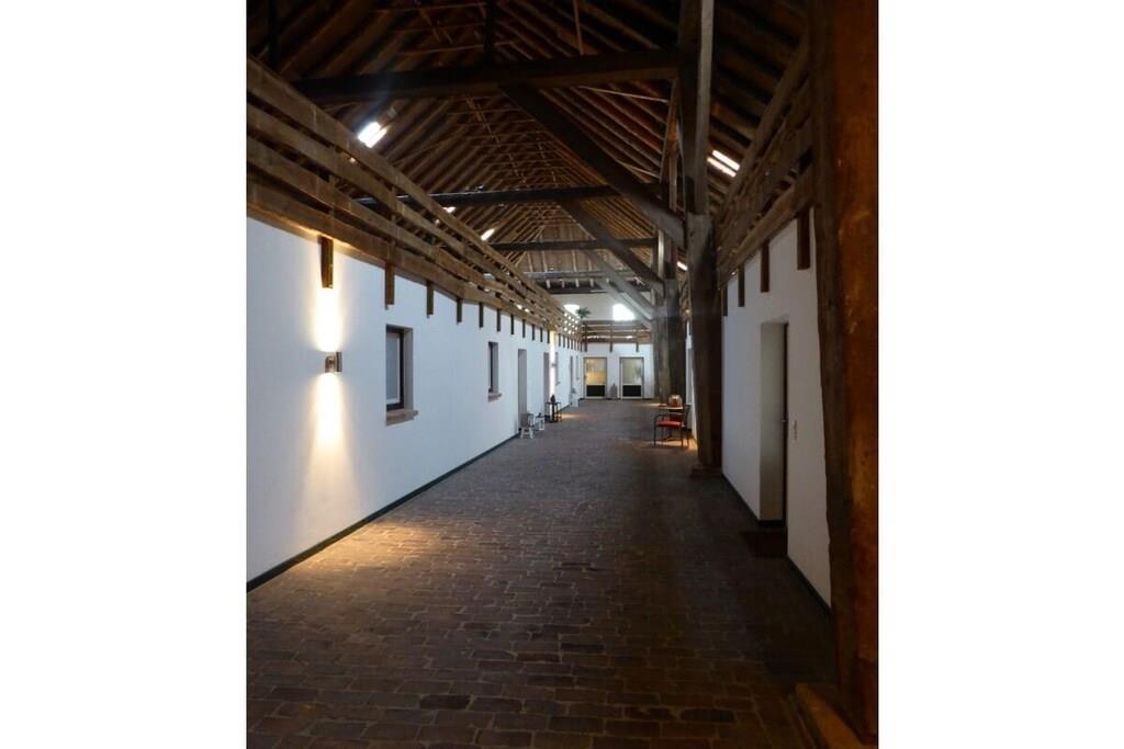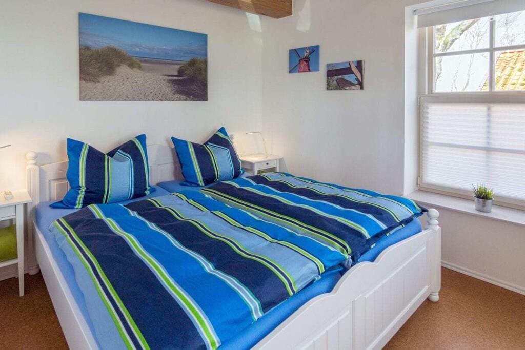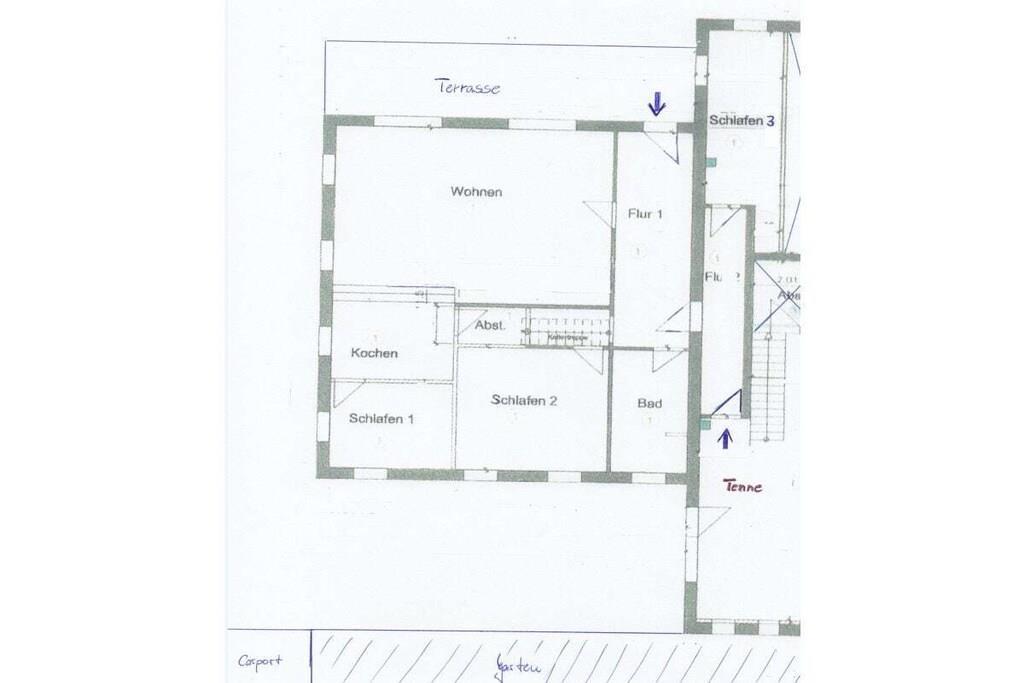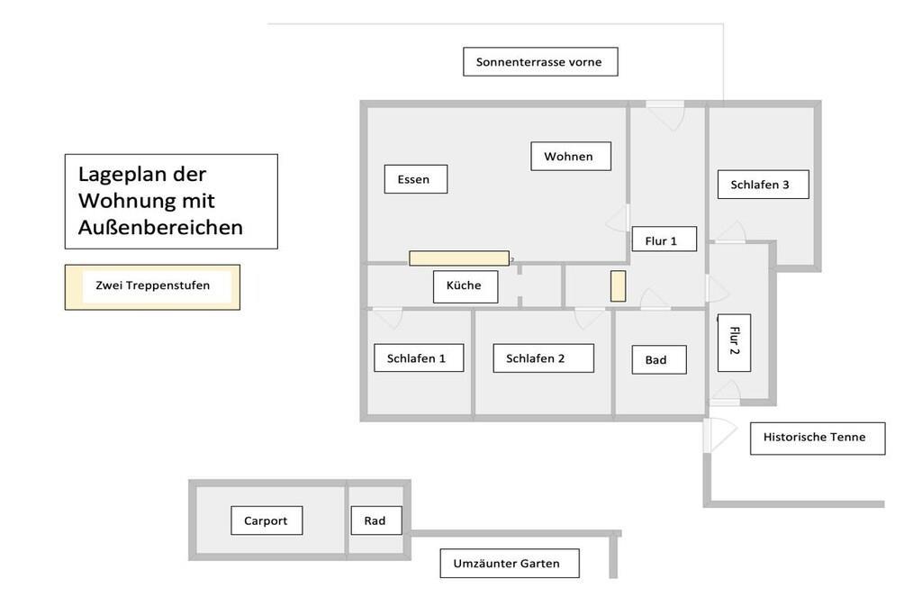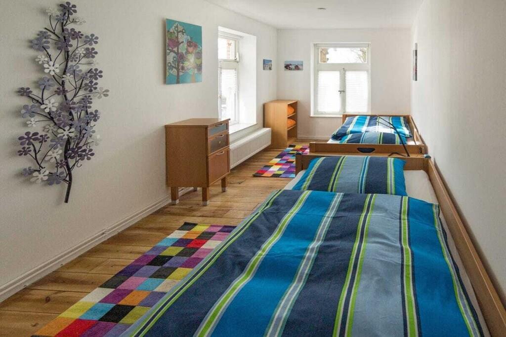 The 138 sqm non-smoking apartment is located on the ground floor of the main building of a listed Gulfhof farm, renovated in 2013, surrounded by a garden and mature trees. It was lovingly prepared for rental in the winter of 2017 and furnished with new antique-style furniture. The apartment consists of: - 3 double bedrooms (2 double beds, 1 twin bed), - a large bathroom with double sinks, separate toilet, and bathtub, - a large walk-in shower, hairdryer, changing table, - a washing machine and dryer, - a fly screen The beds will be freshly made upon your arrival. Wi-Fi is available in all rooms. From the approximately 50 sqm combined living-dining room, two steps (with grab rails) lead to the former "Upkammer" (up chamber), which is now used as an open-plan kitchen in the front part. Here you will find: - Oven - Dishwasher - 4-burner stove - 2 coffee machines (1 Senseo, 1 filter coffee) - Microwave - Toaster, blender, iron - Fridge-freezer - Excellent kitchen equipment The American fridge-freezer in a retro design is a real eye-catcher! At the rear of the upstairs room is a double bedroom, which we have furnished in romantic white with a 180 x 200 cm bed, a mirrored wardrobe, and a TV. Two steps from the hallway lead to the spacious master bedroom with a Hülsta wardrobe and a high-quality 200 x 200 cm double bed, a desk, and a TV. A child's bed can also be set up here with simple handles. The third bedroom offers two single beds measuring 100 x 200 cm. There are ample wardrobes, dressers, and shelves in all rooms. This is a non-smoking apartment. One dog, at least 1 year old, is welcome. Unfortunately, the ground floor apartment is only partially accessible for people with walking difficulties due to the two steps. We have installed grab rails where possible. Fly screens are installed in all rooms. The apartment's outdoor area includes: - a small south-facing terrace with new seating for up to 6 people and a parasol - a 400 sqm fenced garden (1.20 m high, metal fence), also with new seating for everyone - 2 comfortable sun loungers - an 800 sqm, 1.20 m high fenced outdoor area for dogs to romp and play