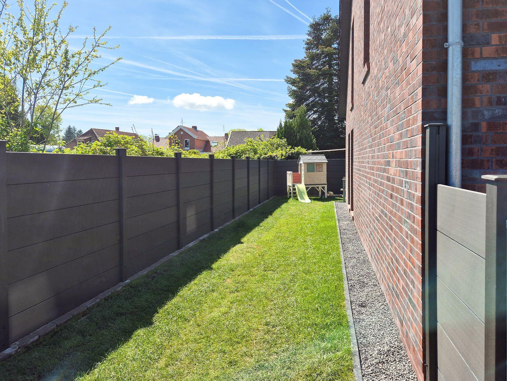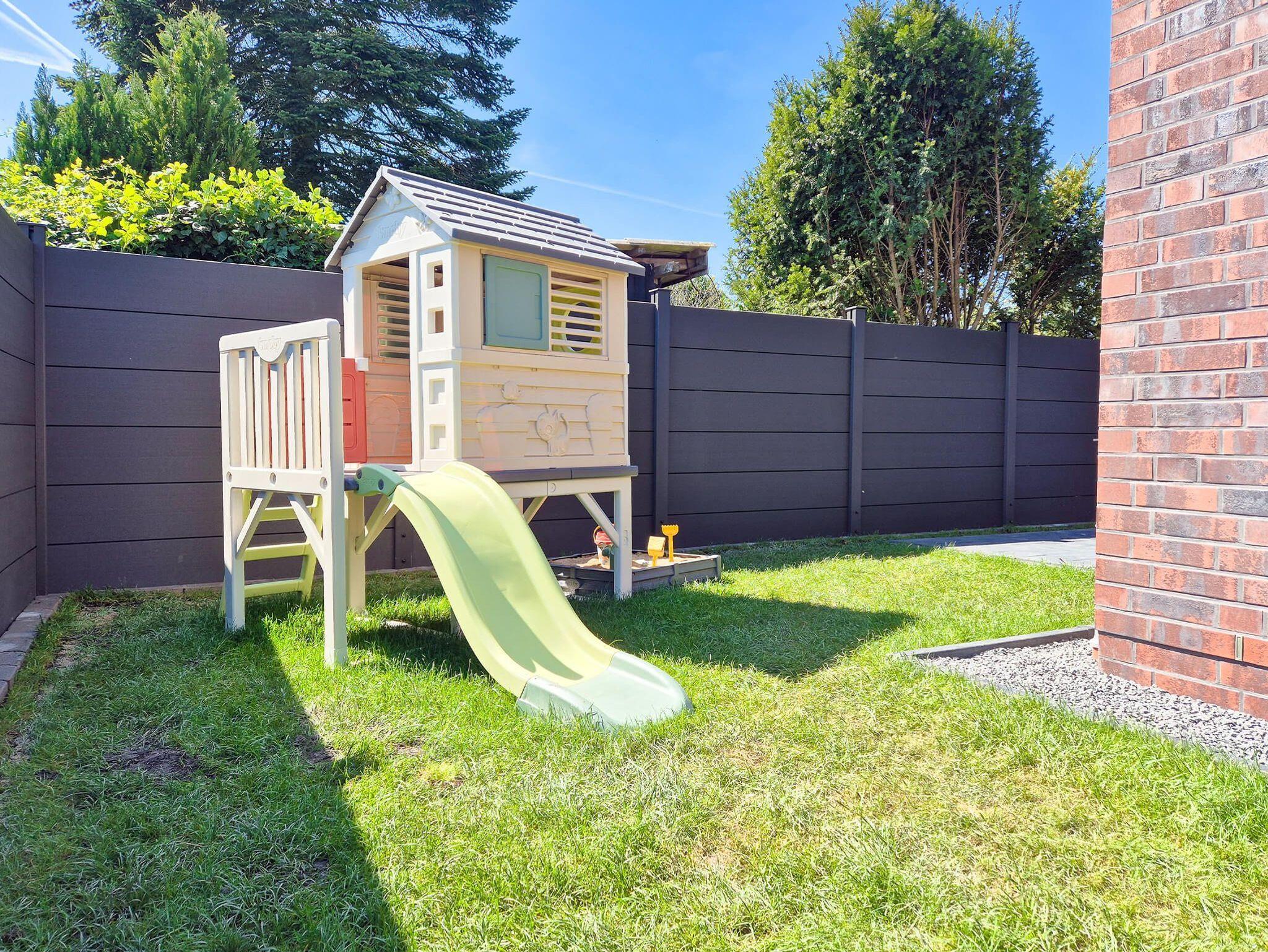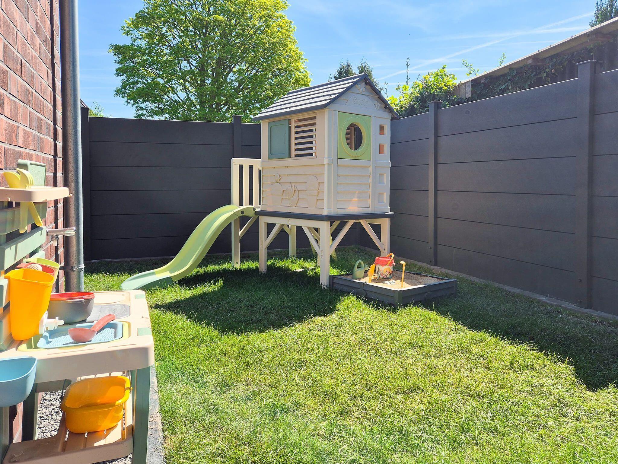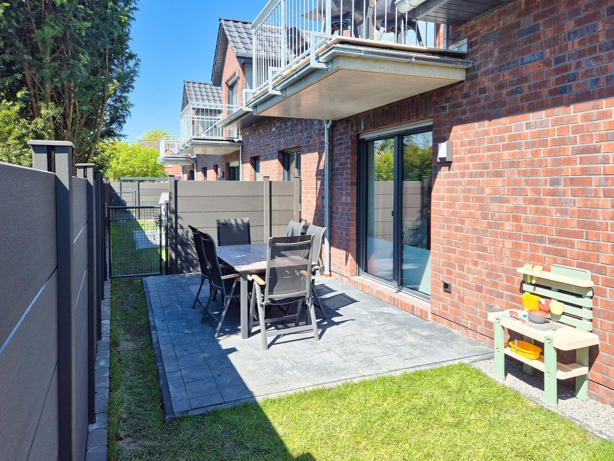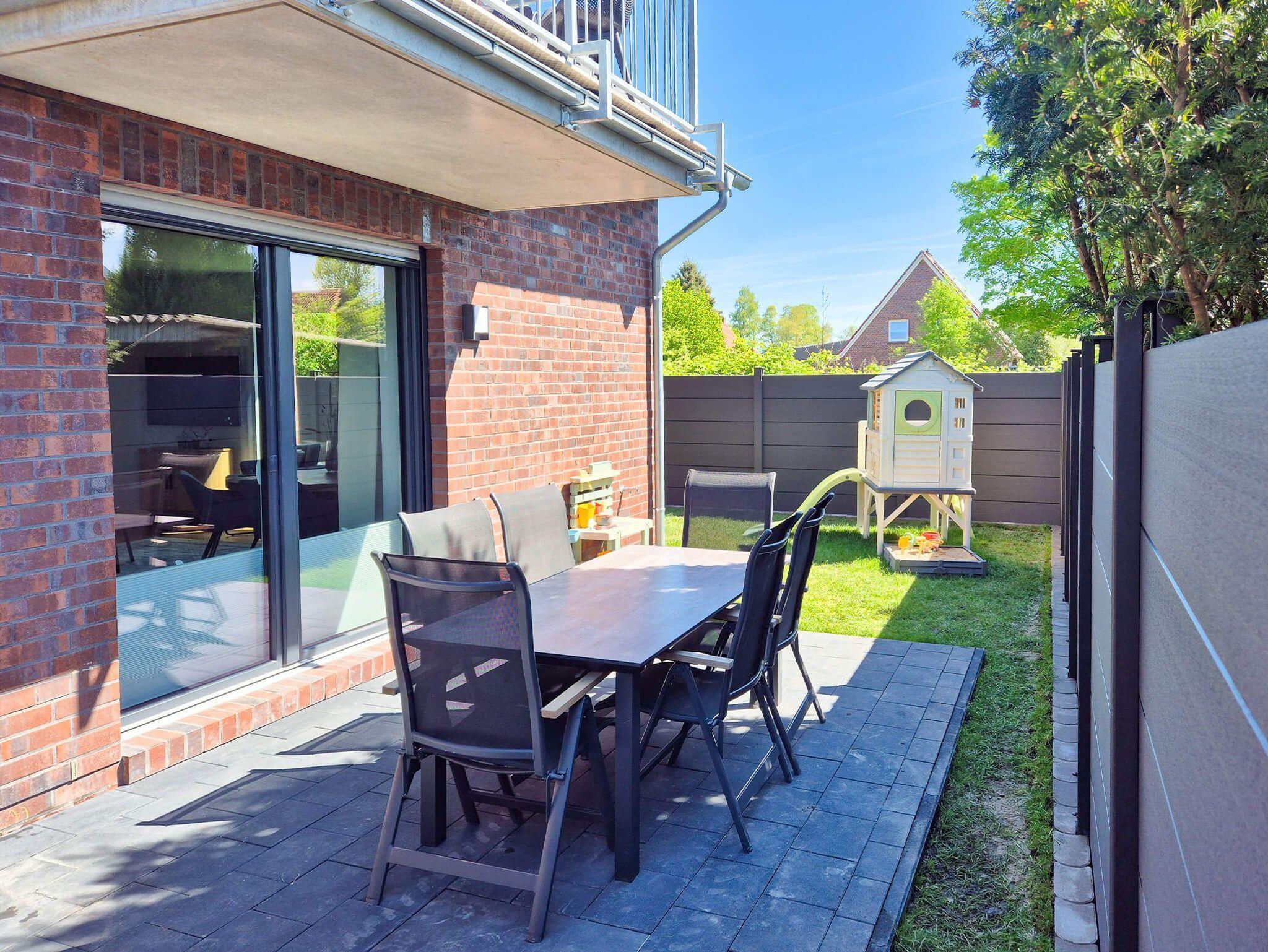 Im eigenen Garten, der komplett eingezäunt ist (Hunde können frei laufen), gibt es einladende Sitzgelegenheiten und Einrichtungen für die Kinder.