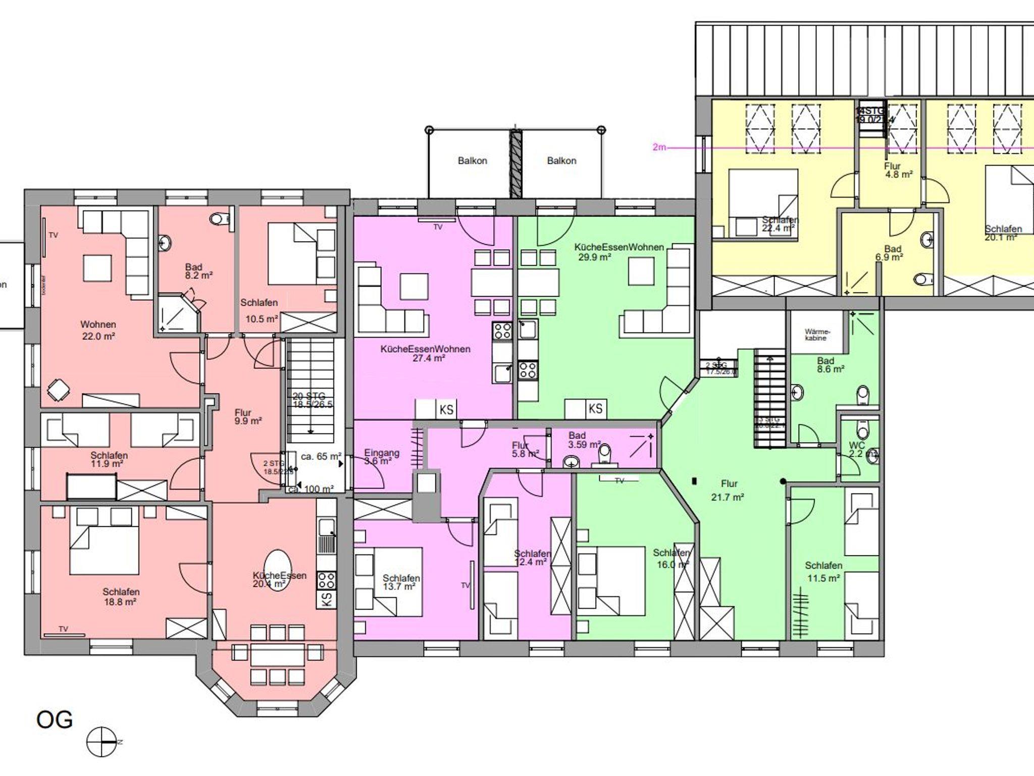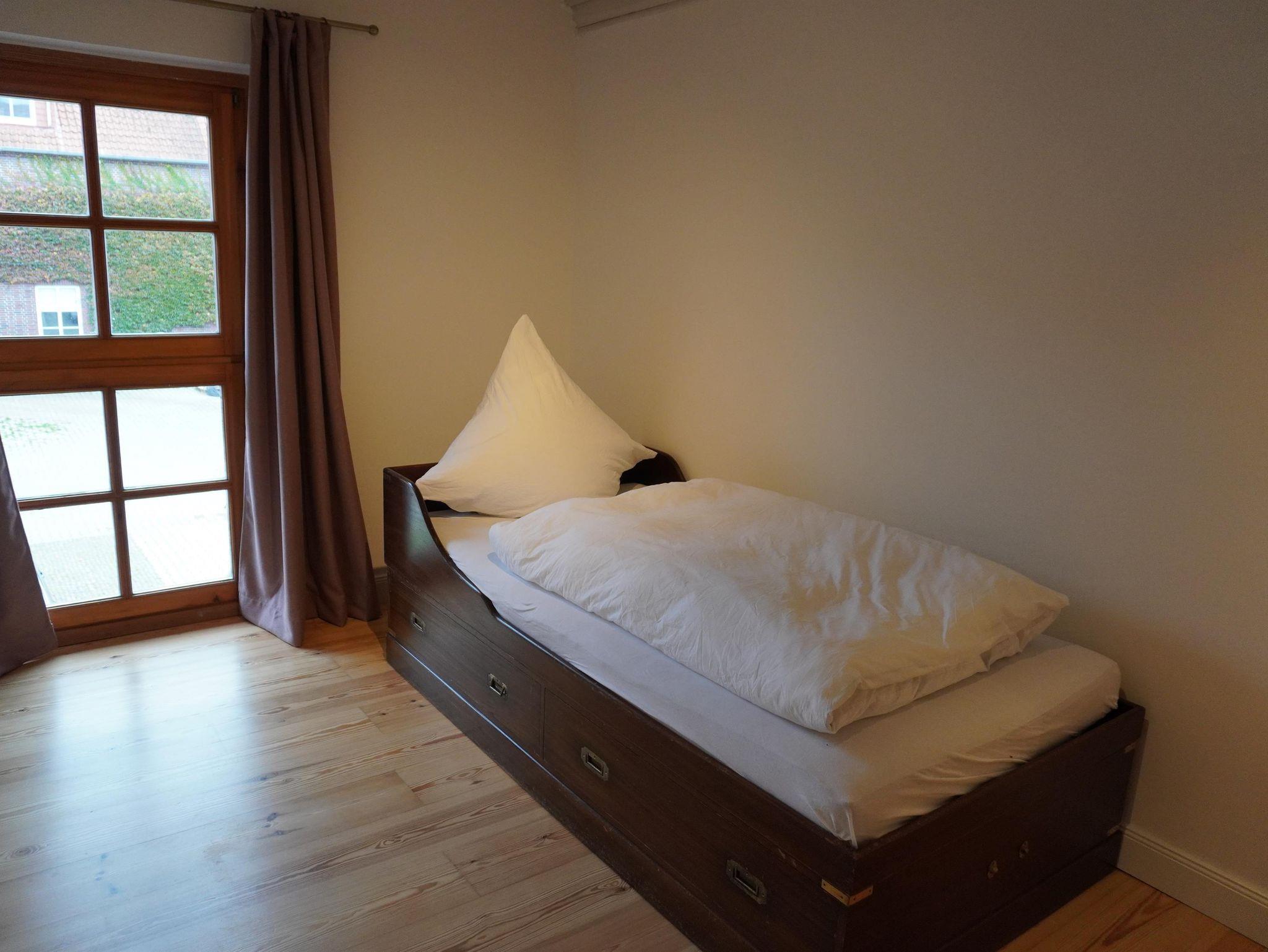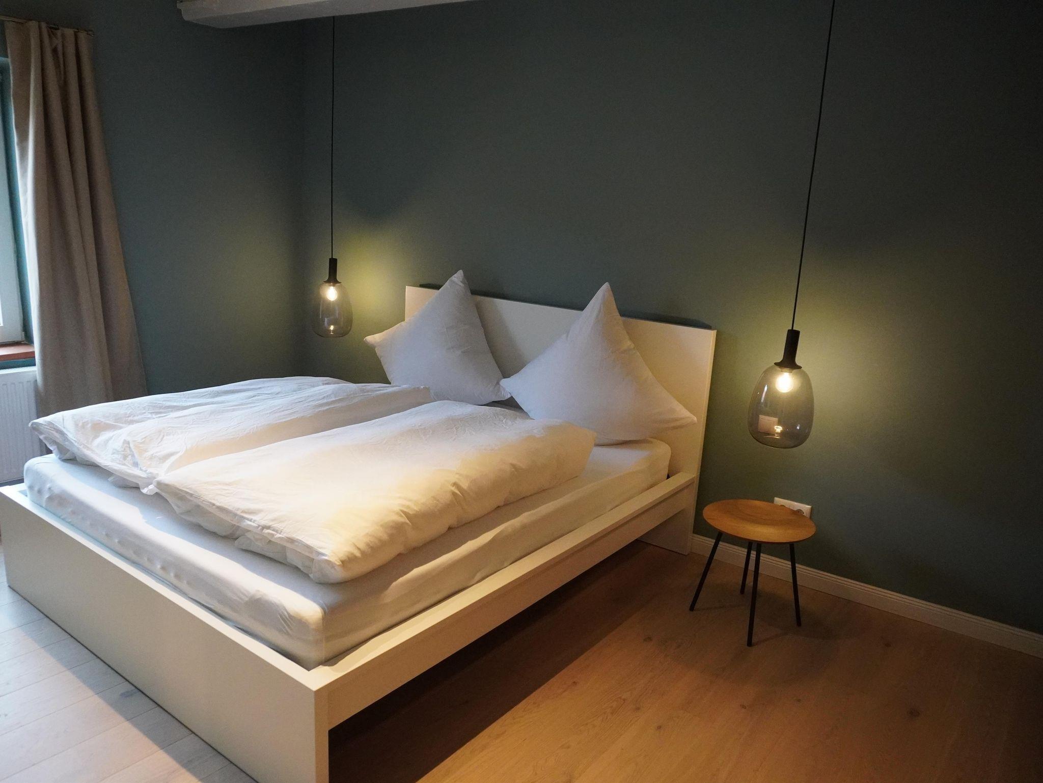 Mädchenzimmer: Das Mädchenzimmer ist eine 65m² große Oberwohnung in der histroische Elemente mit modernen kombiniert wurden. Der Ess- und Wohnbereich beinhaltet eine vollausgestattete Küche, ein Esstisch für vier Personen, eine gemütliche Couch und ein Sat-TV. Ein großes Doppelzimmer und ein Zweibettzimmer dienen als Schlafmöglichkeit. Das Badezimmer ist mit einem WC und einer Dusche ausgestattet. Der Balkon ist nach Südwest ausgerichtet.