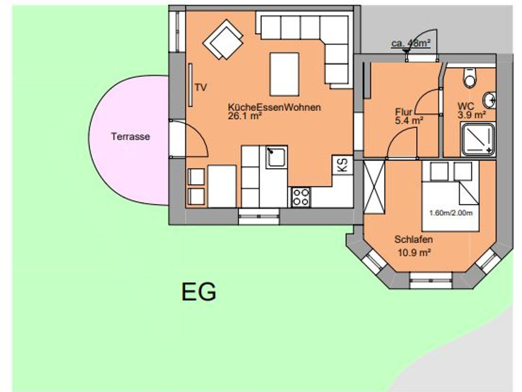 Omas Küche: Die 48m² große Erdgeschosswohnung war früher ein zentraler Punkt für die ganze Familie. Der große Wohn- und Essbereich ist mit einer vollausgestatteten Küche, ein Essbereich, einer großen Schlafcouch, ein gemütlichen Sessel und Sat-TV ausgestattet. Als Schlafmöglichkeit dient ein Doppelzimmer und die Schlafcouch. Das Badezimmer ist mit einem WC und einer Dusche ausgestattet. Die Terrasse ist nach Südwest ausgerichtet.