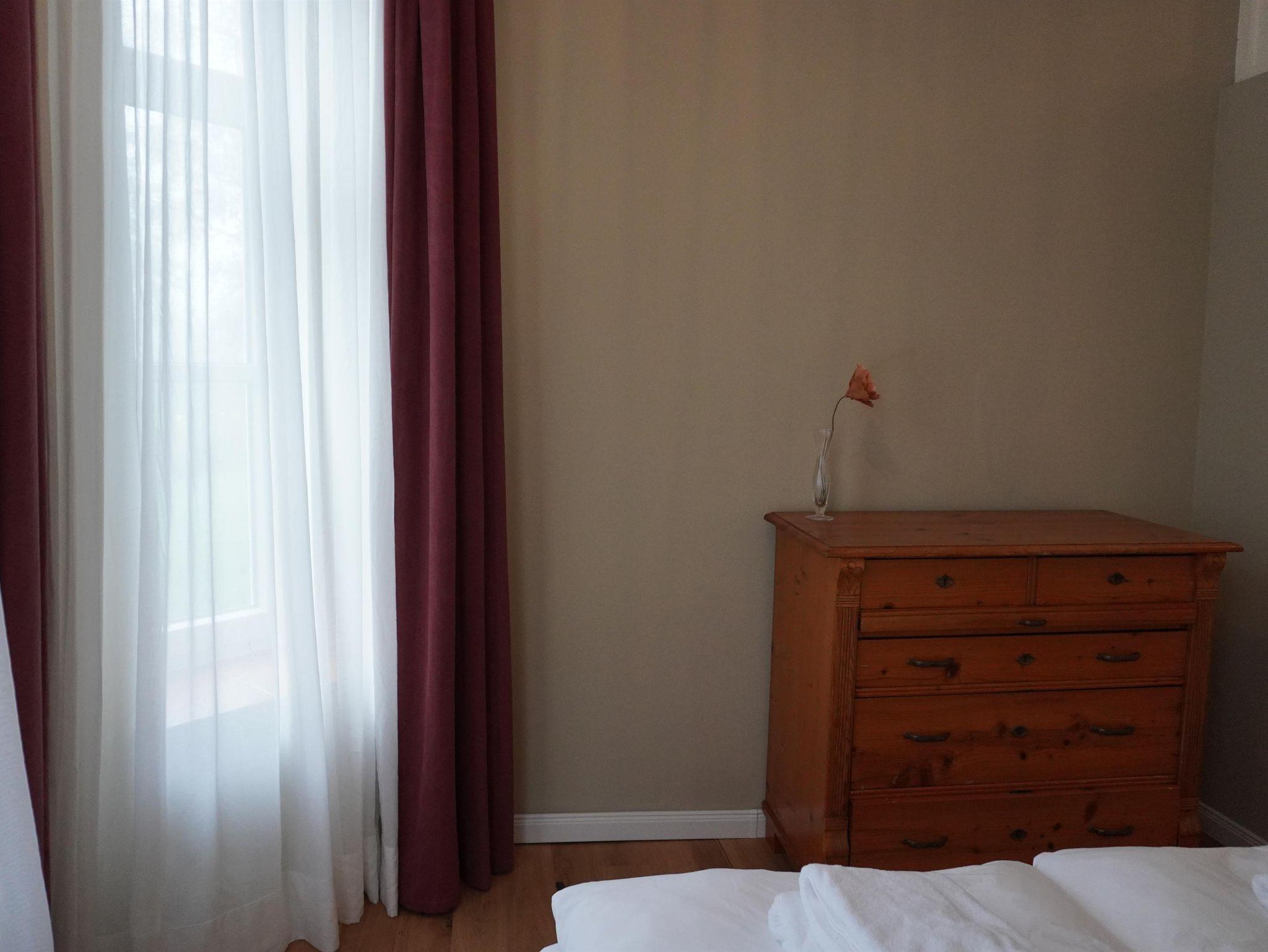 Mädchenzimmer: Das Mädchenzimmer ist eine 65m² große Oberwohnung in der histroische Elemente mit modernen kombiniert wurden. Der Ess- und Wohnbereich beinhaltet eine vollausgestattete Küche, ein Esstisch für vier Personen, eine gemütliche Couch und ein Sat-TV. Ein großes Doppelzimmer und ein Zweibettzimmer dienen als Schlafmöglichkeit. Das Badezimmer ist mit einem WC und einer Dusche ausgestattet. Der Balkon ist nach Südwest ausgerichtet.